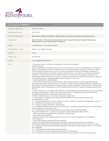 Numer ogłoszenia: 13026174 A RCHI WA L N E Kategoria ogłoszenia: przetarg - Polska Data dodania oferty: 2017-01-25 Przedmiot ogłoszenia: Wariantowe studium analityczne efektywności ekonomicznej składów wielofunkcyjnych Organizator: Skarb Państwa - Państwowe Gospodarstwo Leśne Lasy Państwowe Ośrodek RozwojowoWdrożeniowy Lasów Państwowych w Bedoniu Adres: ul. Sienkiewicza 19, 95-020 Andrespol Województwo / powiat: łódzkie, pow. łódzki wschodni Państwo: Polska Telefon / fax: 695 359 260 E-mail: Opis: [email protected] ,,Wariantowe studium analityczne efektywności ekonomicznej składów wielofunkcyjnych" wraz ze wskazaniem ekspertów wyznaczonych do opracowania studium i przedstawienia ich biogramów. Niniejsze zaproszenie do złożenia oferty cenowej nie stanowi elementu procedury opisanej w ustawie Prawo zamówień publicznych, ani nie ma na celu oszacowania wartości zamówienia, służącego do wszczęcia takiej procedury. Niniejsze zapytanie ofertowe służy rozeznaniu cen rynkowych przedmiotu zapytania i nie jest zaproszeniem do złożenia oferty w rozumieniu art. 66 Kodeksu cywilnego i nie zobowiązuje nadawcy do zawarcia umowy. Po dokonaniu rozeznania i podjęcia decyzji przez nadawcę o woli zawarcia umowy, nadawca podejmie osobne czynności w tym celu. I. OPIS PRZEDMIOTU ZAMÓWIENIA 1. Przedmiotem zamówienia jest opracowane ,,Wariantowego studium analitycznego efektywności ekonomicznej składów wielofunkcyjnych" do projektu ,,Drewno dla samowystarczalności energetycznej samorządów oraz bezpieczeństwa energetycznego państwa" zgodnego z Zarządzeniem nr 46 Dyrektora Generalnego Lasów Państwowych z dnia 24 października 2016 roku w sprawie sprzedaży drewna przez PGL LP. 2. Celem studium jest w szczególności ustalenie ceny jednostkowej sprzedaży biomasy leśnej, przy której realizacja przedsięwzięcia ,,Drewno dla samowystarczalności energetycznej oraz bezpieczeństwa energetycznego państwa" będzie efektywna ekonomicznie. 3. Studium zawierać musi, co najmniej, następujące zagadnienia: 3.1. Opracowanie wariantowej metodologii liczenia efektywności ekonomicznej i finansowej przedsięwzięcia, a w tym: 3.1.1. Sposób identyfikacji i liczenia nakładów, kosztów i korzyści z realizacji przedsięwzięcia przez LP; 3.1.2. Efektywność ekonomiczną i finansową; 3.1.3. Koszty i korzyści policzalne i niepoliczalne; 3.1.4. Określenie efektywności ekonomicznej możliwych wariantów przetwarzania biomasy leśnej (zrębki, pellet, bioalkohol, gaz pirolityczny itp.); 3.1.5. Zastosowanie rachunku dyskontowego, prolongacyjnego i kapitalizacyjnego. Przy ocenie efektywności , o której mowa powyżej, należy uwzględnić między innymi : - nakłady poniesione na założenie sieci składów w funkcji czasu, - okres użytkowania składów, - całkowite roczne koszty działań o których mowa w par. 72 pkt 3 Zarządzenia nr 46 Dyrektora Generalnego LP, - roczną ilość biomasy przewidywaną do sprzedaży, - wartość akumulacji węgla organicznego, zawartego w drewnie zgromadzonym na składach. Pełna ocena efektywności przedsięwzięcia wymaga zastosowania metody analizy kosztów i korzyści. 3.2. Prezentacja proponowanej metodyki odpowiednim jednostkom organizacyjnym PGL LP (co najmniej dwa spotkania); 3.2.1. Zatwierdzenie metodyki przez zleceniodawcę; 3.2.2. Wyliczenie wariantów efektywności ekonomicznej i finansowej; 3.2.3. Prezentacja wyników odpowiednim jednostkom organizacyjnym PGL LP (co najmniej dwa spotkania). 4. Wykonawca realizując zlecenie przedstawi zleceniodawcy: 4.1. Wstępny raport zawierający propozycję metodyki liczenia efektywności ekonomicznej i finansowej; 4.2. Końcowy raport metodyczny po odbyciu konsultacji z zamawiającym i uzyskaniu jego akceptacji dla proponowanej metodyki; 4.3. Wstępny raport końcowy zawierający wyliczenie wariantów efektywności ekonomicznej i finansowej; 4.4. Raport końcowy po prezentacji i odbyciu konsultacji z zamawiającym. Miejsce i termin składania ofert: MIEJSCE ORAZ TERMIN SKŁADANIA OFERT Oferty prosimy składać w formie skanu na adres: [email protected] W temacie maila proszę napisać oferta na studium: ,,Wariantowe studium analityczne efektywności ekonomicznej składów wielofunkcyjnych" - BE. Termin składania ofert upływa 31.01.2017 r. o godz. 14:30 Oferty, które wpłyną po terminie nie będą rozpatrywane. Termin składania: 2017-01-31 Miejsce i termin realizacji: TERMIN WYKONANIA ZAMÓWIENIA: Od daty podpisania umowy do 10.03.2017 Wymagania: OPIS SPOSOBU SKŁADANIA OFERT Ofertę należy: - złożyć na formularzu ofertowym - załącznik nr 1 do zapytania ofertowego, - opatrzyć pieczątką firmową lub wpisać siedzibę oferenta, adres, numer telefonu, numer NIP, - podpisać czytelnie przez osobę upoważnioną do reprezentowania firmy, - Wykonawca poda cenę w PLN z dokładnością do dwóch miejsc po przecinku, - podana cena musi zawierać wszystkie koszty związane z realizacją zamówienia, - oświadczenie, że zamówienie będzie wykonane zgodnie z założeniami Zamawiającego, określonymi w zapytaniu ofertowym, - oświadczenie, że Wykonawca zapoznał się z treścią ogłoszenia i formularza ofertowego i w pełni je akceptuje. TERMIN ZWIĄZANIA OFERTĄ Wykonawca pozostaje związany ofertą przez okres 30 dni, przy czym bieg terminu związania ofertą rozpoczyna się wraz z upływem terminu składania ofert. Po wyborze oferty zostanie podpisana stosowna umowa. SPOSÓB WYBORU OFERTY Po otrzymaniu ofert Zamawiający wybierze najbardziej korzystną ofertę według następujących kryteriów: 1. Kompetencje oferenta odnośnie zagadnień ekonomicznych w tym zastosowania metody AKK 0-3 pkt. 2. Kompetencje oferenta odnośnie gospodarki leśnej 0-3 pkt. 3. Cena ofertowa 0-4 pkt. Za ofertę najkorzystniejszą uznana zostanie oferta, która otrzyma największą liczbę punktów. Kontakt: OSOBA DO KONTAKTU: Osobą do kontaktu w sprawie przedmiotu zamówienia jest: Jacek Jancel