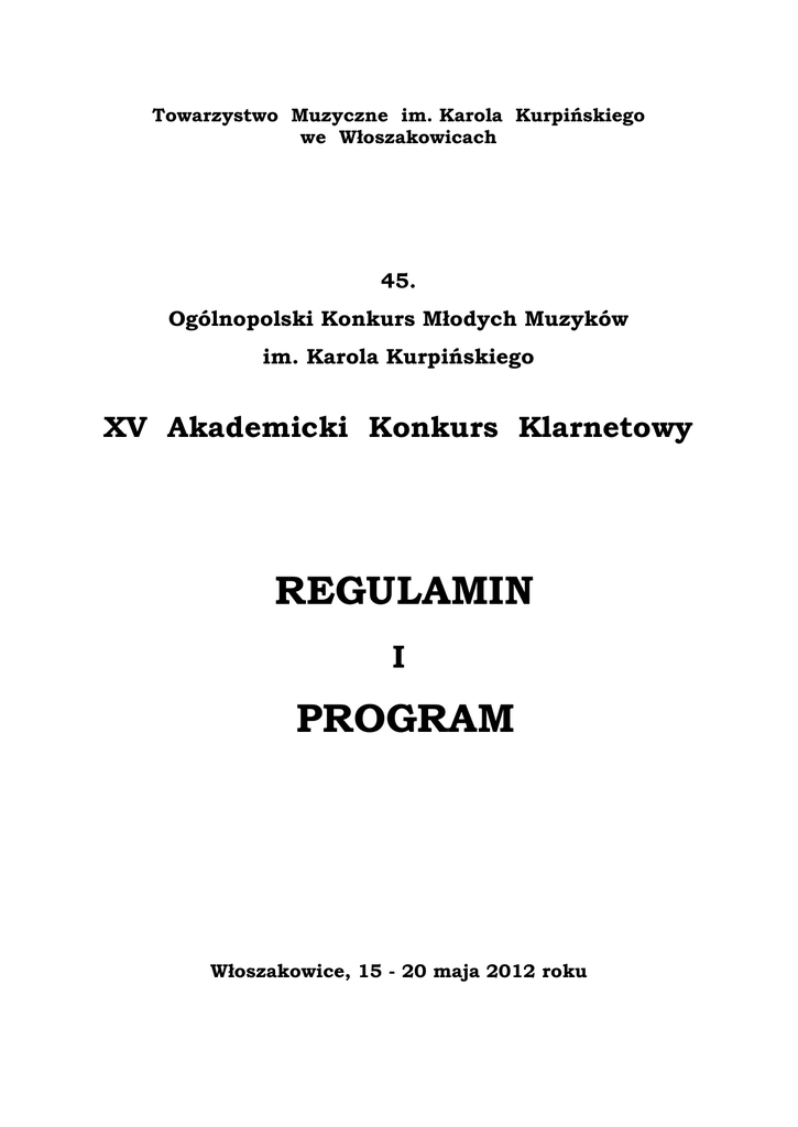 Towarzystwo Muzyczne im. Karola Kurpińskiego we Włoszakowicach 45. Ogólnopolski Konkurs Młodych Muzyków im. Karola Kurpińskiego XV Akademicki Konkurs Klarnetowy REGULAMIN I PROGRAM Włoszakowice, 15 - 20 maja 2012 roku XV Akademicki Konkurs Klarnetowy Karol Kurpiński (1785 – 1857) Organizatorzy Towarzystwo Muzyczne im. Karola Kurpińskiego we Włoszakowicach Gminny Ośrodek Kultury we Włoszakowicach Konsultacja Katedra Instrumentów Dętych i Akordeonu Akademii Muzycznej im. Ignacego J. Paderewskiego w Poznaniu Patronat Minister Kultury i Dziedzictwa Narodowego Rzeczypospolitej Polskiej Marszałek Województwa Wielkopolskiego Stanisław Waligóra Prezes Towarzystwa Muzycznego im. Karola Kurpińskiego we Włoszakowicach Szanowni Państwo, Towarzystwo Muzyczne im. Karola Kurpińskiego we Włoszakowicach ma zaszczyt zaprosić do wzięcia udziału w podwójnie jubileuszowym 45. Ogólnopolskim Konkursie Młodych Muzyków im. Karola Kurpińskiego XV Akademickim Konkursie Klarnetowym. Konkursy klarnetowe im. Karola Kurpińskiego nadzieję, że zasłużenie – sławą najbardziej cieszą się – mamy prestiżowych spośród włoszakowickich konkursów muzycznych, które w miejscu urodzin twórcy Koncertu na klarnet B – dur odbywają się od 1968 r. i ongiś znane były pod nazwą Konkursu Młodych Instrumentalistów. Jako organizatorów i mieszkańców gminy Włoszakowice szczególną radością napawa nas fakt, że na pięknej wielkopolskiej ziemi możemy gościć kolejne pokolenia młodych klarnecistów polskich, którym jakże często towarzyszą niegdysiejsi uczestnicy naszych konkursów - dziś wykładowcy i profesorowie akademii muzycznych. Zapewniam, że dołożymy wszelkich starań, aby przyszłoroczny Konkurs był co najmniej równie udany jak poprzednie. Mam nadzieję, że dane mi będzie osobiście poznać Państwa w czasie konkursowych zmagań, oby jak najbardziej szczęśliwych dla Państwa. Tak wiec do zobaczenia w maju ! Regulamin i program Konkursu §1 Konkurs odbędzie się w dniach 15 –20 maja 2012 r. we Włoszakowicach. §2 W Konkursie mogą brać udział wyłącznie studenci polskich akademii muzycznych oraz filii polskich akademii muzycznych. §3 Konkurs jest trzyetapowy. Program Konkursu I etap 1. K. Kurpiński - Koncert B-dur z fortepianem (z pamięci) 2. C. Debussy - Première Rhapsodie z fortepianem (z pamięci) II etap 1. Ch. M. Widor - Introdukcja at Rondo z fortepianem (z pamięci) 2. Do wyboru jeden z sześciu utworów na klarnet solo: I. Strawiński - Trzy utwory H. Sutermeister - Capriccio H. Tomasi - Sonatine attique O. Messiaen - Abime des oiseaux B. Kovačs - Hommage à A. Chaczaturian M. Chyrzyński - Quasi Kwazi III 3. Do wyboru jeden z sześciu utworów na klarnet solo: E. Denisov - Sonata (1972) V. Bucci - Concerto (1969) T. Olah - Sonata (1963) J. Rivier - Les trios <<S>> D. Martino - A set for Clarinet K. Stockhausen - In Freundschaft III etap W. A. Mozart - Koncert A-dur KV 622 na klarnet i orkiestrę (z pamięci) §4 Uczelniom przysługuje prawo do zgłoszenia 3 studentów - klarnecistów, zaś filiom uczelni – 2. §5 Koszty uczestnictwa w Konkursie w wysokości 500 zł dla uczestników i 500 zł dla akompaniatorów należy przekazać na podane niżej konto Towarzystwa Muzycznego im. Karola Kurpińskiego w terminie do 31.03.2012 r. BS Włoszakowice 86866100090000322920000001 Kartę zgłoszenia według załączonego wzoru i zdjęcie należy przesłać pocztą tradycyjną lub elektroniczną na adres: Towarzystwo Muzyczne im. Karola Kurpińskiego ul. Karola Kurpińskiego 29 64 – 140 Włoszakowice tel. (65) 52 52 962, 52 52 966 e-mail: [email protected] Organizator zapewnia uczestnikom i akompaniatorom w okresie trwania Konkursu po okazaniu dowodu wpłaty w dniu przyjazdu: * noclegi, * całodzienne wyżywienie w miejscu Konkursu (od kolacji we wtorek 15 maja do kolacji w niedzielę 20 maja), * miejsce do prób, * dowóz na miejsce noclegu. Po dokonaniu wpłaty w przypadku rezygnacji z udziału w Konkursie organizator nie zwraca pieniędzy. Przesłuchania i koncerty odbędą się w Sali Trójkątnej Pałacu Sułkowskich we Włoszakowicach. §6 O przyjęciu na listę Konkursu uczestnicy i akompaniatorzy zostaną powiadomieni do dnia 20.04.2012 r. §7 Kolejność występów zostanie ustalona w drodze losowania (począwszy od wylosowanej litery). Uczestnicy zostaną powiadomieni o niej wraz z informacją o przyjęciu na listę Konkursu. §8 Oceny uczestników dokona Jury składające się z pedagogów akademickich krajowych i zagranicznych powołane przez organizatora. §9 Jury pracuje według własnego regulaminu. §10 Obrady Jury są tajne. Wyniki głosowań poszczególnych jurorów nie są dostępne do publicznej wiadomości. §11 Jurorzy punktują w skali1-25 punktów: 24-25 celująco 21-23 bardzo dobrze 16-20 dobrze 11-15 dostatecznie 6-10 słabo 1-5 źle §12 Jurorzy nie punktują własnych studentów. §13 Minimalna ocena kwalifikująca uczestnika do II etapu wynosi 18 pkt. §14 Ocena uczestnika w każdym etapie jest tzw. oceną uśrednioną, otrzymaną z podziału sumy wszystkich punktów, przy czym wyłącza się dwie skrajne punktacje: jedną najwyższą i jedną najniższą. §15 Ostateczna punktacja po III etapie jest sumą średnich punktacji wszystkich etapów Konkursu. §16 Nagrodą główną Konkursu jest klarnet A firmy Buffet Crampon Paris oraz nagrody pieniężne. §17 Nagrody ufundowane przez instytucje i osoby prywatne będą miały charakter pozaregulaminowy, a ich podział pozostaje w gestii Jury. Jury dokona oceny za najlepsze wykonanie koncertu K. Kurpińskiego w I etapie (Nagroda im. prof. Ludwika Kurkiewicza). Decyzje Jury są nieodwołane. §18 §19 Laureaci zobowiązani są do nieodpłatnego udziału w uroczystym koncercie laureatów organizowanym na zakończenie Konkursu. §20 Organizator zastrzega sobie prawo do dokonywania nagrań przesłuchań, koncertu laureatów oraz ewentualnych transmisji radiowych i telew