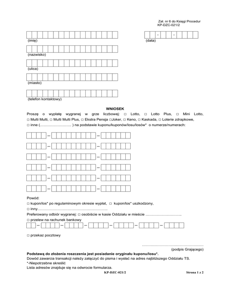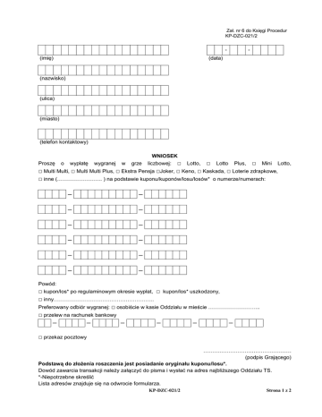 Zał. nr 6 do Księgi Procedur KP-DZC-021/2 (imię) - (data) (nazwisko) (ulica) (miasto) (telefon kontaktowy) WNIOSEK □ Lotto, □ Lotto Plus, □ Mini Lotto, □ Multi Multi, □ Multi Multi Plus, □ Ekstra Pensja □Joker, □ Keno, □ Kaskada, □ Loterie zdrapkowe, □ inne (……………………. ) na podstawie kuponu/kuponów/losu/losów* o numerze/numerach: Proszę o wypłatę wygranej w grze ─ ─ ─ ─ ─ ─ ─ ─ ─ ─ ─ ─ liczbowej: Powód: □ kupon/los* po regulaminowym okresie wypłat, □ kupon/los* uszkodzony, □ inny……………………………………………….. Preferowany odbiór wygranej: □ osobiście w kasie Oddziału w mieście ……………………….. □ przelew na rachunek bankowy ─ ─ ─ ─ ─ ─ □ przekaz pocztowy …………………………………………. (podpis Grającego) Podstawą do złożenia roszczenia jest posiadanie oryginału kuponu/losu*. Dowód zawarcia transakcji należy załączyć do pisma i wysłać na adres najbliższego Oddziału TS. *-Niepotrzebne skreślić Lista adresów znajduje się na odwrocie formularza. KP-DZC-021/2 Strona 1 z 2 1. Oddział w Warszawie ul. Targowa 25, 03-728 Warszawa telefon: (22) 518-24-09 e-mail: [email protected] 2. Oddział Kraków ul. Olszańska 5A, Kraków 31-513 telefon: (12) 627-97-01 e-mail: [email protected] 3. Oddział Katowice ul. Ligocka 103, 40-568 Katowice telefon: (32) 208-79-03 e-mail: [email protected] 4. Oddział Wrocław Joannitów 16, Wrocław 50-525 telefon: (71) 333-19-38 e-mail: [email protected] 5. Oddział Łódź ul. Wodna 43/45; 90-046 Łódź telefon: (42) 677-59-00 e-mail: [email protected] 6. Oddział Poznań ul. Palacza 81, Poznań 60-273 telefon: (61) 864-60-00 e-mail: [email protected] 7. Oddział Bydgoszcz ul. Poznańska 20, Bydgoszcz 85-129 telefon: (52) 363-45-00 e-mail: [email protected] 8. Oddział Gdańsk ul. Straganiarska 31/33, Gdańsk 80-837 telefon: (58) 692-15-61 e-mail: [email protected] 9. Oddział Białystok ul. Modlińska 1, Białystok 15-066 telefon: (85) 66-55-100 e-mail: [email protected] 10. Oddział Lublin ul. Wolińskiego 20, Lublin 20-491 telefon: (81) 759-33-00 e-mail: [email protected] 11. Oddział Kielce ul. Targowa 18 (piętro 7), Kielce 25-520 telefon: (41) 343-78-01 e-mail: [email protected] 12. Oddział Rzeszów ul. Geodetów 1, Rzeszów 35-959 telefon: (17) 860-96-10 e-mail: [email protected] 13. Oddział Opole ul. Kośnego 22, 45-056 Opole telefon: (77) 406-61-01 e-mail:[email protected] 14. Oddział Zielona Góra ul. Kręta 5, 65-770 Zielona Góra telefon: (68) 322-17-60 e-mail: [email protected] 15. Oddział Szczecin ul. Celna 1, Szczecin 70-644 telefon: (91) 480-85-46 e-mail: [email protected] 16. Oddział Olsztyn ul. Bogumiła Linki 1, 10-534 Olsztyn telefon: (89) 521-71-40 e-mail: [email protected] 17. Oddział Koszalin ul. Piłsudskiego 56, 75-525 Koszalin telefon: (94) 314-68-23 e-mail: [email protected] 18. Centrala Totalizatora Sportowego Sp. z o. o. ul. Targowa 25, 03-728 Warszawa telefon: (22) 518-22-00 e-mail: [email protected] KP-DZC-021/2 Strona 2 z 2