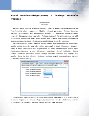 Moduł Handlowo-Magazynowy – Obsługa terminów ważności Wersja 3.59.305 4.04.2013 r. Aby uruchomić obsługę terminów ważności, należy w menu SystemKonfiguracja UstawieniaKartoteki magazynoweOgólne włączyć parametr: Obsługa terminów ważności. Po ustawieniu tego parametru na wartość TAK, dodatkowo można uruchomić parametr: Obsługa terminów ważności – Podczas dodawania kartoteki ustaw na wartość: na życzenie, wymuszona, brak, który pozwoli aby na nowo wystawionych kartotekach towarowych automatycznie był ustawiony sposób obsługi terminów ważności. Jeśli posiadamy już słownik kartotek, to aby ustawić na kilku kartotekach jednocześnie sposób obsługi terminów ważności, należy zaznaczyć kartoteki klawiszem <Insert>, wejść w menu MagazynStany magazynowe, w menu kontekstowym wybrać opcję PodstawoweOperacje grupoweGrupowe ustawianie danych zakładka: Sposób obsługi, zaznaczyć parametr: Sposób obsługi terminów ważności oraz wybrać dany sposób. Opcja ta jest również dostępna podczas edycji poszczególnych kartotek na zakładce Sposób obsługi. Po ustawieniu sposobu obsługi terminów ważności na kartotekach, przy przyjmowaniu towaru na magazyn, np. fakturą zakupu lub przyjęciem z zewnątrz i dodawaniu kartoteki na dokument, na zakładce: Dostawa, można wskazać datę ważności. 1 Ustawienie tych wartości umożliwi, przy wystawianiu dokumentów sprzedaży, wskazanie dostawy według jej terminu (na oknie Stanów magazynowych). Program umożliwia również z poziomu okna Stany magazynowe wykonanie filtrowania po terminie ważności. Za pomocą ikony Filtr po terminie ważności <Alt+F7> można wyświetlić kartoteki posiadające nierozchodowane dostawy, których: ● termin ważności upływa z dniem (lub wcześniej), ● termin ważności upływa za dni (lub wcześniej). Spis wyfiltrowanych kartotek można również wydrukować za pomocą opcji Drukuj <F9>Drukuj aktualne stany magazynowe. Dodatkowo w konfiguracji systemu użytkownik ma możliwość ustawienia, aby program informował o dodawaniu SystemKonfiguracja przeterminowanego towaru UstawieniaDokumentyEdycja na dokument pozycjiOstrzegaj (menu przy 2 dodawaniu przeterminowanego towaru). Powoduje to, że przy tworzeniu dokumentu przyjęcia, program wyświetli informację o tym, że towar ma datę ważności mniejszą od daty dostawy. 3