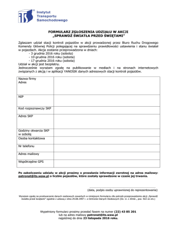 FORMULARZ ZGŁOSZENIA UDZIAŁU W AKCJI „SPRAWDŹ ŚWIATŁA PRZED ŚWIĘTAMI” Zgłaszam udział stacji kontroli pojazdów w akcji prowadzonej przez Biuro Ruchu Drogowego Komendy Głównej Policji polegającej na sprawdzeniu prawidłowości ustawienia i stanu świateł w pojazdach. Akcja zostanie przeprowadzona w dniach: - 3 grudnia 2016 roku (sobota) - 10 grudnia 2016 roku (sobota) - 17 grudnia 2016 roku (sobota) Udział w akcji jest bezpłatny. Jednocześnie wyrażam zgodę na publikowanie w mediach i na stronach internetowych związanych z akcją i w aplikacji YANOSIK danych adresowych stacji kontroli pojazdów. Nazwa firmy Adres NIP Kod rozpoznawczy SKP Adres SKP Godziny otwarcia SKP w sobotę Osoba kontaktowa Nr telefonu Adres mailowy Współrzędne GPS Po zakończeniu udziału w akcji prosimy o przesłanie informacji zwrotnej na adres mailowy: [email protected] o liczbie pojazdów, które zostały sprawdzone w czasie jej trwania. ………………………………………………………………… (data, podpis osoby uprawnionej do reprezentowania) Wyrażam zgodę na przetwarzanie danych osobowych zawartych w niniejszym formularzu dla potrzeb przeprowadzenia akcji „Sprawdź światła przed świętami” zgodnie z ustawą z dnia 29.08.1997 r. o Ochronie Danych Osobowych (Dz. U. z 2016r., poz. 922 ze zm.) Wypełniony formularz prosimy przesłać faxem na numer (22) 43 85 201 lub na adres mailowy [email protected] najpóźniej do dnia 23 listopada 2016 roku.