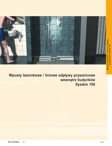 Wpusty łazienkowe / liniowe odpływy prysznicowe System 100 Wpusty łazienkowe / liniowe odpływy prysznicowe wewnątrz budynków System 100 4.1 W 41 Wpusty łazienkowe „Der Superflache“ System 100 KESSEL - Zalety Łatwa zabudowa dzięki możliwości dopasowania nasady. Cechy nasady: obrotowa, nachylana, regulowana wysokość Poziome dopasowanie kratki do wzoru płytek Minimalna wysokość zabudowy Wpusty łazienkowe „Der Superflache“ Trwałe uszczelnienie dzięki stałej uszczelce wargowej Elastyczny króciec odpływowy nieprzenoszący hałasu. elastyczny odpływ Niski poziom hałasu Szybkie i łatwe czyszczenie, wyjmowany syfon Możliwe wersje: z 1 lub z 3 dopływami Produkt Opis produktu do uszczelnień płynnymi masami izolacyjnymi Dopasowywana nasadka elastyczny odpływ Wpust łazienkowy KESSEL „Der Superflache“ NEU Wielk. nom. Nr art. Szt./ kart./pal. DN 50 42 701.91 1/36 do uszczelnień płynnymi masami izolacyjnymi dla najniższych wysokości zabudowy z PP, niskoszumowy, DN 50 elastyczny króciec odpływu, przepustowość 0,9 l/s. DN 50 97 86 min. 104 max. 112 65 min. 19 max. 27 Z wyjmowanym syfonem. Ø 332 107 Z dopływem bocznym DN 40 ze stałą uszczelką wargową. Bez możliwości poziomego przesuwania kratki Z nasadką z ABS z kratką szczelinową 95 x 95 mm ze stali nierdzewnej, klasa K3 Nr art. 42 701.91 System 125 W 42 Ecoguss Wybranie 260 x 180 mm Practicus ® Giro „Der Ultraflache“ Super60 System 100 „Der Superflache“ Classic 4.1 „LINEARIS“ Wpusty łazienkowe „Der Superflache“ Opis produktu do uszczelnień płynnymi masami izolacyjnymi Dopasowywana pokrywa/ nasadka min. 10 min. 45 max. 23 max. 110 elastyczny odpływ Ø 312 120 DN 50 80 32 DN 40 Ø110 118 Nr art. 42 701.54 130 Wybranie 260 x 180 mm Dopasowywana nasadka Nr art. Szt./ kart./pal. DN 50 42 701.54 1/36 DN 50 42 701.50 1/36 DN 50 42 701.55 1/36 DN 50 42 701.95 1/60 DN 50 42 701.20 10/240 DN 50 42 701.66 10/240 Wpust łazienkowy KESSEL „Der Superflache“ NEU z PP, niskoszumowy, DN 50 elastyczny króciec odpływu, przepustowość 0,9 l/s. Z wyjmowanym syfonem. Z dopływem bocznym DN 40 ze stałą uszczelką wargową. Z nasadką do uszczelniania płynnymi masami izolacyjnymi Variofix z ABS z kratką ze wzorem owalu 120 x 120 mm i ramą ze stali nierdzewnej, dla grubości płytek 8-21 mm, klasa L15, z systemem Lock & Lift KESSEL. z kratką szczelinową standardową 95 x 95 mm ze stali nierdzewnej, dla grubości płytek 6-14 mm, klasa K3, z pokrywą do przyklejania płytek 110 x 110 mm i ramą ze stali nierdzewnej, klasa K3 z systemem ryglującym. Wpust łazienkowy KESSEL „Der Superflache“ NEU z kołnierzem do uszczelnień klejonych Wielk. nom. z PP, niskoszumowy, DN 50 elastyczny króciec odpływu, przepustowość 0,9 l/s. Z wyjmowanym syfonem. elastyczny odpływ min. 25 max. 90 z kołnierzem do uszczelnień klejonych i przeciwkołnierzem Z nasadką z ABS z pokrywą do przyklejania płytek 110 x 110 mm z tworzywa sztucznego i ramą ze stali nierdzewnej, klasa K3, z systemem ryglującym, dla grubości płytek do 10 mm. 50 65 DN 50 86 38 DN 40 Ø 332 132 110 248 Nr art. 42 701.95 Z dopływem bocznym DN 40 ze stałą uszczelką wargową. Wybranie 260 x 180 mm Wpust łazienkowy KESSEL „Der Superflache“ NEU z krawędzią połączeniową Dopasowywana nasadka z PP, niskoszumowy, DN 50 elastyczny króciec odpływu, przepustowość 0,9 l/s Z wyjmowanym syfonem. DN z kratką szczelinową 100 x 100 mm ze stali nierdzewnej, min. wysokość zabudowy 90 mm, klasa K3 250 Nr art. 42 701.20 System 125 Ecoguss 4.1 Wybranie 260 x 180 mm Practicus ® Z dopływem bocznym DN 40 ze stałą uszczelką wargową. Z nasadką z ABS l107 DN min. 10 80 max. 60 elastyczny odpływ Giro z pokrywą do przyklejania płytek 110 x 110 mm, klasa K3, z systemem ryglującym. „Der Ultraflache“ Super60 System 100 „Der Superflache“ Classic „LINEARIS“ W 43 Wpusty łazienkowe „Der Superflache“ Produkt System 100 Wpusty łazienkowe Classic Wewnątrz budynków według PN EN 1253 System 100 KESSEL - Zalety Łatwa zabudowa dzięki możliwości dopasowania nasady. Cechy nasady: obrotowa, nachylana, regulowana wysokość Poziome dopasowanie kratki do wzoru płytek Trwałe uszczelnienie dzięki stałej uszczelce wargowej Wpusty łazienkowe Classic Łatwa konserwacja dzięki zastosowaniu wyjmowanego syfonu Produkt Wielk. nom. Opis produktu do uszczelnień płynnymi masami izolacyjnymi Dopasowywana pokrywa/ nasadka Wpust łazienkowy KESSEL Classic 1 z ABS, DN ... Odpływ pionowy, przepustowość 0,9 l/s Z wyjmowanym syfonem, wysokość zamknięcia wodnego 50 mm. 2 Ze stałą uszczelką wargową z nasadką do uszczelniania płynnymi masami izolacyjnymi Variofix z ABS Ø 312 132 min. 10 max. 23 1 2 DN 50 90 min. 45 max. 110 110 3 z kratką szczelinową standardową 95 x 95 mm ze stali nierdzewnej, dla grubości płytek 6-14 mm, klasa K3 z kratką szczelinową 138 x 138 mm i ramą, dla grubości płytek 8-16 mm, klasa L15 System 125 W 44 Ecoguss Wybranie 220 x 180 mm Practicus ® Giro DIN EN1253 LGA 40 150.54 1/36 DN 70 40 170.54 Odpływ pionowy 1/36 DN 50 40 250.54 1/36 DN 70 40 270.54 1/36 Z kratką szczelinową standardową 95 x 95 mm ze stali nierdzewnej: Odpływ boczny DN 50 z kratką ze wzorem owalu 120 x 120 mm i ramą ze stali nierdzewnej, dla grubości płytek 8-21 mm, z systemem Lock & Lift KESSEL, klasa L15 KESSEL GmbH Nr art. 40 150.54 Z kratką ze wzorem owalu: Odpływ boczny DN 50 z ABS, DN ... Odpływ boczny 2,5°, przepustowość 0,9 l/s. 3 Szt./ kart./pal. Nr art. 40 150.50 1/36 DN 70 40 170.50 Odpływ pionowy DN 50 40 250.50 1/36 1/36 DN 70 1/36 40 270.50 z kratką szczelinową 138 x 138 mm i ramą ze stali nierdzewnej: Odpływ boczny DN 50 40 150.51 1/36 DN 70 40 170.51 Odpływ pionowy 1/36 DN 50 40 250.51 1/36 DN 70 40 270.51 1/36 Landesgewerbeamt Bayern PN EN 1253 „Der Ultraflache“ Super60 Bauart geprü geprüft geprüft und ü überwacht berwacht t herhei t mit Sice Qualitä geprüft Syste