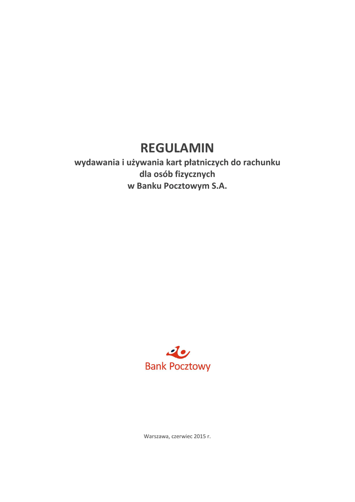 REGULAMIN wydawania i u¿ywania kart pùatniczych do rachunku dla osób fizycznych w Banku Pocztowym S.A. Warszawa, czerwiec 2015 r. Rozdziaù 1 Postanowienia ogólne §1 Regulamin wydawania i u¿ywania kart pùatniczych do rachunku dla osób fizycznych w Banku Pocztowym S.A., zwany dalej „Regulaminem”, okreœla zasady wydawania i u¿ywania kart pùatniczych dla osób fizycznych do rachunku prowadzonego w Banku Pocztowym S.A. zwanych dalej „kartami” oraz rozliczania transakcji przeprowadzonych przy ich u¿yciu i inne usùugi œwiadczone przez Bank Pocztowy S.A. zwi¹zane z tymi kartami oraz zasady skùadania reklamacji. Ponadto Regulamin reguluje zasady rozwi¹zania Umowy o kartê pùatnicz¹. §2 Przez u¿yte w niniejszym Regulaminie okreœlenia nale¿y rozumieã: 1) autoryzacja – zgoda Banku Pocztowego S.A. lub U¿ytkownika karty na dokonanie transakcji pùatniczej przy u¿yciu karty, 2) Bank – Bank Pocztowy S.A. z siedzib¹ w Bydgoszczy, nadzorowany przez Komisjê Nadzoru Finansowego, wydawca karty; informacja o adresach placówek Banku oraz agentów Banku, w których prowadzona jest dziaùalnoœã, maj¹cych znaczenie do celów porozumiewania siê z Bankiem dostêpna jest na stronie internetowej Banku oraz bezpoœrednio w miejscu prowadzenia dziaùalnoœci, 3) bankomat – urz¹dzenie umo¿liwiaj¹ce U¿ytkownikowi karty podejmowanie gotówki lub dodatkowo dokonywanie innych transakcji pùatniczych i operacji dostêpnych w tym urz¹dzeniu np. sprawdzenie dostêpnych œrodków, 4) bankowoœã elektroniczna – usùugi umo¿liwiaj¹ce Posiadaczowi lub U¿ytkownikowi karty dostêp do informacji dotycz¹cych rachunków, kart i innych produktów oraz skùadanie wniosków i dyspozycji okreœlonych w Umowie w tym w Regulaminie, na zasadach okreœlonych w umowie o œwiadczenie usùug drog¹ elektroniczn¹, za poœrednictwem kanaùów: a) internetowego zwanego dalej „Pocztowy24” – usùugi bankowoœci elektronicznej, dostêpnej za poœrednictwem sieci Internet i przegl¹darki WWW, b) SMS zwanego dalej „PocztowySMS” - usùugi bankowoœci elektronicznej, dostêpnej za poœrednictwem telefonu komórkowego i krótkich wiadomoœci tekstowych „SMS”, c) telefonicznego, zwanego dalej „Telekonto” usùugi bankowoœci elektronicznej, dostêpnej poprzez kontakt telefoniczny z infolini¹ Banku 5) Cash back – usùuga wypùaty gotówki podczas dokonywania transakcji bezgotówkowej w placówce handlowej przy u¿yciu karty. Usùugê mo¿na przeprowadziã tylko w poù¹czeniu z transakcj¹ bezgotówkow¹ przy u¿yciu karty. U¿ytkownik karty przed usùug¹ Cash back musi wyraziã chêã dokonania wypùaty gotówkowej dodatkowej kwoty. Maksymalna kwota jednorazowej wypùaty gotówkowej w ramach usùugi Cash back jest okreœlona przez organizacjê kartow¹ i podawana jest do wiadomoœci w materiaùach informacyjnych dotycz¹cych karty, na stronach internetowych Banku oraz za poœrednictwem infolinii Banku, 6) CVV2/ CVC2 - 3 cyfrowy kod zabezpieczaj¹cy naniesiony na rewersie karty, u¿ywany do potwierdzenia autentycznoœci karty podczas dokonywania operacji bez fizycznego przedstawienia karty; poprzez Internet, telefonicznie lub drog¹ pocztow¹. 7) czytnik zbli¿eniowy – elektroniczne urz¹dzenie stanowi¹ce czêœã terminala POS lub bankomatu, sùu¿¹ce do przeprowadzania transakcji zbli¿eniowych; urz¹dzenia z czytnikiem zbli¿eniowym oznaczone s¹ znakiem akceptacji transakcji zbli¿eniowych odpowiedniej organizacji kartowej, 8) data waluty – moment w czasie, od którego lub do którego Bank nalicza odsetki od œrodków, którymi zostaù obci¹¿ony lub uznany rachunek, 9) dzieñ roboczy – dzieñ, w którym Bank prowadzi dziaùalnoœã niezbêdn¹ do wykonania transakcji pùatniczej, za wyj¹tkiem sobót i dni ustawowo wolnych od pracy dla Banku, 10) infolinia Banku – telefoniczna obsùuga Klientów Banku; numery telefonów infolinii podane s¹ na stronie internetowej, w materiaùach informacyjnych dotycz¹cych karty oraz na karcie, 11) karta – miêdzynarodowa, debetowa karta pùatnicza wydana przez Bank do rachunku, na podstawie Umowy zawartej z Posiadaczem, instrument pùatniczy, 12) limity transakcyjne – ograniczenia kwoty lub liczby dokonanych transakcji pùatniczych w danej jednostce czasu, okreœlone w celu podwy¿szenia bezpieczeñstwa u¿ytkowania karty, 13) MasterCard – MasterCard International SA – organizacja wydawców kart pùatniczych, we wspóùpracy, z któr¹ Bank wydaje karty ze znakiem MasterCard, 14) odbiorca – punkt honoruj¹cy kartê bêd¹cy odbiorc¹ œrodków pieniê¿nych stanowi¹cych przedmiot transakcji pùatniczej dokonywanej kart¹ przez jej U¿ytkownika, a tak¿e Posiadacz w odniesieniu do transakcji, w wyniku których nastêpuje uznanie jego rachunku, 15) organizacja kartowa – miêdzynarodowa organizacja pùatnicza, w ramach której zostaùa wydana karta i która poœredniczy w realizacji oraz rozliczeniu transakcji pùatniczej, 16) PIN – poufny numer sùu¿¹cy do identyfikacji U¿ytkownika karty podczas dokonywania transakcji przy u¿yciu karty w POS i bankomatach, znany wyù¹cznie U¿ytkownikowi karty, wydawany i przekazywany U¿ytkownikowi karty w sposób uniemo¿liwiaj¹cy jego poznanie przez inne osoby, Strona 2 z 15 17) Peùnomocnik – peùnoletnia osoba fizyczna, rezydent lub nierezydent, posiadaj¹ca peùn¹ zdolnoœã do czynnoœci prawnych, upowa¿niona przez Posiadacza do dysponowania œrodkami zgromadzonymi na rachunku w zakresie okreœlonym w Regulaminie rachunku, w tym do dokonywania w imieniu i na rzecz Posiadacza transakcji kart¹ okreœlonych w Umowie, 18) placówka Banku –oddziaù lub placówka Banku obsùuguj¹ca klientów Banku; wykaz wszystkich placówek Banku, ich adresów i godzin otwarcia jest dostêpny na stronie internetowej Banku, 19) pùatnik – Posiadacz skùadaj¹cy zlecenie pùatnicze, a tak¿e punkt honoruj¹cy karty skùadaj¹cy zlecenie transakcji w wyniku, której nastêpuje uznani