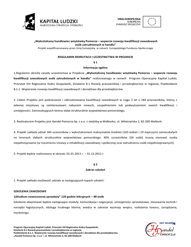 „Wykształcony handlowiec wizytówką Pomorza – wsparcie rozwoju kwalifikacji zawodowych osób zatrudnionych w handlu” Projekt współfinansowany przez Unię Europejską w ramach Europejskiego Funduszu Społecznego REGULAMIN REKRUTACJI I UCZESTNICTWA W PROJEKCIE §1 Informacje ogólne 1.Regulamin określa zasady uczestnictwa w Projekcie „Wykształcony handlowiec wizytówką Pomorza – wsparcie rozwoju kwalifikacji zawodowych osób zatrudnionych w handlu” realizowanego w ramach Program Operacyjny Kapitał Ludzki, Priorytet VIII Regionalne Kadry Gospodarki, Działanie 8.1 Rozwój pracowników i przedsiębiorstw w regionie, Poddziałanie 8.1.1. Wspieranie rozwoju kwalifikacji zawodowych i doradztwo dla przedsiębiorstw. 2. Celem Projektu jest podniesienie i zaktualizowanie kwalifikacji zawodowych w ciągu 2 lat u 184 pracowników, którzy z własnej inicjatywy są zainteresowani nabyciem nowych, uzupełnieniem lub podwyższeniem swoich kwalifikacji i umiejętności. Zamieszkujących tereny słabe strukturalnie województwa pomorskiego. 3. Realizatorem Projektu jest Handel Pomorza Sp. z o.o. z siedzibą w Malborku, ul. Włościaoska 2, 82-200 Malbork. 4. Projekt zakłada udział 184 uczestników z wykształceniem maksymalnie średnim (165 kobiet i 19 mężczyzn) zamieszkałych na terenach słabych strukturalnie województwa pomorskiego. 30% uczestników (56 osób) muszą stanowid osoby niepełnosprawne (w rozumieniu Ustawy o rehabilitacji zawodowej i społecznej oraz zatrudnieniu osób niepełnosprawnych). 5. Projekt będzie realizowany w okresie: 01.01.2011 r. – 31.12.2012 r. §2 Zakres szkoleo 1. Projekt zakłada możliwośd udziału w następujących typach szkoleo: SZKOLENIA ZAWODOWE 1)Studium nowoczesnej sprzedaży” 120 godzin lekcyjnych – 48 osób Szkolenie obejmowad będzie następujące moduły: komunikacja i negocjacje, umiejętności sprzedażowe, stosowanie technik i narzędzi logistycznych, obsługa trudnego klienta, wiedza w zakresie wystroju wnętrz, rozłożenia towaru, zarządzania, marketingu. Program Operacyjny Kapitał Ludzki, Priorytet VIII Regionalne Kadry Gospodarki, Działanie 8.1 Rozwój pracowników i przedsiębiorstw w regionie, Poddziałanie 8.1.1. Wspieranie rozwoju kwalifikacji zawodowych i doradztwo dla przedsiębiorstw. „Handel Pomorza Sp. z o.o.”, ul. Włościaoska 2, 82-200 Malbork „Wykształcony handlowiec wizytówką Pomorza – wsparcie rozwoju kwalifikacji zawodowych osób zatrudnionych w handlu” Projekt współfinansowany przez Unię Europejską w ramach Europejskiego Funduszu Społecznego 2)Samodzielny księgowy 120 godzin lekcyjnych - 48 osób Szkolenie obejmowad będzie następujące moduły: komunikacja i negocjacje, wstęp do rachunkowości finansowej, aktywa pieniężne, wynagrodzenia, podatek VAT, ewidencja rozrachunków, aktywa trwałe w ewidencji, towary i materiały, koszty w przedsiębiorstwie, obrót produktami. 3)Kadry i płace 120 godzin lekcyjnych – 48 osób Szkolenie obejmowad będzie następujące moduły: komunikacja i negocjacja, prawo pracy, dokumentacja kadrowa, ZUS, płace itp. Szkolenia odbywad się będą w weekendy w hotelach na terenie województwa pomorskiego. SZKOLENIA JĘZYKOWE 1)Angielski zaawansowany120 godzin lekcyjnych – 20 osób 2)Angielski podstawowy 120 godzin lekcyjnych – 20 osób Szkolenia języka angielskiego będą się odbywały popołudniami maksymalnie 2 razy w tygodniu. Siedziba szkolenia zostanie dopasowana do potrzeb uczestników projektu. §3 Warunki uczestnictwa w Projekcie 1. Grupę docelową Projektu stanowią: Osoby dorosłe pracujące w handlu (w tym wykonujące prace na podstawie umowy cywilno-prawnej, powyżej 18 roku życia z wyłączeniem osób fizycznych prowadzących działalnośd gospodarczą) zamieszkujące tereny słabe strukturalnie województwa pomorskiego z wykształceniem co najwyżej średnim. 2. Terenami słabymi strukturalnie są gminy: Borzytuchom, Czarna Dąbrówka, Kołczygłowy, Miastko, Parchowo, Trzebielino, Tuchomie, Chojnice, Czersk, Konarzyny, Człuchów, Debrzno, Koczała, Przechlewo, Rzeczenica, Gardeja, Kwidzyn, Prabuty, Ryjewo, Nowa Wieś Lęborska, Lichnowy, Miłoradz, Ostaszewo, Damnica, Dębnica Kaszubska, Główczyce, Kępice, Potęgowo, Smołdzino, Bobowo, Czarna Woda, Lubichowo, Osieczna, Skórcz, Smętowo Graniczne, Zblewo, Dzierzgoo, Mikołajki Pomorskie, Stary Dzierzgoo, Stary Targ, Gniew, Morzeszczyn, Subkowy. Program Operacyjny Kapitał Ludzki, Priorytet VIII Regionalne Kadry Gospodarki, Działanie 8.1 Rozwój pracowników i przedsiębiorstw w regionie, Poddziałanie 8.1.1. Wspieranie rozwoju kwalifikacji zawodowych i doradztwo dla przedsiębiorstw. „Handel Pomorza Sp. z o.o.”, ul. Włościaoska 2, 82-200 Malbork „Wykształcony handlowiec wizytówką Pomorza – wsparcie rozwoju kwalifikacji zawodowych osób zatrudnionych w handlu” Projekt współfinansowany przez Unię Europejską w ramach Europejskiego Funduszu Społecznego 3. Szkolenia będą się odbywad poza miejscem oraz godzinami pracy uczestników. 4. Nabór na szkolenia jest otwarty dla wszystkich zainteresowanych. 5. Pracownicy zatrudnieni w jednym miejscu pracy (u jednego pracodawcy) nie mogą stanowid więcej niż 20% uczestników 1 szkolenia w ramach projektu. 6. Warunkiem uczestnictwa w Projekcie jest: a) zapoznanie się z Regulaminem oraz złożenie wypełnionych dokumentów zgłoszeniowych, o których mowa w § 5 Regulaminu, b) spełnienie kryteriów formalnych określonych w § 3 i § 5 Regulaminu, c) pozytywne zakwalifikowanie przez Komisję rekrutacyjną, o której mowa w § 4 Regulaminu. §4 Rekrutacja Uczestników Projektu 1. Rekrutację uczestników Projektu przeprowadzi Komisja rekrutacyjna w składzie: Kierownik projektu, Koordynator Projektu, trzech Coach – ów. 2. W procesie rekrutacji zostaną przeprowadzone dwa nabory uczestników Projektu (I nabór 92 osób w 2011 roku, II nabór 92 osoby w 2012 roku). 3. W sytuacji większej liczby zgłoszeo zo