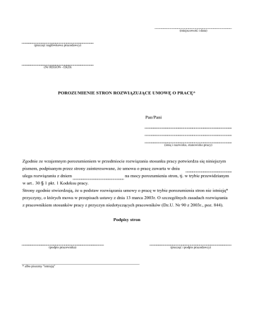 (miejscowość i data) (pieczęć nagłówkowa pracodawcy) (Nr REGON - EKD) POROZUMIENIE STRON ROZWIĄZUJĄCE UMOWĘ O PRACĘ* Pan/Pani (imię i nazwisko, stanowisko pracy) Zgodnie ze wzajemnym porozumieniem w przedmiocie rozwiązania stosunku pracy potwierdza się niniejszym pismem, podpisanym przez strony zainteresowane, Ŝe umowa o pracę zawarta w dniu ulega rozwiązaniu z dniem na mocy porozumienia stron, tj. w trybie przewidzianym w art.. 30 § 1 pkt. 1 Kodeksu pracy. Strony zgodnie stwierdzają, Ŝe u podstaw rozwiązania umowy o pracę w trybie porozumienia stron nie istnieją* przyczyny, o których mowa w przepisach ustawy z dnia 13 marca 2003r. O szczególnych zasadach rozwiązania z pracownikiem stosunków pracy z przyczyn niedotyczących pracowników (Dz.U. Nr 90 z 2003r., poz. 844). Podpisy stron (podpis pracownika) * albo piszemy "istnieją" (pieczęć i podpis pracodawcy)