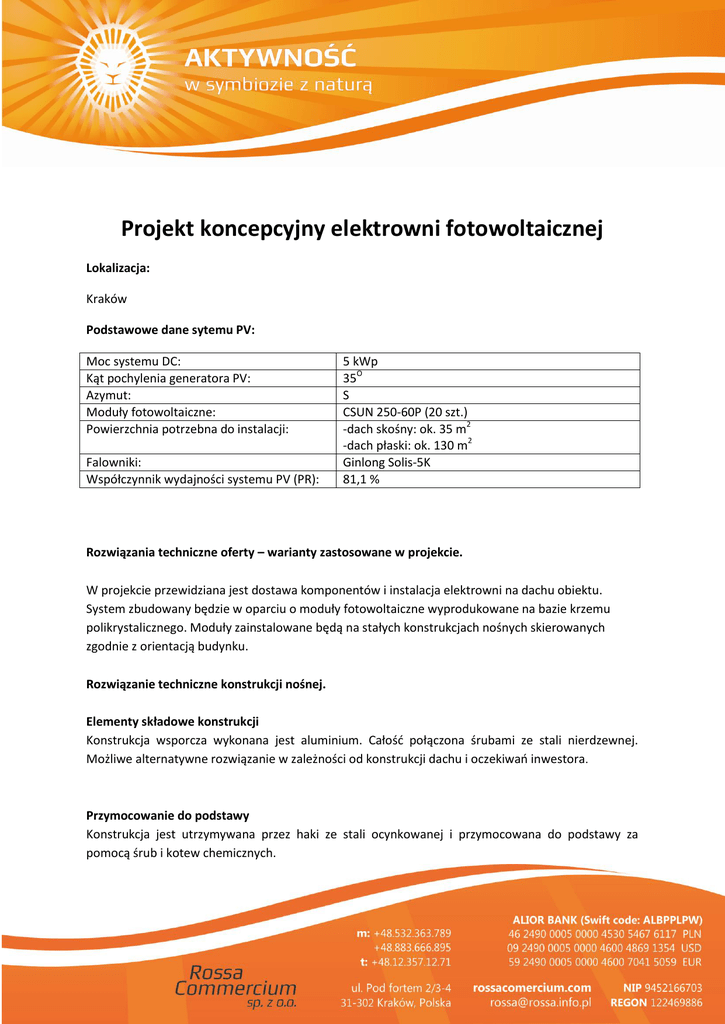 Projekt koncepcyjny elektrowni fotowoltaicznej Lokalizacja: Kraków Podstawowe dane sytemu PV: Moc systemu DC: Kąt pochylenia generatora PV: Azymut: Moduły fotowoltaiczne: Powierzchnia potrzebna do instalacji: Falowniki: Współczynnik wydajności systemu PV (PR): 5 kWp 35O S CSUN 250-60P (20 szt.) -dach skośny: ok. 35 m2 -dach płaski: ok. 130 m2 Ginlong Solis-5K 81,1 % Rozwiązania techniczne oferty – warianty zastosowane w projekcie. W projekcie przewidziana jest dostawa komponentów i instalacja elektrowni na dachu obiektu. System zbudowany będzie w oparciu o moduły fotowoltaiczne wyprodukowane na bazie krzemu polikrystalicznego. Moduły zainstalowane będą na stałych konstrukcjach nośnych skierowanych zgodnie z orientacją budynku. Rozwiązanie techniczne konstrukcji nośnej. Elementy składowe konstrukcji Konstrukcja wsporcza wykonana jest aluminium. Całość połączona śrubami ze stali nierdzewnej. Możliwe alternatywne rozwiązanie w zależności od konstrukcji dachu i oczekiwań inwestora. Przymocowanie do podstawy Konstrukcja jest utrzymywana przez haki ze stali ocynkowanej i przymocowana do podstawy za pomocą śrub i kotew chemicznych. Rozmieszczenie Ilość i odstępy pomiędzy poszczególnymi konstrukcjami zostaną zoptymalizowane stosownie do kształtu dachu. Zastaną również zoptymalizowane pod względem możliwego zacienienia powodowanego przez inne obiekty. Rozwiązania techniczne części elektrycznej. Moduły fotowoltaiczne W projekcie elektrowni fotowoltaicznej PV zostaną użyte moduły fotowoltaiczne CSUN250-60P – ogółem 20 sztuk, o łącznej mocy 5 kWp. Panele zostaną podłączone do falowników , które dostarczać będą wytworzoną energię do sieci elektrycznej – energia zostanie wprowadzona przez samodzielny kabel do głównej szafy rozdzielczej systemu, a dalej do odpowiedniej szafy rozdzielczej niskiego napięcia. Najważniejsze cechy polikrystalicznych modułów fotowoltaicznych CSUN: 6 diod bocznikujących (bypass) – wyższe uzyski energetyczne w przypadku punktowych zacienień; niski współczynnik temperaturowy mocy: -0.408% /OC, - wyższe uzyski energetyczne w warunkach wysokich temperatur; ubezpieczenie PowerGuard™ wszystkich modułów w standardzie – zabezpieczenie zobowiązań gwarancyjnych przez zewnętrzne firmy ubezpieczeniowe. Falowniki Falowniki zapewniają bezpośrednią dostawę wytworzonego prądu elektrycznego poprzez fazowanie do lokalnej sieci elektrycznej. Falowniki wyposażone są w ochronę, która automatycznie odłączy generator słoneczny od sieci w przypadku zbyt wysokiego/zbyt niskiego napięcia, zbyt wysokiej/zbyt niskiej częstotliwości oraz impedancji sieci powyżej 0,5 Ω (wartości te można zaprogramować). Użyte modele Solis są falownikami trójfazowymi. Dodatkowym udogodnieniem są wejścia umożliwiające komunikacje z PC i monitorowanie pracy elektrowni. Falowniki firmy Ginlong są uznanymi urządzeniami używanymi na całym świecie- zarówno w branży fotowoltaicznej, jak i energetyce wiatrowej. Uziemienie. Do uziemienia systemu zostanie użyte istniejące uziemienie obiektu. Jeżeli okaże się ono niewystarczające, to zostanie zmodyfikowane. Ochrona odgromowa. Zainstalowane zostanie zabezpieczenie przeciwprzepięciowe ze wzmożoną ochroną przed przepięciem atmosferycznym po stronie DC. Wykorzystany zostanie istniejący piorunochron, panele będą umieszczone w przestrzeni ochronnej zabezpieczenia. Jeżeli ochrona okaże się niewystarczająca, to zostanie wzmocniona. Technologia elektryczna, przewody. System będzie podłączony do części niskonapięciowej przewodów elektrycznych w istniejącym obiekcie. Archiwizacja danych – monitoring. System komunikacyjny do analizy i kontroli urządzeń fotowoltaicznych składa się z urządzenia umożliwiającego zdalną kontrole urządzeń, uzyskiwanie informacji o mocy sytemu fotowoltaicznego, prezentowanych w formie wykresów. Wgląd do danych aktualnych i archiwalnych jest możliwy w każdej chwili za pośrednictwem serwera internetowego oraz aplikacji SolisWeb na systemy Android i iPhone. Planowane uzyski energetyczne: Tabela możliwości uzyskiwania energii dla 5 kWp dla Krakowa (kWh) Miesiąc Średnia dzienna produkcja Średnia miesięczna produkcja Styczeń 5,48 170,00 Luty 8,70 244,00 Marzec 15,40 476,00 Kwiecień 20,00 600,00 Maj 20,60 639,00 Czerwiec 20,30 608,00 Lipiec 19,90 618,00 Sierpień 19,80 613,00 Wrzesień 15,70 471,00 Październik 10,70 333,00 Listopad 6,20 186,00 Grudzień 5,09 158,00 Średnia roczna 14,00 426,00 Całkowita roczna 5120,00 Koszt kompletnej elektrowni słonecznej (instalacji fotowoltaicznej PV) „pod klucz”: 31 000 zł brutto* Dla inwestycji przeprowadzonej przez osobę fizyczną przewidziano program dopłat „Prosument”. Program zakłada dotacje do inwestycji na poziomie 40 % oraz preferencyjny kredyt bankowy na maksymalny okres 15 lat z oprocentowaniem 1 % w skali roku. Koszt instalacji po dotacji: 18 600,00 zł W przypadku domów jednorodzinnych stopień zużycia pozyskanej energii na własny użytek, przy właściwym skomponowaniu systemu fotowoltaicznego, wynosi ok. 55 %. Wartość ta może być inna w zależności od profilu zużycia energii. Operator sieci dystrybucyjnej zobowiązany jest odkupić energię niezużytą na potrzeby własne. Korzyści z zainstalowania elektrowni słonecznej PV: Oszczędności w rachunkach za energię elektryczną. Podstawową korzyścią jest produkcja własnej energii i w związku z tym generowanie oszczędności w rachunkach za energię elektryczną. Pomimo chwilowego spadku cen energii elektrycznej (związanych z liberalizacją rynku sprzedawców energii) tendencja wzrostu cen energii ze źródeł konwencjonalnych zostanie utrzymana. Powody prognozowanego wzrostu cen energii: 1. Wzrost cen konwencjonalnych źródeł energii. Konwencjonalne nośniki energii (węgiel, gaz, ropa naftowa itp.) są źródłami, które ulegają wyczerpaniu, a ich odtworzenie trw