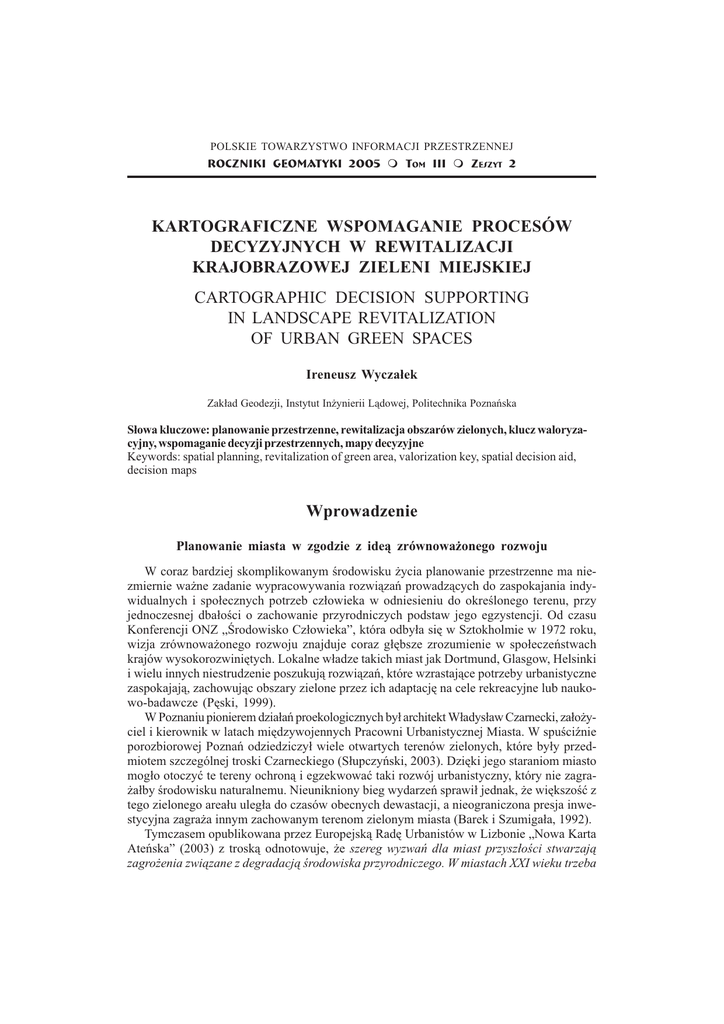POLSKIE TOWARZYSTWO INFORMACJI PRZESTRZENNEJ Kartograficzne wspomaganie procesów decyzyjnych w rewitalizacji krajobrazowej... ROCZNIKI GEOMATYKI 2005 m TOM III m Z ESZYT 2 181 KARTOGRAFICZNE WSPOMAGANIE PROCESÓW DECYZYJNYCH W REWITALIZACJI KRAJOBRAZOWEJ ZIELENI MIEJSKIEJ CARTOGRAPHIC DECISION SUPPORTING IN LANDSCAPE REVITALIZATION OF URBAN GREEN SPACES Ireneusz Wycza³ek Zak³ad Geodezji, Instytut In¿ynierii L¹dowej, Politechnika Poznañska S³owa kluczowe: planowanie przestrzenne, rewitalizacja obszarów zielonych, klucz waloryzacyjny, wspomaganie decyzji przestrzennych, mapy decyzyjne Keywords: spatial planning, revitalization of green area, valorization key, spatial decision aid, decision maps Wprowadzenie Planowanie miasta w zgodzie z ide¹ zrównowa¿onego rozwoju W coraz bardziej skomplikowanym rodowisku ¿ycia planowanie przestrzenne ma niezmiernie wa¿ne zadanie wypracowywania rozwi¹zañ prowadz¹cych do zaspokajania indywidualnych i spo³ecznych potrzeb cz³owieka w odniesieniu do okrelonego terenu, przy jednoczesnej dba³oci o zachowanie przyrodniczych podstaw jego egzystencji. Od czasu Konferencji ONZ rodowisko Cz³owieka, która odby³a siê w Sztokholmie w 1972 roku, wizja zrównowa¿onego rozwoju znajduje coraz g³êbsze zrozumienie w spo³eczeñstwach krajów wysokorozwiniêtych. Lokalne w³adze takich miast jak Dortmund, Glasgow, Helsinki i wielu innych niestrudzenie poszukuj¹ rozwi¹zañ, które wzrastaj¹ce potrzeby urbanistyczne zaspokajaj¹, zachowuj¹c obszary zielone przez ich adaptacjê na cele rekreacyjne lub naukowo-badawcze (Pêski, 1999). W Poznaniu pionierem dzia³añ proekologicznych by³ architekt W³adys³aw Czarnecki, za³o¿yciel i kierownik w latach miêdzywojennych Pracowni Urbanistycznej Miasta. W spucinie porozbiorowej Poznañ odziedziczy³ wiele otwartych terenów zielonych, które by³y przedmiotem szczególnej troski Czarneckiego (S³upczyñski, 2003). Dziêki jego staraniom miasto mog³o otoczyæ te tereny ochron¹ i egzekwowaæ taki rozwój urbanistyczny, który nie zagra¿a³by rodowisku naturalnemu. Nieunikniony bieg wydarzeñ sprawi³ jednak, ¿e wiêkszoæ z tego zielonego area³u uleg³a do czasów obecnych dewastacji, a nieograniczona presja inwestycyjna zagra¿a innym zachowanym terenom zielonym miasta (Barek i Szumiga³a, 1992). Tymczasem opublikowana przez Europejsk¹ Radê Urbanistów w Lizbonie Nowa Karta Ateñska (2003) z trosk¹ odnotowuje, ¿e szereg wyzwañ dla miast przysz³oci stwarzaj¹ zagro¿enia zwi¹zane z degradacj¹ rodowiska przyrodniczego. W miastach XXI wieku trzeba 182 Ireneusz Wycza³ek bêdzie dbaæ o zapewnienie bliskiego s¹siedztwa miejsc zamieszkania i miejsc pracy ze starannie utrzymywanymi elementami kulturowego i przyrodniczego dziedzictwa, takimi jak: urokliwe krajobrazy, wykopaliska archeologiczne i inne zabytki, tradycyjne osiedla, parki, skwery, rezerwaty przyrody oraz ró¿nego rodzaju tereny otwarte, rolnicze i powierzchnie wodne (jeziora, rzeki, moczary, wybrze¿e morskie). Wa¿nym narzêdziem ochrony tych elementów przyrodniczej i kulturowej spucizny bêdzie nadal planowanie przestrzenne, które odgrywaæ bêdzie równie¿ kluczow¹ rolê w kszta³towaniu nowych otwartych terenów powi¹zanych z tkank¹ zabudowy miejskiej. Organizacyjne i techniczne aspekty dzia³añ proekologicznych w planowaniu W przytoczonym wy¿ej kontekcie rysuje siê rola urbanisty jako obroñcy interesów spo³ecznych (...), posiadaj¹cego dalekosiê¿ne spojrzenie w przysz³oæ (Nowa Karta Ateñska, 2003). Aktywnoci w tym kierunku maj¹ s³u¿yæ, zdaniem autorów Karty, szczególne uprawnienia dla tej profesji, obejmuj¹ce miêdzy innymi bardzo dra¿liwy temat prowadzenia negocjacji z ró¿nymi grupami interesów w sprawie opracowania planów u¿ytecznych tak dla spo³eczeñstwa jak i dla jednostek, z uwzglêdnieniem powinnoci wobec przysz³ych pokoleñ. Dotyczy to przede wszystkim ochrony naturalnego rodowiska ¿ycia. W dba³oci o ³ad przestrzenny wspieraj¹ urbanistów specjalici z ró¿nych bran¿, którym powierzone s¹ zadania badania i opisu wyjciowego stanu rodowiska oraz oceny potencjalnych skutków planów zagospodarowania przestrzennego. W tej grupie znajduj¹ siê te¿ geodeci i kartografowie ze swoim powo³aniem do gromadzenia, przetwarzania, modelowania i kartograficznej prezentacji informacji przestrzennej. GIS stosowany jako narzêdzie informatyczne specjalizowane do tego typu dzia³añ posiada coraz wiêcej procedur wspomagaj¹cych procesy planistyczne i prezentuj¹cych ró¿ne wizje przysz³ego wygl¹du opracowywanego obszaru. Prowadzone s¹ na wiecie prace badawcze i wdro¿eniowe nad implementacj¹ w ramach GIS metod wspomagania podejmowania decyzji (SDSS Spatial Decision Support Systems), wykorzystuj¹cych modelowanie i analizy danych, w oparciu o algorytmy sieci neuronowych, sztucznej inteligencji, logiki zbiorów rozmytych, itp. Ciekawe wyniki tych badañ mo¿na znaleæ w licznych publikacjach takich autorów jak Eastman (2001), Jankowski (2000); Nyerges (2001), Ferrand (1996) i wielu innych. Bardzo czêsto planista zmuszony jest uwzglêdniæ interesy wielu stron zainteresowanych korzystnymi dla nich zapisami w planie. Procedura poszukiwania satysfakcjonuj¹cych rozwi¹zañ obejmuje kilka kroków (Ferrand, 1996): 1) pozyskanie, przetworzenie i prezentacja informacji o terenie oraz obiektach i zjawiskach przestrzennych z nim zwi¹zanych; 2) zebranie i przedstawienie na mapie ograniczeñ, uwarunkowañ i celów, z uwzglêdnieniem wyznawanych wartoci i preferencji ró¿nych uczestników procesu planistycznego; 3) wstêpne opracowanie planu w oparciu o wywa¿one uwzglêdnienie czynników wspomnianych w punkcie 2; 4) prowadzenie negocjacji w celu osi¹gniêcia konsensusu lub wskazania ewentualnych b³êdów decyzyjnych pope³nionych przez uczestników procesu; 5) wizualizacja i opis uzgodnionego planu. Wszystkie one maj¹ wspólny aspekt, jakim jest u¿ycie mapy dla ilustracji i wymiany myli lub idei ora