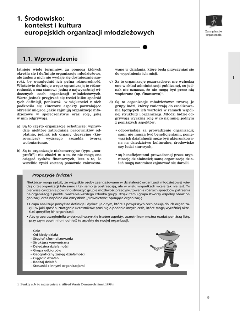 1. Ârodowisko: kontekst i kultura europejskich organizacji m∏odzie˝owych Zarzàdzanie organizacjà 1.1. Wprowadzenie Istnieje wiele terminów, za pomocà których okreÊla si´ i definiuje organizacje m∏odzie˝owe, ale ˝aden z nich nie wydaje si´ dostatecznie szeroki, by uwzgl´dniç ich pe∏nà ró˝norodnoÊç. W∏aÊciwie definicje wr´cz ograniczajà t´ ró˝norodnoÊç, a ona stanowi jednà z najwyraêniej widocznych cech organizacji m∏odzie˝owych. Warto jednak przyjrzeç si´ treÊci kilku spoÊród tych definicji, poniewa˝ w wi´kszoÊci z nich podkreÊla si´ kluczowe aspekty pozwalajàce okreÊliç miejsce, jakie zajmujà organizacje m∏odzie˝owe w spo∏eczeƒstwie oraz rol´, jakà w nim odgrywajà. wane w dzia∏ania, które b´dà przyczyniaç si´ do wype∏nienia ich misji. 1 c) Sà to organizacje pozarzàdowe: nie wchodzà one w sk∏ad administracji publicznej, co jednak nie oznacza, ˝e nie mogà byç przez nià wspierane (np. finansowo)1. d) Sà to organizacje m∏odzie˝owe: tworzà je grupy ludzi, którzy zmierzajà do zrealizowania ∏àczàcych ich wartoÊci w ramach wspólnej struktury i organizacji. M∏odzi ludzie odgrywajà wyraênà rol´ w co najmniej jednym z poni˝szych aspektów: a) Sà to cz´sto organizacje ochotnicze: wprawdzie niektóre zatrudniajà pracowników odp∏atnie, jednak ich organy decyzyjne (kierownicze) wy˝szego szczebla tworzà wolontariusze. b) Sà to organizacje niekomercyjne (typu „nonprofit”): nie chodzi tu o to, ˝e nie mogà one osiàgaç zysków finansowych, lecz o to, ˝e wszelkie zyski zostanà ponownie zainwesto- • odpowiadajà za prowadzenie organizacji; sami nie muszà byç beneficjentami, poniewa˝ ich dzia∏alnoÊç mo˝e byç ukierunkowana na dziedzictwo kulturalne, Êrodowisko czy ludzi starszych, • sà beneficjentami prowadzonej przez organizacj´ dzia∏alnoÊci; samà organizacjà dzia∏aƒ mogà natomiast zajmowaç si´ doroÊli. Propozycje çwiczeƒ Niektórzy mogà sàdziç, ˝e wszystkie osoby zaanga˝owane w dzia∏alnoÊç organizacji m∏odzie˝owej wiedzà o tej organizacji tyle samo i tak samo jà postrzegajà, ale w wielu wypadkach wcale tak nie jest. To pierwsze çwiczenie powinno stworzyç grupie mo˝liwoÊç przedyskutowania ró˝nych sposobów patrzenia na organizacj´ z punktu widzenia ka˝dego cz∏onka grupy. Dzi´ki temu grupa stworzy wspólny obraz organizacji oraz wspólne dla wszystkich „s∏ownictwo” opisujàce organizacj´. • Grupa analizuje powy˝sze definicje i dyskutuje o tym, które z powy˝szych cech pasujà do ich organizacji i w jaki sposób. Nast´pnie uczestników prosi si´ o podanie innych cech, które mogà wyraêniej okreÊlaç specyfik´ ich organizacji. • Aby grupa uwzgl´dni∏a w dyskusji wszystkie istotne aspekty, uczestnikom mo˝na rozdaç poni˝szà list´, przy czym powinni oni odnieÊç te aspekty do swojej organizacji. – Cele – Od kiedy dzia∏a – Stopieƒ sformalizowania – Struktura wewn´trzna – Dziedzina dzia∏alnoÊci – Grupa odbiorców – Geograficzny zasi´g dzia∏alnoÊci – Ciàg∏oÊç dzia∏aƒ – Rodzaj dzia∏aƒ – Stosunki z innymi organizacjami 1 Punkty a, b i c zaczerpni´to z: Alfred Vernis Domenech i inni, 1998 r. 9 Zarzàdzanie organizacjà GdybyÊmy porównali ró˝ne definicje i role czy funkcje organizacji m∏odzie˝owych w ca∏ej Europie, nietrudno by∏oby dostrzec, ˝e w ró˝nych krajach istniejà w tej kwestii bardzo odmienne poglàdy. Ta odmiennoÊç wp∏ywa w znacznym stopniu nie tylko na rol´, jakà organizacje m∏odzie˝owe odgrywajà w spo∏eczeƒstwie, ale tak˝e na to, w ja- 1 wiedz´ o nowych zjawiskach zachodzàcych w ich Êrodowisku, aby zmiany ich nie zaskoczy∏y bàdê te˝ nie umkn´∏y ich uwadze. Na przyk∏ad uruchomienie przez w∏adze publiczne nowego rodzaju us∏ug mo˝e oznaczaç zakoƒczenie problemu, który organizacja m∏odzie˝owa stara si´ rozwiàzaç poprzez swà dzia∏alnoÊç; jeÊli organi- Propozycje çwiczeƒ • Po uzgodnieniu najwa˝niejszych cech, które definiujà organizacj´ m∏odzie˝owà, powinniÊmy postàpiç krok naprzód i zastanowiç si´ nad rolà organizacji w spo∏eczeƒstwie. W tych rozwa˝aniach pomocne mogà byç nast´pujàce pytania: – Czy organizacje m∏odzie˝owe same tworzà przestrzeƒ do swej dzia∏alnoÊci, czy te˝ wype∏niajà pewnà luk´? – Czy prowadzà one pewnego rodzaju prace, które powinny byç wykonywane przez w∏adze? A mo˝e proponujà odpowiedzi i alternatywne rozwiàzania okreÊlonych problemów, które majà wp∏yw na nasze spo∏eczeƒstwa, a w szczególnoÊci na m∏odzie˝? – Na czym w istocie polega wk∏ad organizacji m∏odzie˝owych w podnoszenie ÊwiadomoÊci i obron´ praw? – Czy w spo∏eczeƒstwie istniejà inne grupy lub osoby, które ju˝ prowadzà takà dzia∏alnoÊç? JeÊli tak, czy te dzia∏ania sà prowadzone w taki sam sposób? Na czym polegajà ró˝nice? – Czy organizacje m∏odzie˝owe stwarzajà m∏odym ludziom mo˝liwoÊç odgrywania aktywnej roli w spo∏eczeƒstwie? – Dlaczego dzieje si´ tak, ˝e niektórzy ludzie pracujà na zasadzie wolontariuszy, a inni nie? – Czy praca ochotnicza jest przemijajàcà modà, czy te˝ jest to trwa∏y sposób uczestnictwa m∏odzie˝y? – Czy organizacje m∏odzie˝owe promujà i realizujà wartoÊci i postawy, które majà istotne znaczenie dla spo∏eczeƒstwa? – Czy organizacje m∏odzie˝owe stanowià faktycznie reprezentacj´ m∏odzie˝y w Europie, czy te˝ reprezentujà jedynie mniejszoÊç, która w nich uczestniczy? Czy w zwiàzku z tym organizacje m∏odzie˝owe mo˝na uznaç za prawdziwych rzeczników m∏odzie˝y, czy te˝ nie sà one uprawnione do odgrywania tej roli? ki sposób odgrywajà one t´ rol´. Warto pami´taç o ró˝nych scenariuszach, w które wpisuje si´ dzia∏alnoÊç organizacji m∏odzie˝owych w Europie, wszystkie te ró˝nice mogà bowiem mieç wp∏yw na sposób zarzàdzania organizacjam