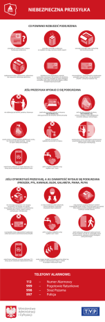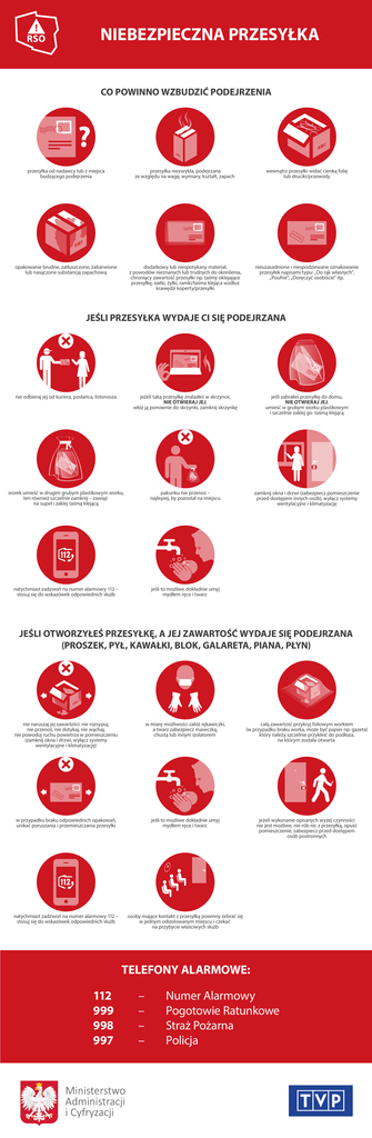 NIEBEZPIECZNA PRZESYŁKA CO POWINNO WZBUDZIĆ PODEJRZENIA przesyłka od nadawcy lub z miejsca budzącego podejrzenia przesyłka niezwykła, podejrzana ze względu na wagę, wymiary, kształt, zapach wewnątrz przesyłki widać cienką folię lub druciki/przewody opakowanie brudne, zatłuszczone, zabarwione lub nasączone substancją zapachową dodatkowy lub niespotykany materiał, z powodów nieznanych lub trudnych do określenia, chroniący zawartość przesyłki np. taśmy oklejające przesyłkę, siatki, żyłki, ramki/taśma klejąca wzdłuż krawędzi koperty/przesyłki nieuzasadnione i niespodziewane oznakowanie przesyłek napisami typu: „Do rąk własnych”, „Poufne”, „Doręczyć osobiście” itp. JEŚLI PRZESYŁKA WYDAJE CI SIĘ PODEJRZANA nie odbieraj jej od kuriera, posłańca, listonosza jeżeli taką przesyłkę znalazłeś w skrzynce, NIE OTWIERAJ JEJ, włóż ją ponownie do skrzynki, zamknij skrzynkę jeśli zabrałeś przesyłkę do domu, NIE OTWIERAJ JEJ, umieść w grubym worku plastikowym i szczelnie zaklej go taśmą klejącą worek umieść w drugim grubym plastikowym worku, ten również szczelnie zamknij – zawiąż na supeł i zaklej taśmą klejącą pakunku nie przenoś – najlepiej, by pozostał na miejscu zamknij okna i drzwi (zabezpiecz pomieszczenie przed dostępem innych osób), wyłącz systemy wentylacyjne i klimatyzację natychmiast zadzwoń na numer alarmowy 112 – stosuj się do wskazówek odpowiednich służb jeśli to możliwe dokładnie umyj mydłem ręce i twarz JEŚLI OTWORZYŁEŚ PRZESYŁKĘ, A JEJ ZAWARTOŚĆ WYDAJE SIĘ PODEJRZANA (PROSZEK, PYŁ, KAWAŁKI, BLOK, GALARETA, PIANA, PŁYN) nie naruszaj jej zawartości: nie rozsypuj, nie przenoś, nie dotykaj, nie wąchaj, nie powoduj ruchu powietrza w pomieszczeniu (zamknij okna i drzwi, wyłącz systemy wentylacyjne i klimatyzację) w miarę możliwości załóż rękawiczki, a twarz zabezpiecz maseczką, chustą lub innym izolatorem całą zawartość przykryj foliowym workiem (w przypadku braku worka, może być papier np. gazeta) który należy szczelnie przykleić do podłoża, na którym została otwarta w przypadku braku odpowiednich opakowań, unikać poruszania i przemieszczania przesyłki jeśli to możliwe dokładnie umyj mydłem ręce i twarz jeżeli wykonanie opisanych wyżej czynności nie jest możliwe, nie rób nic z przesyłką, opuść pomieszczenie, zabezpiecz przed dostępem osób postronnych natychmiast zadzwoń na numer alarmowy 112 – stosuj się do wskazówek odpowiednich służb osoby mające kontakt z przesyłką powinny zebrać się w jednym odizolowanym miejscu i czekać na przybycie właściwych służb TELEFONY ALARMOWE: 112 999 998 997 – – – – Numer Alarmowy Pogotowie Ratunkowe Straż Pożarna Policja
