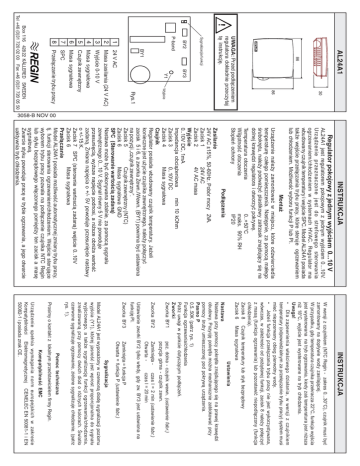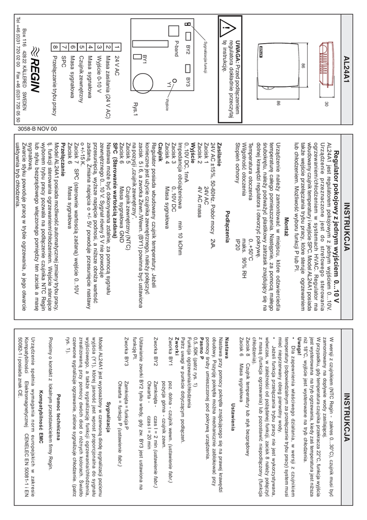 AL24A1 86 BY3 # 30 86 Wyjście UWAGA: Przed podłączeniem regulatora dokładnie przeczytaj tę instrukcję. Sygnalizacjia funkcji BY2 Y1 Rys.1 Przełączanie trybu pracy SPC Masa sygnałowa Czujnik zewnętrzny Masa sygnałowa Wyjście 0-10 V Masa zasilania (24 V AC) 24 V AC BY1 P-band 1 2 3 4 5 6 7 8 Fax +46 (0)31 720 05 50 Box 116 428 22 KÅLLERED SWEDEN Tel +46 (0)31 720 02 00 3058-B NOV 00 INSTRUKCJA Regulator pokojowy z jednym wyjściem 0...10 V AL24A1 jest regulatorem pokojowym z jednym wyjściem 0...10V. Urządzenie przeznaczone jest do strefowego sterowania ogrzewaniem/chłodzeniem w systemach HVAC. Regulator ma wbudowany czujnik temperatury i wejście SPC. Model AL24A1 posiada także wejście przełączania trybu pracy, które steruje ogrzewaniem lub chłodzeniem. Możliwość wyboru funkcji P lub PI. Montaż Urządzenie należy zamontować w miejscu, które odzwierciedla temperaturę całego pomieszczenia. Następnie, za pomocą małego śrubokrętu, należy podważyć plastikowy zatrzask znajdujący się na dolnej krawędzi regulatora i otworzyć pokrywę. Temperatura otoczenia 0..+50°C Wilgotność otoczenia maks. 90% RH Stopień ochrony IP20 Podłączenia Zasilanie 24V AC ±15%, 50-60Hz. Pobór mocy 2VA. Zacisk 1 24V AC Zacisk 2 4V AC masa Wyjście 0..10V DC, 1mA Impedancja obciążeniowa min 10 kOhm Zacisk 3 0..10V DC Zacisk 4 Masa sygnałowa Czujnik Regulator posiada wbudowany czujnik temperatury. Jeżeli konieczne jest użycie czujnika zewnętrznego, należy połączyć zacisk 5 i 6, a zworka Zewn./Wewn. (BY1) powinna być ustawiona na pozycji „czujnik zewnętrzny”. Zacisk 5 Czujnik zewnętrzny (NTC) Zacisk 6 Masa sygnałowa GND SPC (Sterowanie wartością zadaną) Nastawa może być dokonywana zdalnie, za pomocą sygnału zewnętrznego 0...10 V. Sygnał równy 5 V nie powoduje przesunięcią, wyższe napięcie podnosi, a niższe obniża wartość zadaną. Zmiana napięcia o +/- 5V powoduje przesunięcie nastawy o +/-15 K. Zacisk 7 SPC (sterownie wartoscią zadaną) wejście 0..10V Zacisk 6 Masa sygnałowa Przełączanie Model AL24A1 posiada możliwość automatycznej zmiany trybu pracy, tj. funkcji sterowania ogrzewaniem/chłodzeniem. Wejście sterujące wyborem trybu pracy pozwala na podłączenie czujnika NTC Regin lub styku bezprądowego włączonego pomiędzy ten zacisk a masę sygnałową. Zwarcie styku powoduje pracę w trybie ogrzewania, a jego otwarcie uaktywnia tryb chłodzenia. INSTRUKCJA W wersji z czujnikiem (NTC Regin - zakres 0...30°C), czujnik musi być zamontowany na dopływie wody zasilającej. W przypadku, gdy temperatura czujnika przekracza 22°C, funkcja wyjścia jest wysterowana na tryb ogrzewania, kiedy zaś temperatura jest niższa niż 18°C, wyjście jest wysterowane na tryb chłodzenia. Uwaga! • Dla zapewnienia właściwego działania, w wersji z czujnikiem temperatury (odpowiedzialnym za przełączanie trybu pracy) system musi mieć nieprzerwany obieg pierwotny wody. • Jeżeli funkcja przełączania trybu pracy nie jest wykorzystywana, wówczas, w zależności od pożądanej funkcji, zacisk 8 należy połączyć z masą (funkcja ogrzewania) lub pozostawić niepodłączony (funkcja chłodzenia). Zacisk 8 Czujnik temperatury lub styk bezprądowy Zacisk 6 Masa sygnałowa Zamknięta Otwarta - czas I = 2 min (ustawienie fabr.) czas I = 20 min Ustawienia Nastawa Nastawa przy pomocy pokrętła znajdującego się na prawej krawędzi obudowy. Pozycję pokrętła można mechanicznie zablokować przy pomocy śruby umieszczonej pod pokrywą urządzenia. Pasmo P 0,5..50K (patrz rys. 1) Funkcja ogrzewania/chłodzenia Patrz uwagi w punkcie dotyczącym podłączeń. Zworki Zworka BY1 poz. dolna - czujnik wewn. (ustawienie fabr.) pozycja górna - czujnik zewn. Zworka BY2 Zamknięta = funkcja P Otwarta = funkcja P (ustawienie fabr.) Ustawianie zworki BY2 tylko wtedy, gdy zw. BY3 jest ustawiona na funkcję PI. Zworka BY3 Sygnalizacja Model AL24A1 jest wyposażony w czerwoną diodę sygnalizacji poziomu wyjścia (Y1), której jasność jest wprost proporcjonalna do sygnału wyjściowego, a także sygnalizację funkcji ogrzewania/chłodzenia, zrealizowaną przy pomocy dwóch diod o różnych kolorach. Światło czerwone sygnalizuje ogrzewanie, zielone sygnalizuje chłodzenie. (patrz rys. 1). Pomoc techniczna Kompatybilność EMC Prosimy o kontakt z lokalnym przedstawicielem firmy Regin. Urządzenie spełnia wymagania norm europejskich w zakresie Kompatybilności Elektromagnetycznej CENELEC EN 50081-1 i EN 50082-1 i posiada znak CE.