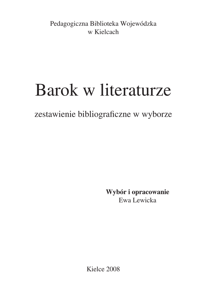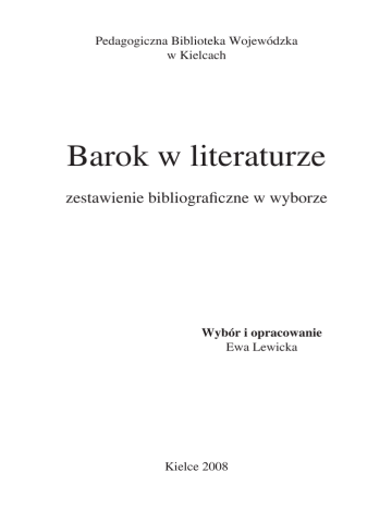 Pedagogiczna Biblioteka Wojewódzka w Kielcach Barok w literaturze zestawienie bibliograficzne w wyborze Wybór i opracowanie Ewa Lewicka Kielce 2008 2 1. Barok w polskiej kulturze, literaturze i języku : materiały z konferencji naukowej 25-29 sierpnia 1987 w Krakowie : praca zbiorowa / pod red. Mariana Stępnia, Stanisława Urbańczyka. – Warszawa : Wydawnictwo Naukowe PWN, 1992. – ISBN 83-01-11011-2 PBW – Czytelnia 211069 2. Borowski, Andrzej : O literackich, artystycznych i ideowych wyznacznikach baroku // W : Literackie wizje i re-wizje : materiały pomocnicze dla szkoły średniej / praca zbiorowa pod red. Mariana Stępnia i Wacława Waleckiego. – Warszawa : Wydawnictwa Szkolne i Pedagogiczne, 1980. – S. 38-48. – ISBN 83-02-00371-9 PBW – Czytelnia 150191, Wypożyczalnia 150192-150193, 224669 3. Chałońska, Joanna : Barok anachroniczny czy bliski współczesności? / Joanna Chałońska // „Język Polski w Szkole Średniej”. – 1986/87, z. 3, s. 28-34 [Nawiązanie do baroku w liryce współczesnej] 4. Dąbrowska, Elżbieta :Teksty w ruchu : powroty baroku w polskiej poezji współczesnej / Elżbieta Dąbrowska. – Opole : Wydawnictwo Uniwersytetu Opolskiego, 2001. – ISBN 838879616X [Intertekstualność w literaturze. Tradycja sarmacka w twórczości współczesnych poetów: J. Harasymowicza i E. Brylla. Topos śmierci w utworach twórców: M. Sępa-Szarzyńskiego (barok) i J. Baki (oświecenie) i we współczesnej poezji (S. Grochowiak, J. M. Rymkiewicz, Cz. Miłosz, A. Kamieńska, E. Stachura i in.). Tradycja baroku w polskiej poezji współczesnej] Biblioteka AŚ – Czytelnia Główna 315484 5. Dobrzycki, Stanisław : Z historii literatury polskiej / Stanisław Dobrzycki. – Warszawa : Państwowe Wydawnictwo Naukowe, 1986. – S. 192-241 : Barok. – ISBN 83-01-06040-9 PBW – Wypożyczalnia 188730-188732 3 6. Hernas, Czesław : Literatura baroku / Czesław Hernas. – Warszawa : Państwowe Wydawnictwo Naukowe, 1987. – ISBN 83-01-07680-1 PBW – Czytelnia 192473, Wypożyczalnia 192474-192477 7. Kram-Mikoś, Elżbieta : Barok różnie dzisiaj widziany / Elżbieta KramMikoś // „Język Polski w Szkole Średniej”. – 1986/87, z. 4, s. 55-65 [Barok w poezji S. Grochowiaka, J. Harasymowicza, J. Lechonia, W. Szymborska] 8. Krzewińska, Anna : Bohater literacki polskiego baroku : barok, korepetycje / Anna Krzewińska // „Fakty”. – 1983, nr 47, s. 6-7 9. Narbutt, Olgierd : Barok : sztuka, literatura, filozofia / Olgierd Narbutt. – Wrocław : Zakład Narodowy im. Ossolińskich, 1976 PBW – Czytelnia 129774, Wypożyczalnia 131057, 129775 10. Pelc, Janusz : Barok : epoka przeciwieństw / Janusz Pelc. – Warszawa : „Czytelnik”, 1993. – ISBN 83-07-02309-2 PBW – Czytelnia 214325, Wypożyczalnia 217420 11. Pietrzyk, Dariusz : Od średniowiecza do baroku / Dariusz Pietrzyk. – Kraków : „Greg”, 1992. – ISBN 83-86197-00-5 PBW – Czytelnia 210529 12. Rytel, Jadwiga : Barok // W: Literatura polska. T. 1 : Od średniowiecza do oświecenia / Zdzisław Libera, Jadwiga Pietrusiewiczowa, Jadwiga Rytel. – Warszawa : Państwowe Wydawnictwo Naukowe, 1988. – S. 123-216. – ISBN 83-01-07621-6 PBW – Czytelnia 197254, Wypożyczalnia 197255-197258 13. Sajkowski, Alojzy : Barok / Alojzy Sajkowski. – Warszawa : Państwowe Zakłady Wydawnictw Szkolnych, 1972 PBW – Wypożyczalnia 95459, 94328, 94332 4 14. Słowiński, Lech : Przed maturą : wędrówki po epokach literatury polskiej / Lech Słowiński. – Poznań : Krajowa Agencja Wydawnicza, 1987. – S. 48-78: Barok. – ISBN 83-01444-7 PBW Czytelnia 188664, Wypożyczalnia 188665-188668 15. Starnawski, Jerzy : Barok w literaturze / Jerzy Starnawski. – Kraków : Państwowe Wydawnictwo Naukowe, 1973 PBW – Czytelnia 96853, Wypożyczalnia 96851-96852 16. Żukowska, Kazimiera : Poeci polscy manieryzmu i baroku: style i postawy / Kazimiera Żukowska // „Przegląd Humanistyczny”. – 1986, nr 7/8, s. 33-53