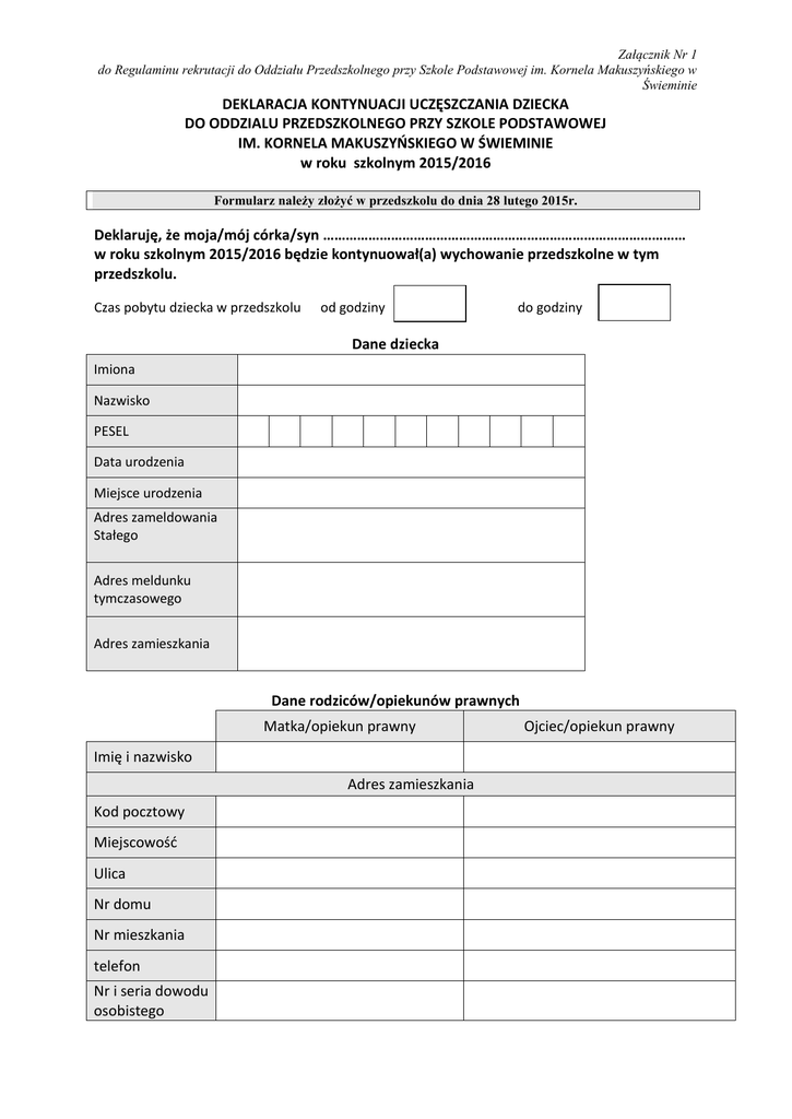Załącznik Nr 1 do Regulaminu rekrutacji do Oddziału Przedszkolnego przy Szkole Podstawowej im. Kornela Makuszyńskiego w Świeminie DEKLARACJA KONTYNUACJI UCZĘSZCZANIA DZIECKA DO ODDZIALU PRZEDSZKOLNEGO PRZY SZKOLE PODSTAWOWEJ IM. KORNELA MAKUSZYŃSKIEGO W ŚWIEMINIE w roku szkolnym 2015/2016 Formularz należy złożyć w przedszkolu do dnia 28 lutego 2015r. Deklaruję, że moja/mój córka/syn …………………………………………………………………………………… w roku szkolnym 2015/2016 będzie kontynuował(a) wychowanie przedszkolne w tym przedszkolu. Czas pobytu dziecka w przedszkolu od godziny do godziny Dane dziecka Imiona Nazwisko PESEL Data urodzenia Miejsce urodzenia Adres zameldowania Stałego Adres meldunku tymczasowego Adres zamieszkania Dane rodziców/opiekunów prawnych Matka/opiekun prawny Imię i nazwisko Adres zamieszkania Kod pocztowy Miejscowość Ulica Nr domu Nr mieszkania telefon Nr i seria dowodu osobistego Ojciec/opiekun prawny Istotne informacje o Załącznik Nr 1 stanie zdrowia do Regulaminu dziecka; rekrutacji do Oddziału Przedszkolnego przy Szkole Podstawowej im. Kornela Makuszyńskiego w Świeminie Stosowanej diecie Deklaracje , zobowiązania rodziców Upoważniam do odbioru z przedszkola mojego dziecka, wymienione obok osoby (poza rodzicami /opiekunami prawnymi). 1............................................................... Bierzemy na siebie pełną odpowiedzialność prawną za bezpieczeństwo odebranego dziecka, od momentu jego odbioru przez wskazaną, upoważnioną przez nas osobę . 3 .............................................................. 2 .............................................................. 4 .............................................................. 5…………………………………………….. Wyrażam zgodę na udział mojego dziecka w wycieczkach organizowanych w przedszkolu. Tak * Nie * Wyrażam zgodę na umieszczenie na stronie internetowej przedszkola (gminy) i w prasie wizerunku mojego dziecka. Tak * Nie * Wyrażam zgodę na sprawdzanie czystości głowy mojego dziecka przez pielęgniarkę oraz wychowawczynię grupy w przedszkolu. Tak* Nie* Zgodnie z przepisami ustawy z dnia 29 sierpnia 1997r. o ochronie danych osobowych ( Dz. U. Nr 133,poz.883) wyrażam zgodę na wykorzystanie moich danych osobowych w zakresie niezbędnym do pracy przedszkola i zachowania …………………………………………………………………… bezpieczeństwa mojego dziecka. Data Czytelny podpis Zobowiązuję się do: Przestrzegania postanowień statutu szkoły Regularnego uiszczania wymaganych opłat w wyznaczonym terminie Uczestniczenia w zebraniach rodziców Przyprowadzania i odbierania dziecka z przedszkola osobiście lub przez osobę, zgłoszoną powyżej, zapewniającą dziecku bezpieczeństwo. Zobowiązuje się do niezwłocznego informowania przedszkola na piśmie o zmianach danych osobowych, danych adresowych. Zobowiązuje się również do pisemnego poinformowania przedszkola, z miesięcznym wyprzedzeniem o rezygnacji z miejsca w przedszkolu Oświadczam, że informacje przedstawione w niniejszej karcie zgłoszenia są zgodne ze stanem faktycznym. (Za podanie nieprawdziwych danych mogą być wyciągnięte odpowiednie konsekwencje włącznie ze skreśleniem dziecka z listy przedszkolaków) Świemino ,dnia............................ ……………………………………… Czytelny podpis rodziców / opiekunów * Informacja o przyjęciu dziecka: