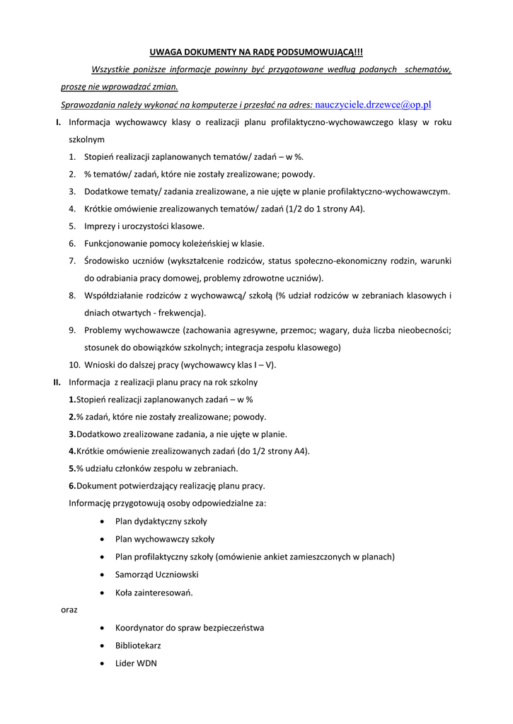 UWAGA DOKUMENTY NA RADĘ PODSUMOWUJĄCĄ!!! Wszystkie poniższe informacje powinny być przygotowane według podanych schematów, proszę nie wprowadzać zmian. Sprawozdania należy wykonać na komputerze i przesłać na adres: [email protected] I. Informacja wychowawcy klasy o realizacji planu profilaktyczno-wychowawczego klasy w roku szkolnym 1. Stopień realizacji zaplanowanych tematów/ zadań – w %. 2. % tematów/ zadań, które nie zostały zrealizowane; powody. 3. Dodatkowe tematy/ zadania zrealizowane, a nie ujęte w planie profilaktyczno-wychowawczym. 4. Krótkie omówienie zrealizowanych tematów/ zadań (1/2 do 1 strony A4). 5. Imprezy i uroczystości klasowe. 6. Funkcjonowanie pomocy koleżeńskiej w klasie. 7. Środowisko uczniów (wykształcenie rodziców, status społeczno-ekonomiczny rodzin, warunki do odrabiania pracy domowej, problemy zdrowotne uczniów). 8. Współdziałanie rodziców z wychowawcą/ szkołą (% udział rodziców w zebraniach klasowych i dniach otwartych - frekwencja). 9. Problemy wychowawcze (zachowania agresywne, przemoc; wagary, duża liczba nieobecności; stosunek do obowiązków szkolnych; integracja zespołu klasowego) 10. Wnioski do dalszej pracy (wychowawcy klas I – V). II. Informacja z realizacji planu pracy na rok szkolny 1. Stopień realizacji zaplanowanych zadań – w % 2. % zadań, które nie zostały zrealizowane; powody. 3. Dodatkowo zrealizowane zadania, a nie ujęte w planie. 4. Krótkie omówienie zrealizowanych zadań (do 1/2 strony A4). 5. % udziału członków zespołu w zebraniach. 6. Dokument potwierdzający realizację planu pracy. Informację przygotowują osoby odpowiedzialne za: Plan dydaktyczny szkoły Plan wychowawczy szkoły Plan profilaktyczny szkoły (omówienie ankiet zamieszczonych w planach) Samorząd Uczniowski Koła zainteresowań. Koordynator do spraw bezpieczeństwa Bibliotekarz Lider WDN oraz III. Sprawozdanie finansowe - sklepik uczniowski IV. Informacja dotycząca realizacji zajęć rewalidacyjnych 1. Liczba przeprowadzonych zajęć (dla każdego ucznia) 2. Cele zajęć oraz stopień ich realizacji 3. Wnioski do dalszej pracy V. Informacja nauczycieli na temat zajęć przeprowadzonych z własnej inicjatywy 1. Liczba minut przeprowadzonych zajęć. 2. Uczestnicy zajęć. 3. Krótkie omówienie zrealizowanych zadań. 4. Gdzie zostały udokumentowane (jeżeli w dzienniku art. 42 – to proszę je podkreślić na zielono) VI. Sprawozdanie ze sprawdzianu klasy VI oraz poróżnienie w stosunku do 2 poprzednich lat. Wnioski do dalszej pracy VII. Zestawienia statystyczne 1. Zestawienie konkursów 2. Zestawienie uroczystości 3. Zestawienie wycieczek 4. Zestawienie wyników badań osiągnięć uczniów wraz z porównaniem za 2 poprzednie lata i wnioski do dalszej pracy 5. Zestawienie zawodów sportowych 6. Zestawienie wyników sprawdzianów próbnych 7. Zestawienie – godzin zrealizowanych i niezrealizowanych na podstawie dzienników 8. VIII. Zestawienie ankiety dla nauczycieli – realizacja podstawy programowej IX. Realizacja art. 42