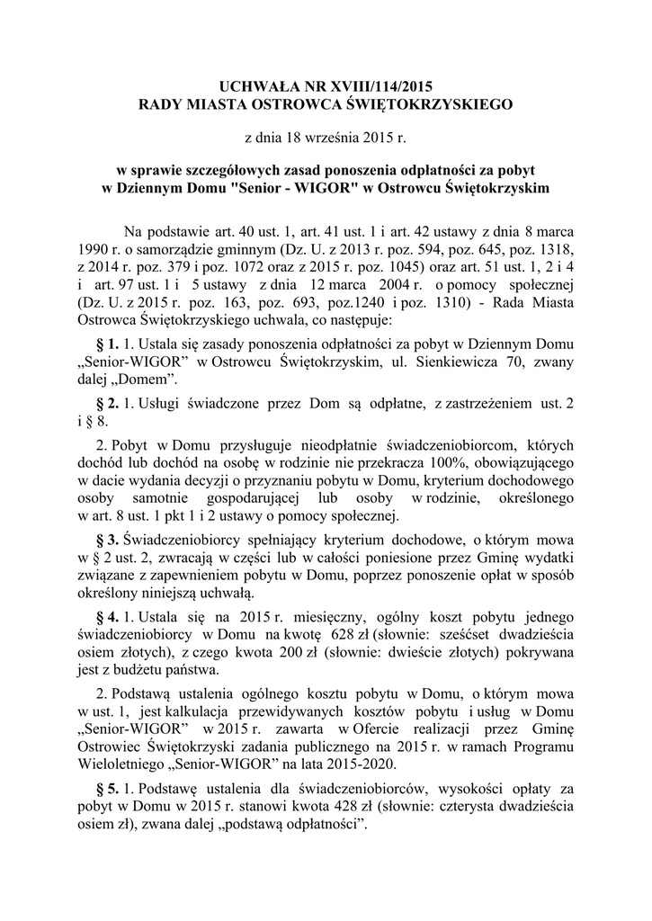 UCHWAŁA NR XVIII/114/2015 RADY MIASTA OSTROWCA ŚWIĘTOKRZYSKIEGO z dnia 18 września 2015 r. w sprawie szczegółowych zasad ponoszenia odpłatności za pobyt w Dziennym Domu "Senior - WIGOR" w Ostrowcu Świętokrzyskim Na podstawie art. 40 ust. 1, art. 41 ust. 1 i art. 42 ustawy z dnia 8 marca 1990 r. o samorządzie gminnym (Dz. U. z 2013 r. poz. 594, poz. 645, poz. 1318, z 2014 r. poz. 379 i poz. 1072 oraz z 2015 r. poz. 1045) oraz art. 51 ust. 1, 2 i 4 i art. 97 ust. 1 i 5 ustawy z dnia 12 marca 2004 r. o pomocy społecznej (Dz. U. z 2015 r. poz. 163, poz. 693, poz.1240 i poz. 1310) - Rada Miasta Ostrowca Świętokrzyskiego uchwala, co następuje: § 1. 1. Ustala się zasady ponoszenia odpłatności za pobyt w Dziennym Domu „Senior-WIGOR” w Ostrowcu Świętokrzyskim, ul. Sienkiewicza 70, zwany dalej „Domem”. § 2. 1. Usługi świadczone przez Dom są odpłatne, z zastrzeżeniem ust. 2 i § 8. 2. Pobyt w Domu przysługuje nieodpłatnie świadczeniobiorcom, których dochód lub dochód na osobę w rodzinie nie przekracza 100%, obowiązującego w dacie wydania decyzji o przyznaniu pobytu w Domu, kryterium dochodowego osoby samotnie gospodarującej lub osoby w rodzinie, określonego w art. 8 ust. 1 pkt 1 i 2 ustawy o pomocy społecznej. § 3. Świadczeniobiorcy spełniający kryterium dochodowe, o którym mowa w § 2 ust. 2, zwracają w części lub w całości poniesione przez Gminę wydatki związane z zapewnieniem pobytu w Domu, poprzez ponoszenie opłat w sposób określony niniejszą uchwałą. § 4. 1. Ustala się na 2015 r. miesięczny, ogólny koszt pobytu jednego świadczeniobiorcy w Domu na kwotę 628 zł (słownie: sześćset dwadzieścia osiem złotych), z czego kwota 200 zł (słownie: dwieście złotych) pokrywana jest z budżetu państwa. 2. Podstawą ustalenia ogólnego kosztu pobytu w Domu, o którym mowa w ust. 1, jest kalkulacja przewidywanych kosztów pobytu i usług w Domu „Senior-WIGOR” w 2015 r. zawarta w Ofercie realizacji przez Gminę Ostrowiec Świętokrzyski zadania publicznego na 2015 r. w ramach Programu Wieloletniego „Senior-WIGOR” na lata 2015-2020. § 5. 1. Podstawę ustalenia dla świadczeniobiorców, wysokości opłaty za pobyt w Domu w 2015 r. stanowi kwota 428 zł (słownie: czterysta dwadzieścia osiem zł), zwana dalej „podstawą odpłatności”. 2. Opłata za pobyt w Domu w 2015 r. stanowi iloczyn podstawy odpłatności i procentowych wskaźników odpłatności, o których mowa w załączniku do uchwały. § 6. Prezydent Miasta w każdym następnym roku kalendarzowym, w terminie do końca lutego, dokonuje analizy kalkulacji kosztu, o którym mowa w § 4, i przedstawia Radzie Miasta, celem podjęcia uchwały zmieniającej jego wysokość. § 7. 1. Opłata za pobyt w Domu dokonywana jest z dołu za okres każdego miesiąca kalendarzowego. 2. Opłatę za pobyt świadczeniobiorcy w Domu, może być uiszczana w siedzibie Domu, w kasie Miejskiego Ośrodka Pomocy Społecznej w Ostrowcu Świętokrzyskim, ul. Świętokrzyska 22, zwanego dalej „MOPS” lub przelewem na konto MOPS Nr 28 1240 1372 1111 0010 4658 0600 - w terminie do 15 dnia każdego miesiąca kalendarzowego, za miesiąc poprzedni. 3. W razie nieuiszczenia odpłatności przez świadczeniobiorcę przez okres co najmniej 3 miesięcy i przy jednoczesnym braku podstaw do odstąpienia przez MOPS od żądania jej zwrotu, MOPS egzekwuje zaległe opłaty za pobyt w Domu. § 8. 1. Zwalnia się z opłat za pobyt w Domu świadczeniobiorców, u których miesięczna kwota ich dochodu lub dochodu na osobę w rodzinie, pozostająca do ich dyspozycji po poniesieniu udokumentowanych, niezbędnych opłat związanych z bieżącym utrzymaniem mieszkania i wydatków związanych z zakupem leków, pieluchomajtek, środków sanitarno-opatrunkowych, artykułów medycznych jednorazowego użytku oraz po ewentualnym poniesieniu opłaty za pobyt w Domu byłaby niższa niż 50% kwoty kryterium dochodowego osoby samotnej gospodarującej, określonego w art. 8 ust. 1 pkt 1 ustawy o pomocy społecznej. 2. Częściowe zwolnienie świadczeniobiorców z opłaty za pobyt w Domu, może nastąpić w przypadkach: 1) konieczności ponoszenia przez świadczeniobiorców odpłatności za pobyt członka rodziny w domu pomocy społecznej, ośrodku wsparcia lub wszelkiego typu placówkach opiekuńczo-wychowawczych, leczniczorehabilitacyjnych, opiekuńczo-leczniczych lub pielęgnacyjno-opiekuńczych, 2) korzystania z usług opiekuńczych lub specjalistycznych usług opiekuńczych przez więcej niż jedną osobę w rodzinie świadczeniobiorcy, w tym co najmniej jedną przewlekle chorą, 3) zdarzenia losowego w rodzinie. 3. Usprawiedliwiona nieobecność świadczeniobiorcy w Domu, trwająca powyżej 5 dni, skutkuje proporcjonalnym zmniejszeniem opłaty za pobyt. § 9. Wykonanie uchwały powierza się Prezydentowi Miasta Ostrowca Świętokrzyskiego. § 10. Uchwała podlega ogłoszeniu w Dzienniku Urzędowym Województwa Świętokrzyskiego. § 11. Uchwała wchodzi w życie po upływie 14 dni od dnia ogłoszenia. Wiceprzewodniczący Rady Miasta Ostrowca Świętokrzyskiego Stanisław Choinka Załącznik do uchwały Nr XVIII/114/2015 Rady Miasta Ostrowca Świętokrzyskiego z dnia 18 września 2015 r. Procentowe wskaźniki odpłatności za pobyt w Dziennym Domu „Senior - WIGOR” w Ostrowcu Świętokrzyskim, ul. Sienkiewicza 70 I. Tabela wskaźników gospodarujących: odpłatności dla świadczeniobiorców samotnie Dochód netto świadczeniobiorcy (osoby samotnej) w stosunku procentowym do kryterium dochodowego, określonego w art. 8 ust. 1 pkt 1 ustawy o pomocy społecznej Wskaźniki odpłatności za pobyt liczone w procentach od ogólnego miesięcznego kosztu pobytu w Domu* powyżej 100 % - 150% powyżej 150% - 200% powyżej 200% - 250% powyżej 250% - 300% powyżej 300% - 350% powyżej 350% - 400% powyżej 400% - 450% powyżej 450% 10% 15% 20% 30% 40% 50% 90% 100% II. Tabela odpłatności dla świadczeniobiorców w rodzinie