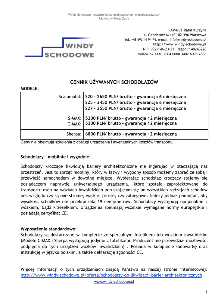 Windy Schodowe - urządzenia dzenia dla osób starszych i niepełnosprawnych Ułatwiamy Twoje Życie RAV-NET Rafał Kurzyna ul. Geodetów 6/143, 02-396 02 Warszawa tel. +48 692 44 94 74, e-mail: [email protected] http://www.windy http://www.windy-schodowe.pl NIP: 722--146-23-23, Regon: 140243228 mBank 62 1140 2004 0000 3402 6095 7666 CENNIK UŻYWANYCH SCHODOŁAZÓW MODELE: Scalamobil S20 – 2650 PLN/ brutto – gwarancja 6 miesięczna Scalamobil: S25 – 3450 PLN/ brutto – gwarancja 6 miesięczna S27 – 3550 PLN/ brutto – gwarancja 6 miesięczna S-MAX MAX: 5200 PLN/ brutto – gwarancja 12 miesięczna C-MAX: MAX: 5200 PLN/ brutto – gwarancja 12 miesięczna Sherpa 6800 PLN/ brutto – gwarancja 12 miesięczna Sherpa: Ceny nie obejmują szkolenia z obsługi urz urządzenia dzenia i ewentualnych kosztów transportu. Schodołazy – mobilnie i wygodnie: Schodołazy kroczące likwidują bariery architektoniczne nie ingerując w otaczającą nas przestrzeń. Jest est to sprzęt mobilny, który w łatwy i wygodny sposób możemy zabrać ze sobą i przewieźć samochodem w dowolne miejsce. Wybierając schodołaz kroczący stajemy się posiadaczem naprawdę uniwersalnego urządzenia, które zostało zaprojektowane zaproje do transportu osób na wózkach inwalidzkich poruszającym się po wszystkich rodzajach schodów bez względu czy są one strome, wąskie, proste, czy zabiegowe. Należy jednak pamiętać, aby wysokość schodków nie przekraczała 19 centymetrów. Schodołazy występują wyst opcjonalnie z wózkiem, bądź krzesełkiem. Urządzenia spełniają wszelkie wymagane normy europejskie i posiadają certyfikat CE. Wyposażenie standardowe: Schodołazy są dostarczane w komplecie ze specjalnym fotelikiem lub wózkiem inwalidzkim (Modele C-MAX i Sherpa występują jedynie z fotelikami. Producent roducent nie przewidział możliwości podpięcia do tych urządzeń wózków inwalidzkich) . Posiada w komplecie ładowarkę oraz instrukcję w języku polskim, a także deklarację zgodności CE. Więcej informacji o tych urządzeniach znajdą Państwo na naszej stronie internetowej: internetowej http://www.windy-schodowe.pl/oferta/schodolazy schodowe.pl/oferta/schodolazy-do-likwidacji-barier barier-architektonicznych www.windy-schodowe.pl 1 Windy Schodowe - urządzenia dla osób starszych i niepełnosprawnych Ułatwiamy Twoje Życie Przykładowy film pokazujący działanie tego urządzenia znajdą Państwo na stronie: http://www.youtube.com/watch?v=x1vLjqwc4Fs Przykładowe zdjęcia schodołazów: Scalamobil S27 S-MAX www.windy-schodowe.pl 2 Windy Schodowe - urządzenia dla osób starszych i niepełnosprawnych Ułatwiamy Twoje Życie Sherpa Z poważaniem Grzegorz Krzemiński tel.: +48 606 248 022 www.windy-schodowe.pl g.krzeminski@windy-schodowe www.windy-schodowe.pl 3