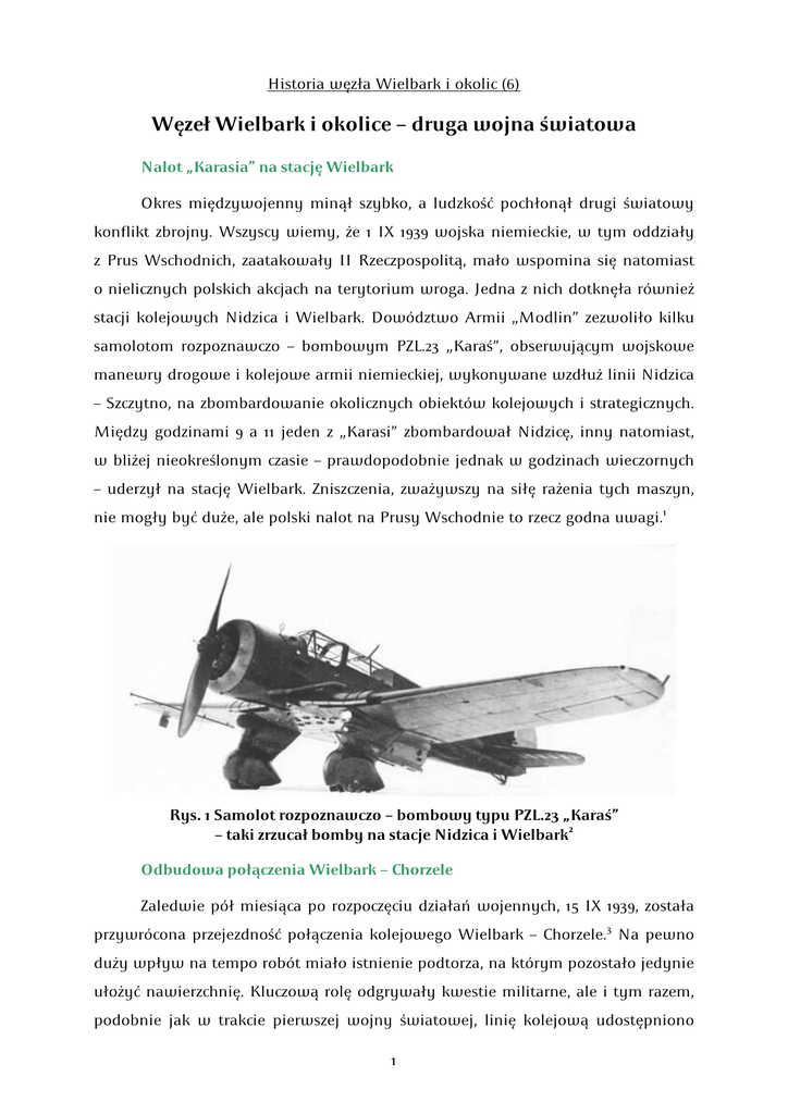 Historia węzła Wielbark i okolic (6) Węzeł Wielbark i okolice – druga wojna światowa Nalot „Karasia” na stację Wielbark Okres międzywojenny minął szybko, a ludzkość pochłonął drugi światowy konflikt zbrojny. Wszyscy wiemy, że 1 IX 1939 wojska niemieckie, w tym oddziały z Prus Wschodnich, zaatakowały II Rzeczpospolitą, mało wspomina się natomiast o nielicznych polskich akcjach na terytorium wroga. Jedna z nich dotknęła również stacji kolejowych Nidzica i Wielbark. Dowództwo Armii „Modlin” zezwoliło kilku samolotom rozpoznawczo – bombowym PZL.23 „Karaś”, obserwującym wojskowe manewry drogowe i kolejowe armii niemieckiej, wykonywane wzdłuż linii Nidzica – Szczytno, na zbombardowanie okolicznych obiektów kolejowych i strategicznych. Między godzinami 9 a 11 jeden z „Karasi” zbombardował Nidzicę, inny natomiast, w bliżej nieokreślonym czasie – prawdopodobnie jednak w godzinach wieczornych – uderzył na stację Wielbark. Zniszczenia, zważywszy na siłę rażenia tych maszyn, nie mogły być duże, ale polski nalot na Prusy Wschodnie to rzecz godna uwagi.1 Rys. 1 Samolot rozpoznawczo – bombowy typu PZL.23 „Karaś” – taki zrzucał bomby na stacje Nidzica i Wielbark2 Odbudowa połączenia Wielbark – Chorzele Zaledwie pół miesiąca po rozpoczęciu działań wojennych, 15 IX 1939, została przywrócona przejezdność połączenia kolejowego Wielbark – Chorzele.3 Na pewno duży wpływ na tempo robót miało istnienie podtorza, na którym pozostało jedynie ułożyć nawierzchnię. Kluczową rolę odgrywały kwestie militarne, ale i tym razem, podobnie jak w trakcie pierwszej wojny światowej, linię kolejową udostępniono 1 również do prowadzenia handlowych przewozów pasażerskich. Wielbark odzyskał tym samym status stacji węzłowej. Parametry techniczne linii wielbarskiego węzła z lat czterdziestych XX wieku przedstawia prezentowana niżej tabela.3 3 Parametry techniczne linii węzła Wielbark (lata czterdzieste XX wieku) Parametr linii kolejowej Nidzica – Szczytno Ostrołęka – Wielbark numer 25a 25b status kolej boczna kolej boczna długość (km) 63,56 71,10 liczba torów szlakowych 1 1 elektryfikacja nie nie prędkość szlakowa (km/h) 50 40/50 blokada liniowa nie nie długość odcinków poziomych (m) 30 712 25 244 długość prostych (m) 50 146 53 042 największa pochyłość 1:100 (10‰) 1:30 (33‰) najmniejszy promień łuku (m) 400 500 Rys. 2 Ciekawostka: chociaż brytyjska wojskowa mapa lotnicza z 1944 roku uwzględnia odbudowane połączenie Wielbark – Chorzele, to jednak jest ono pokazane jedynie w sposób przybliżony („alignment approximate”)4 2 Budowa nowych mijanek: Bartoszki, Jagarzewo, Siódmak Wybuch drugiej wojny światowej spowodował zdecydowany wzrost rangi kolejowych linii rokadowych, które w czasie pokoju znajdowały się na marginesie potrzeb, funkcjonując głównie w ruchu lokalnym o niewielkim natężeniu. Sytuacja zmieniła się całkowicie, gdy od dróg żelaznych zaczęło zależeć powodzenie działań militarnych. W tym przypadku nie mogło być mowy o problemach z obsłużeniem potrzebnej liczby połączeń, drugorzędną rolę odgrywały również koszty. Szukano sposobów zwiększenia przepustowości i dlatego podejmowano decyzje o budowie nowych posterunków ruchu, w większości przeznaczonych wyłącznie dla potrzeb wojska, nie spełniających funkcji handlowych. Realizując taką politykę na początku sierpnia 1940 roku Dyrekcja Kolejowa w Królewcu wystosowała do Oddziałów Ruchu (Betriebsämter) w Olsztynie i Szczytnie pismo zobowiązujące do wykonania następujących zadań „wzmacniających strategicznie” infrastrukturę kolejową: na linii Nidzica – Działdowo: a) rozbudowa stacji granicznej Zakrzewo – Sarnowo (Bfs Sakrau – Sarnau), b) budowa mijanki w kilometrze 63,400 – Olszewo (Struben), na linii Nidzica – Wielbark: a) budowa mijanki w kilometrze 10,500 – Bartoszki (Bartzdorf), b) budowa mijanki w kilometrze 21,400 – Jagarzewo (Jagersdorf), c) budowa mijanki w kilometrze 58,250 – Siódmak (Schodmack), na linii Olsztyn – Pisz: a) budowa mijanki w kilometrze 66,200 – Górki (Gurken), b) budowa mijanki w kilometrze 82,000 – Nida (Nieden). Oddziałom Ruchu dostarczono odpowiednie plany sytuacyjne i kosztorysy, natychmiast przedsięwzięto też wszelakie możliwe środki zmierzające do realizacji inwestycji. Co do wyboru wykonawców robót Dyrekcja pozostawiła Oddziałom wolną rękę, w piśmie zaznaczono jednak, że w uprzywilejowany sposób powinni być traktowani przedsiębiorcy wydajni, posiadający własną kadrę i gwarantujący sprawne przeprowadzenie poszczególnych etapów robót. Czas naglił i nie można było sobie pozwolić na przestoje oraz ciągłe problemy. Prace podzielono na cztery etapy i dla każdego z nich określono nieprzekraczalne terminy wykonania. Roboty 3 ziemne miały być ukończone do 15 września, roboty naziemne do 15 października, nawierzchnię należało ułożyć do 20 października, a urządzenia zabezpieczenia ruchu zainstalować do 1 listopada. Aby upewnić władze co do sprawnego wykonywania prac zobowiązano Oddziały do przesyłania Dyrekcji co dziesięć dni, poczynając od 10 sierpnia, dokładnych sprawozdań opisujących przebieg budowy. W przypadku zaistnienia trudności powodujących ryzyko nieukończenia w terminie założonych prac Oddziały musiały natychmiast zgłaszać taki fakt Dyrekcji. Oczekiwano, że roboty będą wykonywane planowo, z dużym poświęceniem. Szybko też przebiegał proces nabywczy gruntów, przy czym odszkodowania były wypłacane niekiedy ze sporym opóźnieniem. Cóż, wojna narzuciła takie a nie inne warunki.5 Na dokładnej mapie sieci kolei RBD Königsberg z książki Hansa – Wolfganga Scharfa (stan na rok 1944) w pełni zostały uwzględnione mijanki wojskowe w Bartoszkach i Jagarzewie, natomiast sprawa mijanki Siódmak jest bardziej złożona, o 