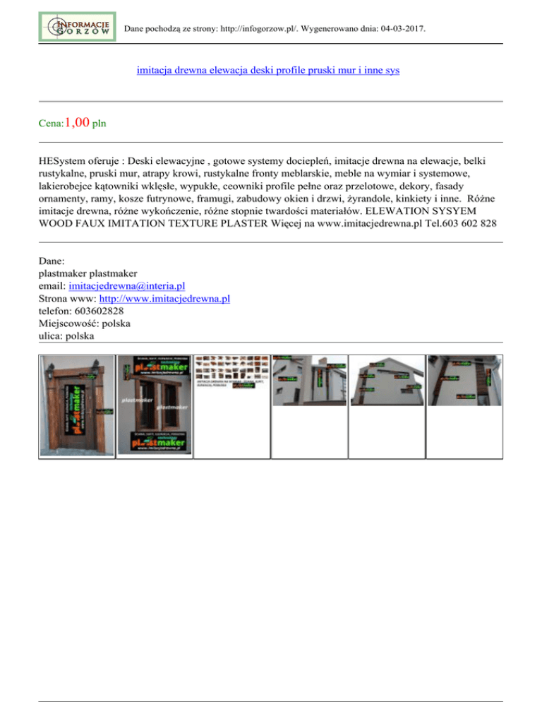 Dane pochodzą ze strony: http://infogorzow.pl/. Wygenerowano dnia: 04-03-2017. imitacja drewna elewacja deski profile pruski mur i inne sys Cena:1,00 pln HESystem oferuje : Deski elewacyjne , gotowe systemy dociepleń, imitacje drewna na elewacje, belki rustykalne, pruski mur, atrapy krowi, rustykalne fronty meblarskie, meble na wymiar i systemowe, lakierobejce kątowniki wklęsłe, wypukłe, ceowniki profile pełne oraz przelotowe, dekory, fasady ornamenty, ramy, kosze futrynowe, framugi, zabudowy okien i drzwi, żyrandole, kinkiety i inne. Różne imitacje drewna, różne wykończenie, różne stopnie twardości materiałów. ELEWATION SYSYEM WOOD FAUX IMITATION TEXTURE PLASTER Więcej na www.imitacjedrewna.pl Tel.603 602 828 Dane: plastmaker plastmaker email: [email protected] Strona www: http://www.imitacjedrewna.pl telefon: 603602828 Miejscowość: polska ulica: polska