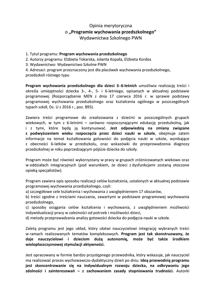 Opinia merytoryczna o „Programie wychowania przedszkolnego” Wydawnictwa Szkolnego PWN 1. Tytuł programu: Program wychowania przedszkolnego 2. Autorzy programu: Elżbieta Tokarska, Jolanta Kopała, Elżbieta Kordos 3. Wydawnictwo: Wydawnictwo Szkolne PWN 4. Adresaci: program przeznaczony jest dla placówek wychowania przedszkolnego, przedszkoli różnego typu Program wychowania przedszkolnego dla dzieci 3–6-letnich umożliwia realizację treści i określa umiejętności dziecka 3-, 4-, 5- i 6-letniego, opisanych w aktualnej podstawie programowej (Rozporządzenie MEN z dnia 17 czerwca 2016 r. w sprawie podstawy programowej wychowania przedszkolnego oraz kształcenia ogólnego w poszczególnych typach szkół, Dz. U z 2016 r., poz. 895). Zawiera treści programowe do zrealizowania z dziećmi w poszczególnych grupach wiekowych, w tym z 6-letnimi – zarówno rozpoczynającymi edukację przedszkolną, jak i z tymi, które będą ją kontynuować. Jest odpowiedzią na zmiany związane z podwyższeniem wieku rozpoczęcia przez dzieci nauki w szkole, obejmuje zatem informacje na temat kształtowania gotowości do podjęcia nauki w szkole, wynikające z obecności 6-latków w przedszkolu, oraz wskazówki do przeprowadzenia diagnozy przedszkolnej w roku poprzedzającym pójście dziecka do szkoły. Program może być również wykorzystany w pracy w grupach zróżnicowanych wiekowo oraz w oddziałach integracyjnych (pod warunkiem, że dzieci z dysfunkcjami zostaną otoczone opieką specjalistów). Program zawiera opis sposobu realizacji celów kształcenia, ustalonych w aktualnej podstawie programowej wychowania przedszkolnego, czyli: a) szczegółowe cele kształcenia i wychowania z uwzględnieniem 17 obszarów, b) treści zgodne z treściami nauczania, zawartymi w podstawie programowej wychowania przedszkolnego, c) sposoby osiągania celów kształcenia i wychowania, z uwzględnieniem możliwości indywidualizacji pracy w zależności od potrzeb i możliwości dzieci, d) metody przeprowadzania analizy gotowości dziecka do podjęcia nauki w szkole. Zaletą programu jest jego układ, który ułatwi nauczycielowi integrację wybranych treści w ramach realizowanych tematów kompleksowych. Program jest tak skonstruowany, że daje nauczycielowi i dzieciom dużą autonomię, może być także środkiem wielopłaszczyznowej stymulacji aktywności. Jest opracowany w formie bardzo przystępnego przewodnika, który wskazuje, jak nauczyciel ma realizować proces wychowawczo-dydaktyczny dzień po dniu. Ideą przewodnią programu jest skoncentrowanie się na indywidualnym rozwoju dziecka, na odkrywaniu jego zdolności i zainteresowań – z zachowaniem zasady stopniowania trudności. Autorki wskazują nauczycielowi, jak organizować i planować pracę z programem, uwzględniając różne jej aspekty i kolejne etapy. Praca z programem oparta jest na kilku ważnych filarach: uczenie się przez doświadczenie, współpraca w grupie, stosowanie metod angażujących i motywujących dzieci do nauki. Spójność wymagań (założonych celów) z efektami i pomysłami na sposoby ich realizowania to jedna z mocniejszych stron tego programu: nie tylko wymagania są spójne, najcenniejsza jest spójność całej koncepcji i rozumienia roli wychowania przedszkolnego. Wskazanie potrzeby indywidualnego podejścia do wychowanka, stopniowe kształtowanie określonych umiejętności i zachowań oraz systematyczne przekazywanie rodzicom wiadomości o postępach dziecka będą miały pozytywny wpływ na: odważne podejmowanie przez dziecko nowych zadań, nabywanie pewności siebie i umiejętności wyrażania swoich potrzeb, panowanie nad emocjami. Program akcentuje wspieranie rozwoju dziecka, umożliwianie zaspokajania jego aktualnych potrzeb oraz dostosowywanie zadań do rozpoznanego poziomu rozwojowego, daje możliwość stopniowania trudności, gwarancję stosowania zróżnicowanych metod i form pracy, umożliwia indywidualizację. Cele programu są możliwe do zrealizowania. Koncepcja programu służy ukierunkowanemu wspomaganiu rozwoju dzieci od adaptacji przedszkolnej do zbudowania gotowości szkolnej. Program bardzo dokładnie wskazuje, jakie treści, strategie, metody i procedury stanowią podstawę do założenia, że praca zgodnie z przedstawionym programem może rzeczywiście istotnie przyczynić się do rozwoju dziecka i osiągnięcia gotowości szkolnej. Bardzo ważnym elementem programu jest część poświęcona dzieciom 6-letnim uwzględniająca wymagania – umiejętności z zakresu czytania i przygotowania dzieci do nabywania umiejętności pisania, a także umiejętności matematyczne – niezbędne do podjęcia nauki w szkole. Dzięki elastyczności programu nauczyciel może włączać nowe metody nauczania i uczenia się. Program z pewnością ułatwi nauczycielowi organizację pracy oraz umożliwi osiąganie właściwych efektów. Pracując zgodnie z założeniami programu, nauczyciele mają możliwość dobrze przygotować dzieci do szkoły. Program jest odpowiedni do realizacji w każdej placówce, poprawny pod względem merytorycznym i dydaktycznym, spełnia kryteria jego zastosowania i wykorzystania w edukacji przedszkolnej. Opiniuję go pozytywnie. mgr Sławomira Załęska nauczyciel dyplomowany, edukator