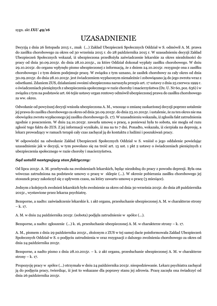 sygn. akt IXU 49/16 UZASADNIENIE Decyzją z dnia 26 listopada 2015 r., znak (...) Zakład Ubezpieczeń Społecznych Oddział w S. odmówił A. M. prawa do zasiłku chorobowego za okres od 30 września 2015 r. do 28 października 2015 r. W uzasadnieniu decyzji Zakład Ubezpieczeń Społecznych wskazał, iż ubezpieczona przedłożyła zaświadczenie lekarskie za okres niezdolności do pracy od dnia 30.09.2015r. do dnia 28.10.2015r., za które Oddział dokonał wypłaty zasiłku chorobowego. W dniu 29.10.2015r. do organu wpłynęło pismo ubezpieczonej z informacją, że z dniem 24.10.2015r. rezygnuje ona z zasiłku chorobowego i z tym dniem podejmuje pracę. W związku z tym uznano, że zasiłek chorobowy za cały okres od dnia 30.09.2015r. do dnia 28.10.2015r. jest świadczeniem wypłaconym nienależnie i zobowiązano ją do jego zwrotu wraz z odsetkami. Zdaniem ZUS, działaniami swoimi ubezpieczona naruszyła przepis art. 17 ustawy z dnia 25 czerwca 1999 r. o świadczeniach pieniężnych z ubezpieczenia społecznego w razie choroby i macierzyństwa (Dz. U. Nr 60, poz. 636) i w związku z tym na podstawie art. 66 tejże ustawy organ rentowy odmówił ubezpieczonej prawa do zasiłku chorobowego za ww. okres. Odwołanie od powyższej decyzji wniosła ubezpieczona A. M., wnosząc o zmianę zaskarżonej decyzji poprzez ustalenie jej prawa do zasiłku chorobowego za okres od dnia 30.09.2015r. do dnia 23.10.2015r. i ustalenie, że za ten okres nie ma obowiązku zwrotu wypłaconego jej zasiłku chorobowego (k. 17). W uzasadnieniu wskazała, iż zgłosiła fakt zatrudnienia zgodnie z pouczeniem. W dniu 24.10.2015r. zawarła umowę o pracę, a ponieważ była to sobota, nie mogła od razu zgłosić tego faktu do ZUS. Z jej informacji wynikało, iż ma na to 7 dni. Ponadto, wskazała, iż cierpiała na depresję, a lekarz prowadzący w ramach terapii cały czas zachęcał ją do kontaktu z ludźmi i poszukiwań pracy. W odpowiedzi na odwołanie Zakład Ubezpieczeń Społecznych Oddział w S. wniósł o jego oddalenie powielając uzasadnienie jak w decyzji, w tym powołano się na treść art. 13 ust. 1 pkt 2 ustawy o świadczeniach pieniężnych z ubezpieczenia społecznego w razie choroby i macierzyństwa. Sąd ustalił następujący stan faktyczny: Od lipca 2015r. A. M. przebywała na zwolnieniach lekarskich, będąc niezdolną do pracy z powodu depresji. Była ona wówczas zatrudniona na podstawie umowy o pracę w sklepie (...). W okresie pobierania zasiłku chorobowego jej stosunek pracy zakończył się z upływem czasu, na który zawarto umowę o pracę (3 miesiące). Jednym z kolejnych zwolnień lekarskich było zwolnienie za okres od dnia 30 września 2015r. do dnia 28 października 2015r., wystawione przez lekarza psychiatrę. Bezsporne, a nadto: zaświadczenie lekarskie k. 1 akt organu, przesłuchanie ubezpieczonej A. M. w charakterze strony – k. 17. A. M. w dniu 24 października 2015r. (sobota) podjęła zatrudnienie w spółce (...). Bezsporne, a nadto: zgłoszenie (...) k. 16, przesłuchanie ubezpieczonej A. M. w charakterze strony – k. 17. A. M., pismem z dnia 29 października 2015r., złożonym z ZUS w tej samej dacie poinformowała Zakład Ubezpieczeń Społecznych Oddział w S. o podjęciu zatrudnienia w oraz rezygnacji z dalszego zwolnienia chorobowego za okres od dnia 24 października 2015r. Bezsporne, a nadto pismo z dnia 28.10.2015r. – k. 2 akt organu, przesłuchanie ubezpieczonej A. M. w charakterze strony – k. 17. Propozycję pracy w spółce (...) otrzymała w dniu 24 października 2015r. niespodziewanie. Lekarz psychiatra zachęcał ją do podjęcia pracy, twierdząc, iż jest to wskazane dla poprawy stanu jej zdrowia. Pracę zaczęła ona świadczyć od dnia 26 października 2015r. Dowód: przesłuchanie ubezpieczonej A. M. w charakterze strony – k. 17. Zakład Ubezpieczeń Społecznych Oddział w S. decyzją z dnia 26 listopada 2015 r. odmówił A. M. prawa do zasiłku chorobowego za okres od dnia 30 września 2015r. do 28 października 2015r. Dowód: - decyzja z dnia 26.11.2015r. k. 4 akt organu. Sąd zważył, co następuje: Odwołanie ubezpieczonej okazało się uzasadnione. Przedmiot sporu w niniejszej sprawie stanowiło prawo ubezpieczonej A. M. do zasiłku chorobowego za okres od 30 września 2015r. do 23 października 2015 r. Ubezpieczona twierdziła, że przysługuje jej zasiłek chorobowy za ww. okres, tj. za okres do dnia, którym zawarła ona umowę o pracę ze spółką (...) (24 października 2015r.) Organ rentowy stał na stanowisku, iż skoro ubezpieczona podjęła pracę w okresie wystawionego zaświadczenia lekarskiego za czas niezdolności do pracy, powinna zwrócić wypłacony zasiłek chorobowy za cały okres objęty tym zaświadczeniem (30.09.2015r. – 28.10.2015r.). Zatem istota sporu sprowadzała się do rozstrzygnięcia zagadnienia prawnego, czy ubezpieczona A. M. winna zostać pozbawiona prawa do zasiłku chorobowego za cały okres orzeczonej niezdolności do pracy w oparciu o art. 17 ust. 1 ustawy z dnia 25 czerwca 1999 r. o świadczeniach pieniężnych z ubezpieczenia społecznego w razie choroby i macierzyństwa, czy też jedynie za okres od dnia podjęcia zatrudnienia w oparciu o art. 13 ww. ustawy. Organ rentowy za podstawę pozbawienia ubezpieczonej prawa do zasiłku chorobowego przyjął przepis art. 17 ust. 1 ustawy z dnia 25 czerwca 1999 r. o świadczeniach pieniężnych z ubezpieczenia społecznego w razie choroby i macierzyństwa (Dz. U. Nr 60, poz. 636 ze zm.). Zgodnie z treścią tego przepisu ubezpieczony wykonujący w okresie orzeczonej niezdolności do pracy pracę zarobkową lub wykorzystujący zwolnienie od pracy w sposób niezgodny z celem tego zwolnienia traci prawo do zasiłku chorobowego za cały okres tego zwolnienia. Przesłanki stanowiące podstawę utraty prawa do zasiłku zostały we wskazanym przepisie wymienione alternatywnie, zatem do pozbawienia ubezpieczonego prawa do zasiłku chorobowego wystarczy wyst