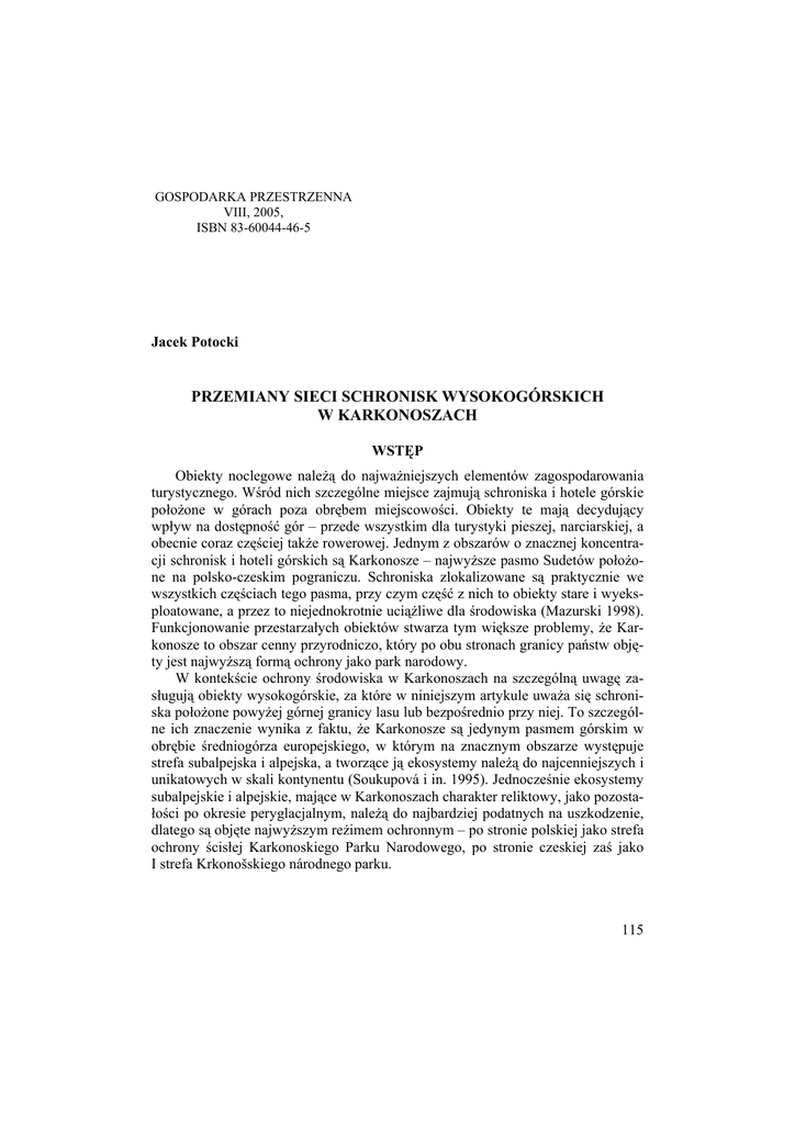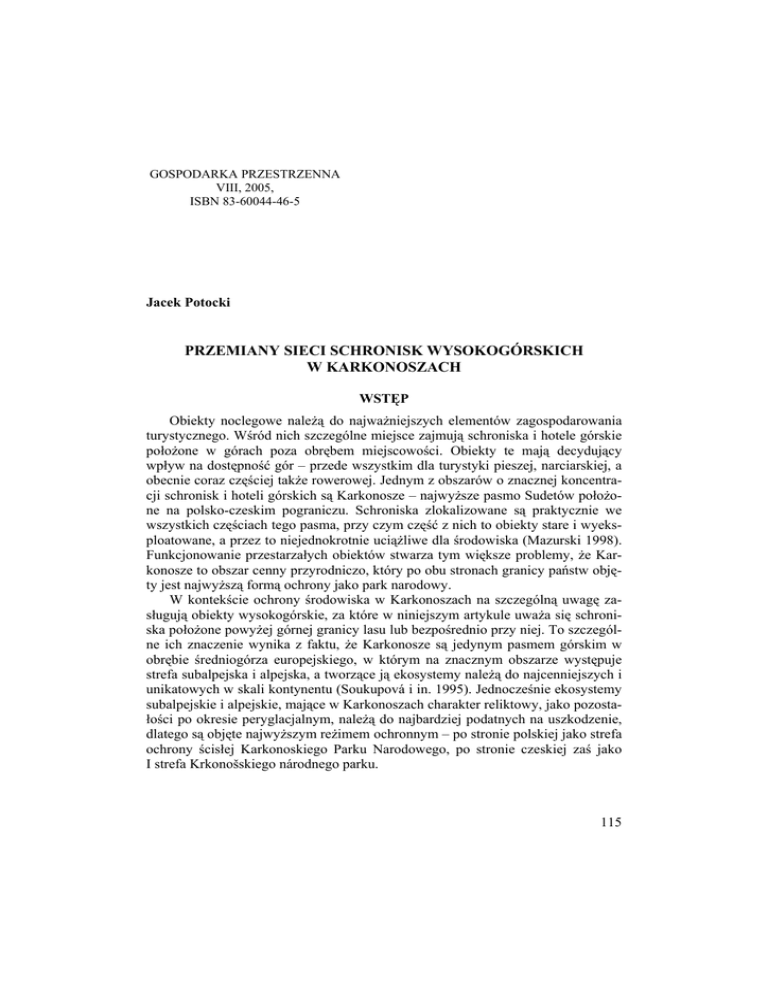 GOSPODARKA PRZESTRZENNA VIII, 2005, ISBN 83-60044-46-5 Jacek Potocki PRZEMIANY SIECI SCHRONISK WYSOKOGÓRSKICH W KARKONOSZACH WSTĘP Obiekty noclegowe należą do najważniejszych elementów zagospodarowania turystycznego. Wśród nich szczególne miejsce zajmują schroniska i hotele górskie położone w górach poza obrębem miejscowości. Obiekty te mają decydujący wpływ na dostępność gór – przede wszystkim dla turystyki pieszej, narciarskiej, a obecnie coraz częściej także rowerowej. Jednym z obszarów o znacznej koncentracji schronisk i hoteli górskich są Karkonosze – najwyższe pasmo Sudetów położone na polsko-czeskim pograniczu. Schroniska zlokalizowane są praktycznie we wszystkich częściach tego pasma, przy czym część z nich to obiekty stare i wyeksploatowane, a przez to niejednokrotnie uciążliwe dla środowiska (Mazurski 1998). Funkcjonowanie przestarzałych obiektów stwarza tym większe problemy, że Karkonosze to obszar cenny przyrodniczo, który po obu stronach granicy państw objęty jest najwyższą formą ochrony jako park narodowy. W kontekście ochrony środowiska w Karkonoszach na szczególną uwagę zasługują obiekty wysokogórskie, za które w niniejszym artykule uważa się schroniska położone powyżej górnej granicy lasu lub bezpośrednio przy niej. To szczególne ich znaczenie wynika z faktu, że Karkonosze są jedynym pasmem górskim w obrębie średniogórza europejskiego, w którym na znacznym obszarze występuje strefa subalpejska i alpejska, a tworzące ją ekosystemy należą do najcenniejszych i unikatowych w skali kontynentu (Soukupová i in. 1995). Jednocześnie ekosystemy subalpejskie i alpejskie, mające w Karkonoszach charakter reliktowy, jako pozostałości po okresie peryglacjalnym, należą do najbardziej podatnych na uszkodzenie, dlatego są objęte najwyższym reżimem ochronnym – po stronie polskiej jako strefa ochrony ścisłej Karkonoskiego Parku Narodowego, po stronie czeskiej zaś jako I strefa Krkonošskiego národnego parku. 115 J. Potocki SCHRONISKA KARKONOSKIE PRZED II WOJNĄ ŚWIATOWĄ Karkonosze są jednym z najpopularniejszych regionów turystycznych w Europie Środkowej. Ilość turystów odwiedzających je w ciągu roku na przełomie XX/XXI w. szacowano na ok. 7-8 mln (Štursa 2003). Turystyka ma tutaj bogate i długie tradycje, jej początki bowiem sięgają 2 połowy XVII w., kiedy to rozpoczął się ruch pielgrzymkowy do kaplicy św. Wawrzyńca na szczycie Śnieżki. Rozwojowi turystyki sprzyjał szereg czynników, wśród których istotną rolę odegrało silne „ucywilizowanie” Karkonoszy dzięki intensywnie rozwijającej się od XVII w. gospodarce pasterskiej (Steć, Walczak 1962). Według obliczeń T. Lokvenca (1978) w szczytowym okresie jej rozwoju na przełomie XVIII/XIX w. w Karkonoszach znajdowało się ok. 2000 bud pasterskich, obecnych nawet powyżej górnej granicy lasu. Budy te udzielały schronienia pierwszym turystom, przy czym ta ich nowa funkcja na większą skalę najwcześniej zaczęła się rozwijać w Budzie Samuela1, udzielającej gościny wędrowcom udającym się z Karpacza, Miłkowa lub Sosnówki na Śnieżkę (Kincel 1973). Oblicze gospodarcze Sudetów w XIX w. uległo istotnym przeobrażeniom. Intensywny rozwój sudeckiego okręgu przemysłowego spowodował, że w podgórskich miejscowościach powstawały liczne zakłady, dające zatrudnienie mieszkańcom gór. Zakłady te reprezentowały przede wszystkim branżę tekstylną, papierniczą i szklarską. Jednocześnie Karkonosze zaczęły odgrywać ważną rolę jako region turystyczny, zwłaszcza po doprowadzeniu do ich podnóży linii kolejowych, które zaczęto budować na tym terenie w latach 60 XIX wieku (Potocki 2004). Rozwój przemysłu i turystyki spowodowały, że stopniowo malało znaczenie rolnictwa, w tym zwłaszcza pasterstwa w najwyższych partiach gór, gdzie jego opłacalność była niewielka. W tej sytuacji część obiektów służących gospodarce hodowlanej likwidowano, część zaś stopniowo przekształcano w obiekty turystyczne. Zarazem zwiększająca się ilość turystów odwiedzających Karkonosze spowodowała, że zaczęto specjalnie dla nich wznosić zupełnie nowe obiekty. Większość z nich powstawała w obrębie miejscowości, były jednak i takie, które lokalizowano w miejscach wcześniej niezagospodarowanych, przy czym proces ten zaznaczył się także w najwyższych partiach gór. Pierwszym obiektem wysokogórskim od początku istnienia przeznaczonym dla obsługi gości stało się schronisko nad Śnieżnymi Kotłami zbudowane w 1837 roku, a potem kilkakrotnie rozbudowywane. Rozbudowa bazy turystycznej nabrała rozmachu w dwóch ostatnich dziesięcioleciach XIX w., kiedy to ruch turystyczny zaczął przybierać masowe rozmiary. 1 Dawna Buda Samuela (później od nazwisk kolejnych właścicieli zwana Buda Daniela i Buda Hampla) jest typowym przykładem stopniowego przekształcania się gospodarstwa w obiekt turystyczny. Obecnie w tym miejscu znajduje się schronisko Strzecha Akademicka. 116 Przemiany sieci schronisk wysokogórskich w Karkonoszach Warto w tym miejscu zauważyć, że rozwój funkcji turystycznej w przedzielonych granicą (do 1918 r. prusko-austriacką) Karkonoszach nie rozwijał się równomiernie. Pod względem intensywności ruchu i stopnia zagospodarowania turystycznego, prym wiodła strona pruska2. Ta dysproporcja w zagospodarowaniu turystycznym między północną i południową stroną Karkonoszy stopniowo zanikała w wieku XX. Proces ten rozpoczął się po powstaniu roku 1918 r. Czechosłowacji – kraju, który w okresie międzywojennym stanowił jeden z najlepiej rozwiniętych w Europie – a dynamiki nabrał po II wojnie światowej. Karkonosze stały się najpopularniejszym regionem turystycznym Czechosłowacji, położonym stosunkowo blisko stołecznej Pragi i stanowiącym cel wycieczek dla jej mieszkańców. Intensywny rozwój bazy turystycznej w Karkonosza