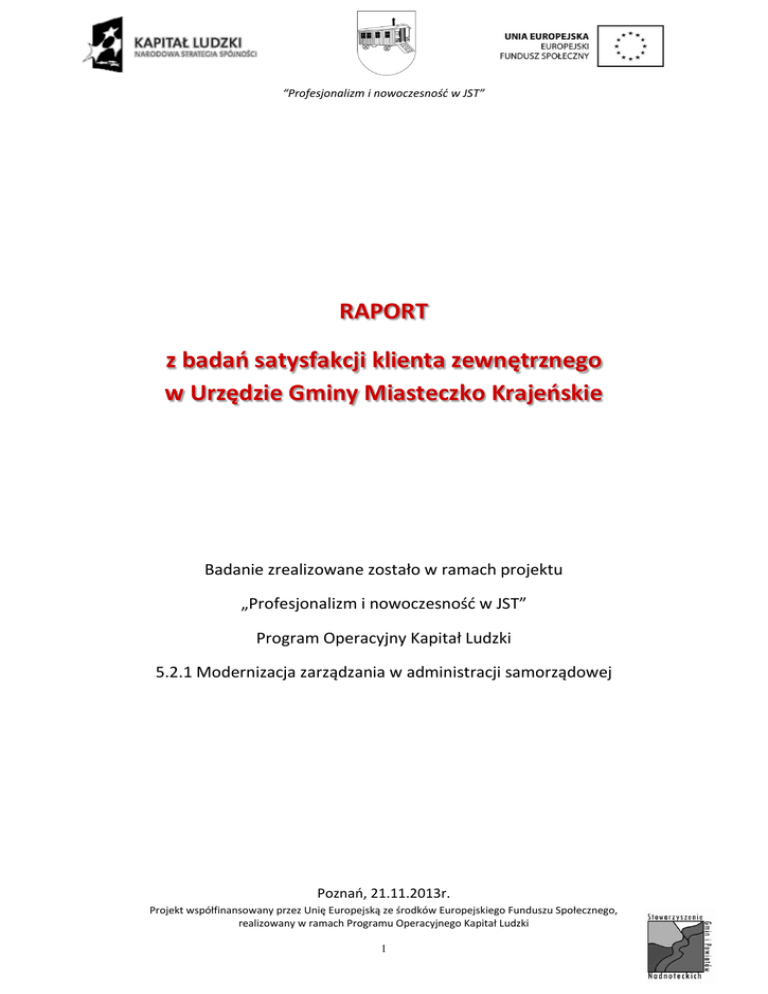 “Profesjonalizm i nowoczesność w JST” RAPORT z badań satysfakcji klienta zewnętrznego w Urzędzie Gminy Miasteczko Krajeńskie Badanie zrealizowane zostało w ramach projektu „Profesjonalizm i nowoczesność w JST” Program Operacyjny Kapitał Ludzki 5.2.1 Modernizacja zarządzania w administracji samorządowej Poznań, 21.11.2013r. Projekt współfinansowany przez Unię Europejską ze środków Europejskiego Funduszu Społecznego, realizowany w ramach Programu Operacyjnego Kapitał Ludzki 1 “Profesjonalizm i nowoczesność w JST” SPIS TREŚCI Wprowadzenie ....................................................................................................................................................... 3 1. Streszczenie raportu ...................................................................................................................................... 4 2. Opis pilotażu i zebranych wyników badań ..................................................................................................... 5 3. Zestawienie i analiza danych ......................................................................................................................... 6 4. Wnioski i rekomendacje .............................................................................................................................. 13 5. Opis wybranej i zastosowanej metodyki ..................................................................................................... 14 6. Bibliografia .................................................................................................................................................. 17 Projekt współfinansowany przez Unię Europejską ze środków Europejskiego Funduszu Społecznego, realizowany w ramach Programu Operacyjnego Kapitał Ludzki 2 “Profesjonalizm i nowoczesność w JST” Wprowadzenie W okresie od 3 września 2013 r. do 20 grudnia 2013 r. firma Quality Progress, na zlecenie Stowarzyszenia Gmin i Powiatów Nadnoteckich realizuje zamówienie w zakresie wdrożenia metod badania satysfakcji klientów zewnętrznych w 3 Jednostkach Samorządu Terytorialnego, w ramach projektu „Profesjonalizm i nowoczesność w JST”, współfinansowanego ze środków Unii Europejskiej w ramach Europejskiego Funduszu Społecznego (Program Operacyjny Kapitał Ludzki, Podziałanie 5.2.1. Modernizacja zarządzania w administracji samorządowej). Projekt obejmuje dwa rodzaje badań: CAWI (ang. Computer Assisted Web Interview) – wspomagane komputerowo badanie ankietowe PAPI (ang. Paper And Pencil Interview) – tradycyjne badanie ankietowe W projekcie uczestniczą następujące Jednostki Samorządu Terytorialnego: Gmina Budzyń – Urząd Gminy Budzyń Gmina Miasteczko Krajeńskie – Urząd Gminy Miasteczko Krajeńskie Miasto i Gmina Ujście – Urząd Miejski w Ujściu Cele badań: 1. Ocena jakości usług świadczonych przez urzędy biorące udział w projekcie poprzez analizę istotności i satysfakcji poszczególnych aspektów wpływających na zadowolenie klientów z wykorzystaniem tradycyjnego badania ankietowego (PAPI) oraz wspomaganego komputerowo badania ankietowego (CAWI), 2. Opracowanie metodyki badawczej pozwalającej na kontynuację badań przez urzędy, a także porównywanie wyników uzyskiwanych w poszczególnych okresach, 3. Analiza wyników i przeprowadzenie wnioskowania, które umożliwią zaprojektowanie najbardziej adekwatnych działań (korygujących, zapobiegawczych, doskonalących). Niniejszy raport stanowi opracowanie merytoryczne zawierające wyniki przeprowadzonych badań satysfakcji klienta zewnętrznego Urzędu Gminy Miasteczko Krajeńskie, wraz z wnioskami i rekomendacjami dotyczącymi możliwych do podjęcia działań, mających na celu poprawę obsługi klientów. Projekt współfinansowany przez Unię Europejską ze środków Europejskiego Funduszu Społecznego, realizowany w ramach Programu Operacyjnego Kapitał Ludzki 3 “Profesjonalizm i nowoczesność w JST” 1. Streszczenie raportu Niniejszy raport został opracowany w oparciu o wyniki uzyskane w badaniach satysfakcji klientów Urzędu Gminy Miasteczko Krajeńskie realizowanego w ramach projektu „Profesjonalizm i nowoczesność w JST” Programu Operacyjnego Kapitał Ludzki współfinansowanego w ramach Europejskiego Funduszu Społecznego. Wyniki badań zostały przedstawione w punkcie 3. Zestawienie i analiza danych. Ankietowani odpowiadali na następujące pytania: - Jak często korzysta Pan/Pani z usług oferowanych przez Urząd? - Na jakie trudności napotkał/a Pan/Pani podczas załatwiania sprawy? - W jaki sposób najczęściej uzyskuje Pan/ Pani informacje o procedurze załatwienia sprawy? - Czy godziny pracy urzędu są dostosowane do Pana/Pani potrzeb? - Proszę zaznaczyć w skali od 1 do 5 w jakim stopniu ważne są dla Pana/ Pani wymienione poniżej aspekty oraz w jakim stopniu jest Pan/Pani zadowolony/a z tychże aspektów. - Jakie ma Pan/Pani oczekiwania/uwagi dotyczące Urzędu i sposobu obsługi Klienta w Urzędzie? Wśród zebranych ankiet zdecydowana większość świadczy o pozytywnej ocenie jakości świadczonych usług w Urzędzie. Klienci zwracają jednak uwagę na kilka aspektów, które ich zdaniem wymagają poprawy. Należą do nich: - Warunki lokalowe obsługi klienta - Udogodnienia dla klientów niepełnosprawnych - Udogodnienia dla klientów - Zaoferowanie pomocy przy wypełnieniu formularzy Na podstawie uzyskanych wyników obliczono Europejski Indeks Satysfakcji (ECSI) dla Urzędu i wynosi on 2,35 w skali 5-punktowej, co stanowi średni wynik. Aspekty wymagające poprawy zostały szczegółowo opisane w punkcie 4. Wnioski i rekomendacje. W powyższym punkcie zostały również zaproponowane działania mające na celu poprawę satysfakcji klientów, wśród nich znalazły się: - System zastępstw, - Udogodnienia dla klientów i osób niepełnosprawnych, - Wydłużenie godzin pracy urzędu. Projekt współfinansowany przez 