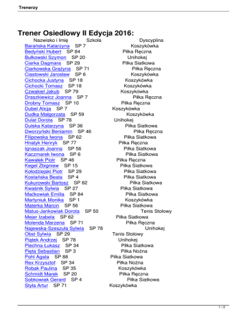 Trenerzy Trener Osiedlowy II Edycja 2016: Nazwisko i Imię Szkoła Barańska Katarzyna SP 7 Bedyński Hubert SP 84 Bułkowski Szymon SP 20 Ciarka Dagmara SP 29 Ciarkowska Grażyna SP 71 Ciastowski Jarosław SP 6 Cichocka Justyna SP 18 Cichocki Tomasz SP 18 Czwakiel Jakub SP 79 Draszkiewicz Joanna SP 7 Drobny Tomasz SP 10 Dubel Alicja SP 7 Dudka Małgorzata SP 59 Dulat Dorota SP 78 Dulska Katarzyna SP 36 Dworzyński Beniamin SP 46 Filipowska Iwona SP 62 Hnatyk Henryk SP 77 Ignaszak Joanna SP 56 Kaczmarek Iwona SP 6 Kawałek Piotr SP 46 Kegel Zbigniew SP 15 Kołodziejski Piotr SP 29 Kostańska Beata SP 4 Kukurowski Bartosz SP 82 Kwaśnik Sylwia SP 27 Maćkowiak Emilia SP 84 Martyniuk Monika SP 1 Materka Marcin SP 56 Matus-Jankowiak Dorota SP 50 Mejer Izabela SP 62 Molenda Marzena SP 71 Najewska-Szeszuła Sylwia SP 78 Obst Sylwia SP 29 Piątek Andrzej SP 78 Piechna Łukasz SP 34 Pięta Sebastian SP 3 Pohl Agata SP 88 Rex Krzysztof SP 34 Robak Paulina SP 35 Schmidt Marek SP 20 Sobkowiak Gerard SP 4 Styła Artur SP 71 Dyscyplina Koszykówka Piłka Ręczna Unihokej Piłka Siatkowa Piłka Ręczna Koszykówka Koszykówka Koszykówka Koszykówka Piłka Ręczna Piłka Ręczna Koszykówka Koszykówka Unihokej Piłka Siatkowa Piłka Ręczna Piłka Siatkowa Piłka Ręczna Piłka Siatkowa Piłka Siatkowa Piłka Ręczna Piłka Siatkowa Piłka Siatkowa Piłka Siatkowa Piłka Siatkowa Piłka Siatkowa Piłka Siatkowa Koszykówka Piłka Siatkowa Tenis Stołowy Piłka Siatkowa Piłka Ręczna Unihokej Tenis Stołowy Unihokej Piłka Siatkowa Piłka Nożna Piłka Siatkowa Piłka Nożna Koszykówka Piłka Ręczna Piłka Siatkowa Koszykówka 1/2 Trenerzy Śliwińska Dorota SP 50 Śniadek Andrzej SP 56 Ulchurski Łukasz SP 51 Urbańczyk Lucyna SP 90 Waligórska Anna SP 65 Witkowski Bartosz SP 15 Włodarczak Mariola SP 88 Piłka Siatkowa Koszykówka Koszykówka Piłka Siatkowa Koszykówka Piłka Ręczna Piłka Ręczna 2/2