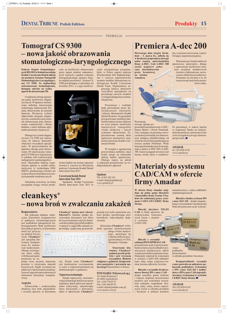 DTP0311_15_Produkty 20.05.11 11:11 Seite 1 DENTAL TRIBUNE Produkty 15 Polish Edition PROMOCJA Tomograf CS 9300 Premiera A-dec 200 – nowa jakość obrazowania stomatologiczno-laryngologicznego Podczas Targów Stomatologicznych IDS 2011w Kolonii na stoisku Kodak Carestream Dental odbyła się premiera Systemu Tomografii Stomatologiczno-Laryngologicznej CS 9300. To najbardziej zaawansowany technologicznie, dostępny obecnie na rynku aparat do obrazowania 3D. cent, są możliwości obrazowania przez aparat struktur anatomicznych ważnych z punktu widzenia laryngologicznego (granica tkanka miękka-powietrze). System CS 9300 jest dostępny w sprzedaży od kwietnia 2011, a z jego możliwo- Urządzenie oferuje najszerszą gamę możliwości diagnostycznych. W aparacie zastosowano unikalną, innowacyjną technologię dopasowania formatu obrazowania do potrzeb dentysty. Wystarczy wybrać odpowiedni program diagnostyczny, a automatycznie zostanie dostosowane pole obrazowania, rozdzielczość i obszar badania, a także dobrane optymalne parametry ekspozycji. Dlatego też system diagnostyczny CS 9300 jest adresowany do lekarzy dentystów właściwie wszystkich specjalności. W przeciwieństwie do aparatów dużego pola obrazowania 3D innowacyjny tomograf CS 9300 jest wyposażony w odrębny tryb wykonywania radiogramów pantomograficznych. Opcjonalna funkcja wyposażenia aparatu w moduł cefalometryczny (z technologią ONE SHOT), predestynuje również ten system obrazowania dla nowoczesnych poradni ortodontycznych. Absolutną nowością, na którą szczególną uwagę zwraca produ- część europejskiego programu, który w Polsce zagości podczas Wrocławskich Dni Implantologii. Już 3. czerwca zaprezentowane zostanie mobilne laboratorium radiologiczne Kodak Carestream Dental Truck. Organizatorzy zapraszają lekarzy dentystów wszystkich specjalności na prezentacje nowych trendów w rentgenodiagnostyce stomatologicznej. Prezentacje i wykłady będą prowadzone przez doświadczonych inżynierów i lekarzy laboratoriów Kodak Dental Systems. Na specjalnie przygotowanej mobilnej platformie będzie można obejrzeć na żywo pokazy możliwości najnowszych tomografów wiazki stożkowej i innych systemów obrazowania. Zaprezentowane zostaną także najnowsze premierowe urządzenia koncernu Kodak Carestream Dental. ściami będzie się można zapoznać również 3. czerwca we Wrocławiu podczas Carestream Kodak Dental Innovation Tour 2011. Carestream Kodak Dental Innovation Tour 2011 Spotkanie Kodak Carestream Dental Innovation Tour 2011 to W związku z ograniczoną powierzchnią mobilnej stacji liczba miejsc na kameralne pokazy będzie ograniczona. Dlatego zapisy na udział w pokazach przyjmowane są według kolejności zgłoszeń. Optident Tel.: 0 501 242 101 e-mail: [email protected] www.optident.pl cleankeys® – nowa broń w zwalczaniu zakażeń Bezpieczeństwo Jak pokazują badania, tradycyjna klawiatura komputerowa w gabinecie stomatologicznym jest siedliskiem patogennych mikroorganizmów. Brak możliwości dezynfekcji sprawia, że klawiatura może być przyczyną infekcji krzyżowych. Cleankeys® jest specjalną klawiaturą komputerową do zastosowań medycznych. Oferuje rozwiązania, które walkę z drobnoustrojami przenoszą na zupełnie nowy poziom, stanowiąc przełom w zwalczaniu zakażeń krzyżowych. Nigdy wcześniej nie udało się w takim stopniu zminimalizować zagrożeń spowodowanych skażeniem klawiatury komputerowej. Aseptyka Pyłoszczelna i wodoszczelna obudowa oraz brak zakamarków i szczelin sprawia, że klawiaturę Cleankeys® można myć i dezynfekować!!!. Idealnie gładka powierzchnia klawiatury jest łatwa do czyszczenia przy użyciu chusteczek dezynfekcyjnych lub środków w sprayu w ciągu kilku sekund, zapewniając aseptyczną powierzch- nię. Dzięki temu Cleankeys® jest doskonałym rozwiązaniem w walce z rozprzestrzenianiem się drobnoustrojów w gabinecie. Najnowsza technologia Dzięki najnowszej, zaawansowanej technologii dotykowej nawet najlżejszy dotyk palca jest natychmiast wykrywany, umożliwiając łatwe korzystanie z klawiatury, także w rękawicach. Cleankeys® posiada trzy tryby ustawienia czułości dotyku, umożliwiając użytkownikowi indywidualne dopasowanie. Klawiatura Cleankeys® wzbudziła ogromne zainteresowanie całego świata medycznego, spotykając się z bardzo dobrym przyjęciem lekarzy w USA, Kanadzie i Europie. Stosowanie klawiatury Cleankeys® podnosi prestiż praktyki i jest wyrazem szczególnej dbałości o higienę w gabinecie, bezpieczeństwo pacjentów i personelu medycznego! Dystrybutor w Polsce: PZM MARKU M.Krawczyk sp.j. Al. Armii Krajowej 2 42-200 Częstochowa Tel.: (34) 374 05 25 Fax: (34) 368 09 32 e-mail: [email protected] www.marku.com.pl Pierwszego dnia targów Krakdent – 3. marca br., odbyła się w Krakowie prapremiera nowego unitu znanej, amerykańskiej firmy A-DEC. Unit A-DEC 200 został najpierw pokazany dziennikarzom prasy branżowej na stoisku Amadaru. Prezentację nowego sprzętu poprowadzili przedstawiciele A-DEC: Simon Baxter i Paweł Dominiak. Unit, cechujący się prostotą i nowoczesnością rozwiązań jest planowanym następcą produkowanego od wielu lat i niezwykle popularnego na świecie modelu Performer. Wiele koncepcji konstrukcyjnych zaczerpnięto z unitów A-DEC 500 i A-DEC 300. Autorzy pragnęli stworzyć unit mocny, trwały, łatwy w użytkowa- niu, a zarazem nowoczesny i umożliwiający ergonomiczną pracę. Wykonano go z bardzo dobrych jakościowo materiałów, dbając o zapewnienie możliwości montażu urządzeń dodatkowych (zestawy elektroniczne, nowoczesne silniki bezszczotkowe). Postarano się również o to, by cena nowego unitu była stosunkowo niska. Po prezentacji, w trakcie lunchu w restauracji Starka na krakowskim Kazimierzu, omówiono wiele cech szczegółowych tego interesującego unitu. AMADAR tel. (22) 826 43 81 www.amadar.pl Materiały do systemu CAD/CAM w ofercie firmy Amadar W ofer