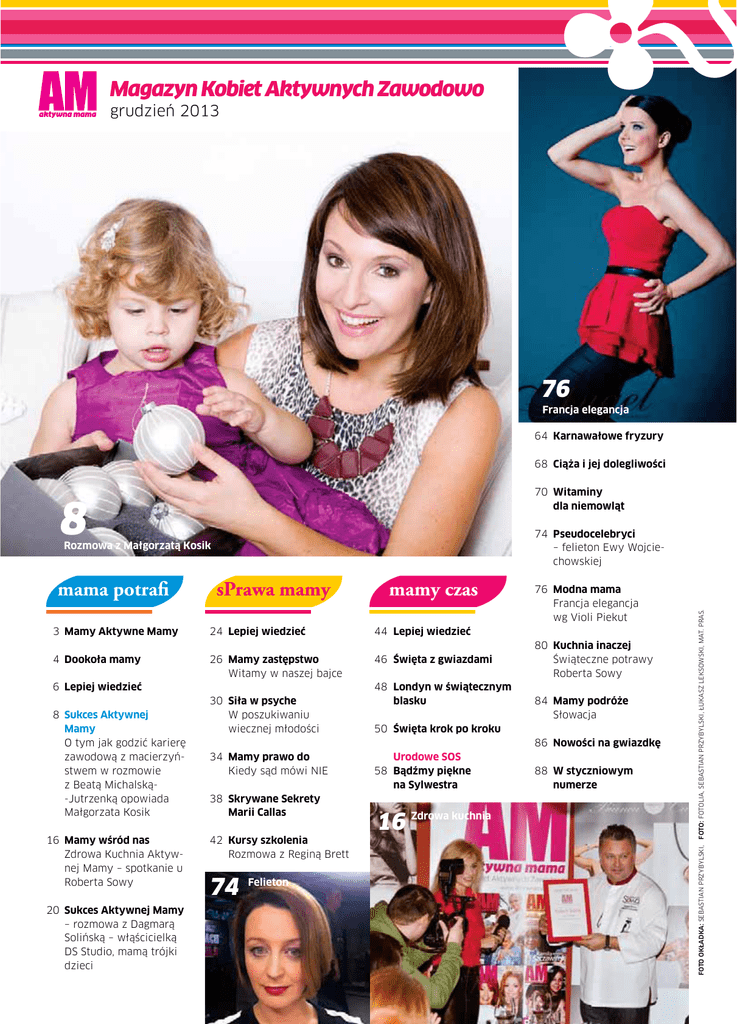 Magazyn Kobiet Aktywnych Zawodowo grudzień 2013 76 Francja elegancja 64 Karnawałowe fryzury 68 Ciąża i jej dolegliwości 70 Witaminy dla niemowląt 8 mama potrafi sPrawa mamy mamy czas 3 Mamy Aktywne Mamy 24 Lepiej wiedzieć 44 Lepiej wiedzieć 4 Dookoła mamy 26 Mamy zastępstwo Witamy w naszej bajce 46 Święta z gwiazdami 6 Lepiej wiedzieć 8 Sukces Aktywnej Mamy O tym jak godzić karierę zawodową z macierzyństwem w rozmowie z Beatą Michalską-Jutrzenką opowiada Małgorzata Kosik 16 Mamy wśród nas Zdrowa Kuchnia Aktywnej Mamy – spotkanie u Roberta Sowy 20 Sukces Aktywnej Mamy – rozmowa z Dagmarą Solińską – włąścicielką DS Studio, mamą trójki dzieci 30 Siła w psyche W poszukiwaniu wiecznej młodości 48 Londyn w świątecznym blasku 76 Modna mama Francja elegancja wg Violi Piekut 80 Kuchnia inaczej Świąteczne potrawy Roberta Sowy 84 Mamy podróże Słowacja 50 Święta krok po kroku 86 Nowości na gwiazdkę 34 Mamy prawo do Kiedy sąd mówi NIE 38 Skrywane Sekrety Marii Callas 42 Kursy szkolenia Rozmowa z Reginą Brett 74 Felieton Urodowe SOS 58 Bądźmy piękne na Sylwestra 16 Zdrowa kuchnia 88 W styczniowym numerze FOTO OKŁADKA: SEBASTIAN PRZYBYLSKI, FOTO: FOTOLIA, SEBASTIAN PRZYBYLSKI, ŁUKASZ LEKSOWSKI, MAT. PRAS. 74 Pseudocelebryci – felieton Ewy Wojciechowskiej Rozmowa z Małgorzatą Kosik