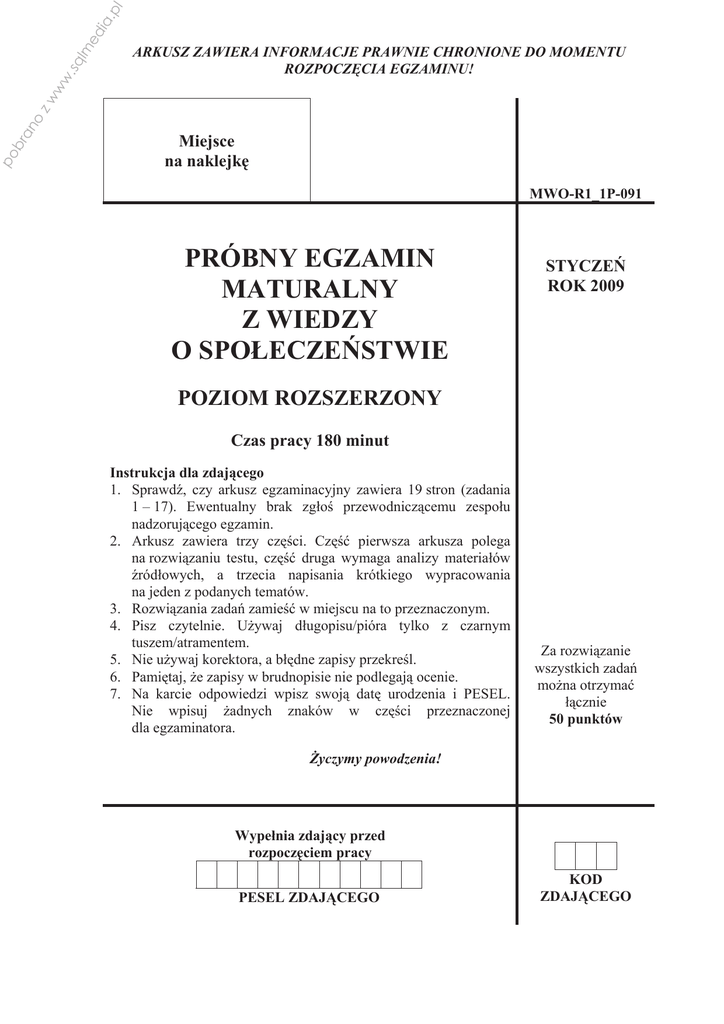 l m ed ia .p zw ww .sq l po br an o ARKUSZ ZAWIERA INFORMACJE PRAWNIE CHRONIONE DO MOMENTU ROZPOCZĉCIA EGZAMINU! Miejsce na naklejkĊ MWO-R1_1P-091 PRÓBNY EGZAMIN MATURALNY Z WIEDZY O SPOàECZEēSTWIE STYCZEē ROK 2009 POZIOM ROZSZERZONY Czas pracy 180 minut Instrukcja dla zdającego 1. SprawdĨ, czy arkusz egzaminacyjny zawiera 19 stron (zadania 1 – 17). Ewentualny brak zgáoĞ przewodniczącemu zespoáu nadzorującego egzamin. 2. Arkusz zawiera trzy czĊĞci. CzĊĞü pierwsza arkusza polega na rozwiązaniu testu, czĊĞü druga wymaga analizy materiaáów Ĩródáowych, a trzecia napisania krótkiego wypracowania na jeden z podanych tematów. 3. Rozwiązania zadaĔ zamieĞü w miejscu na to przeznaczonym. 4. Pisz czytelnie. UĪywaj dáugopisu/pióra tylko z czarnym tuszem/atramentem. 5. Nie uĪywaj korektora, a báĊdne zapisy przekreĞl. 6. PamiĊtaj, Īe zapisy w brudnopisie nie podlegają ocenie. 7. Na karcie odpowiedzi wpisz swoją datĊ urodzenia i PESEL. Nie wpisuj Īadnych znaków w czĊĞci przeznaczonej dla egzaminatora. Za rozwiązanie wszystkich zadaĔ moĪna otrzymaü áącznie 50 punktów ĩyczymy powodzenia! Wypeánia zdający przed rozpoczĊciem pracy PESEL ZDAJĄCEGO KOD ZDAJĄCEGO m ed ia .p l po br an o zw ww .sq l 2 Próbny egzamin maturalny z wiedzy o spoáeczeĔstwie Poziom rozszerzony CZĉĝû I W zadaniach 1-2 zakreĞl jedną prawidáową odpowiedĨ. Zadanie 1. (1 pkt) Do trzeciej generacji praw czáowieka zaliczamy A. B. C. D. prawo do korzystania ze Ğrodowiska naturalnego. prawo do wyboru miejsca zamieszkania. prawo do wypoczynku. prawo do zasiáku dla bezrobotnych. Zadanie 2. (1 pkt) W Polsce najniĪszy wymiar kary pozbawienia wolnoĞci za popeánioną zbrodniĊ wynosi A. B. C. D. 1 rok. 3 lata. 8 lat. 15 lat. Zadanie 3. (2 pkt) Wpisz peáne polskie nazwy organizacji i porozumieĔ europejskich, których symbole przedstawiono poniĪej. A. .............................................................................................................. B. .............................................................................................................. C. .............................................................................................................. D. .............................................................................................................. l m ed ia .p zw ww .sq l po br an o Próbny egzamin maturalny z wiedzy o spoáeczeĔstwie Poziom rozszerzony 3 Zadanie 4. (1 pkt) Podaj dwa czynniki postindustrialnego. mające wpáyw na ksztaátowanie siĊ spoáeczeĔstwa x .................................................................................................................................................. x .................................................................................................................................................. W zadaniach 5. i 6. rozstrzygnij, które zdania są prawdziwe, a które faászywe. Wpisz w odpowiednie miejsca w tabeli Prawda (zdanie prawdziwe) lub Faász ( zdanie faászywe). Zadanie 5. (1 pkt) SpoáeczeĔstwo Zdania A. Funkcjonujący w ĞwiadomoĞci spoáecznej, uproszczony, zabarwiony emocjonalnie i wartoĞciująco obraz rzeczywistoĞci, to stereotyp. B. Ujemny przyrost naturalny oznacza, Īe w danym roku rodzi siĊ mniej dzieci niĪ w roku poprzednim. C. Jednym z przykáadów ilustrujących zjawisko poziomej ruchliwoĞci spoáecznej jest emigracja zarobkowa. Prawda lub Faász Zadanie 6. (1 pkt) Zagadnienia prawne Zdania A. W obowiązującym polskim systemie prawnym zdolnoĞü prawną uzyskuje obywatel po ukoĔczeniu 18 roku Īycia. B. Proces cywilny inicjowany jest przez powoda, który wystĊpuje z Īądaniem wobec strony przeciwnej czyli pozwanego. C. W Polsce prokurator peáni funkcjĊ oskarĪyciela publicznego w postĊpowaniu administracyjnym. Prawda lub Faász m ed ia .p l po br an o zw ww .sq l 4 Próbny egzamin maturalny z wiedzy o spoáeczeĔstwie Poziom rozszerzony Zadanie 7. (2 pkt) Na podstawie analizy poniĪszego Ĩródáa i wiedzy wáasnej wykonaj polecenia. Sektor I: rolnictwo, leĞnictwo, ryboáówstwo Sektor II: przemysá, budownictwo Sektor III: handel, usáugi, finanse, administracja Na podstawie: Popularna encyklopedia powszechna. Atlas Polski, t. 1., Warszawa 2003 a) Podaj nazwĊ województwa, w którym : x odsetek zatrudnienia w III sektorze jest najwiĊkszy. ................................................................................................................................................. x odsetki zatrudnienia w I i II sektorze są najbardziej zbliĪone do siebie. ................................................................................................................................................. b) Podaj dwie przyczyny zatrudnienia w Polsce. przedstawionego w Ĩródle zróĪnicowania struktury x ................................................................................................................................................. x ................................................................................................................................................. l m ed ia .p zw ww .sq l po br an o Próbny egzamin maturalny z wiedzy o spoáeczeĔstwie Poziom rozszerzony 5 Zadanie 8. (2 pkt) Na podstawie tekstu Ĩródáowego i wiedzy wáasnej wykonaj polecenia. WáaĞnie dlatego, Īe Ğwiat na tak wiele sposobów staje siĊ pozbawiony granic miĊdzy narodami – i musi w jeszcze wiĊkszym stopniu je niwelowaü – ludzie chcą definiowaü siebie w kategoriach, które mogą zrozumieü. Potrzebują geograficznej, jĊzykowej, religijnej, kulturowej spoáecznoĞci, która jest dla nich dobrze widoczna i którą, jeĞli uĪyü starego okreĞlenia, »mogą objąü swymi ramionami«. ħródáo: Peter F. Drucker, SpoáeczeĔstwo pokapitalistyczne, Warszawa 1999 a) Podaj nazwĊ spoáecznoĞci, o której mówi autor. ........................................................................................