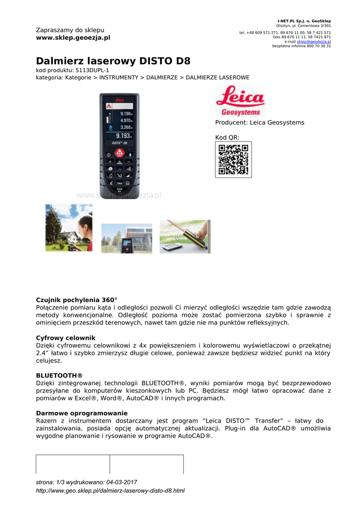 I-NET.PL Sp.J. o. GeoSklep Olsztyn, ul. Cementowa 3/301 Zapraszamy do sklepu www.sklep.geoezja.pl tel. +48 609 571 271, 89 670 11 00, 58 7 421 571 faks 89 670 11 11, 58 7421 871 e-mail [email protected] bezpłatna infolinia 800 70 30 31 Dalmierz laserowy DISTO D8 kod produktu: 5113DUPL-1 kategoria: Kategorie > INSTRUMENTY > DALMIERZE > DALMIERZE LASEROWE Producent: Leica Geosystems Kod QR: Czujnik pochylenia 360° Połączenie pomiaru kąta i odległości pozwoli Ci mierzyć odległości wszędzie tam gdzie zawodzą metody konwencjonalne. Odległość pozioma może zostać pomierzona szybko i sprawnie z ominięciem przeszkód terenowych, nawet tam gdzie nie ma punktów refleksyjnych. Cyfrowy celownik Dzięki cyfrowemu celownikowi z 4x powiększeniem i kolorowemu wyświetlaczowi o przekątnej 2.4” łatwo i szybko zmierzysz długie celowe, ponieważ zawsze będziesz widzieć punkt na który celujesz. BLUETOOTH® Dzięki zintegrowanej technologii BLUETOOTH®, wyniki pomiarów mogą być bezprzewodowo przesyłane do komputerów kieszonkowych lub PC. Będziesz mógł łatwo opracować dane z pomiarów w Excel®, Word®, AutoCAD® i innych programach. Darmowe oprogramowanie Razem z instrumentem dostarczany jest program “Leica DISTO™ Transfer” – łatwy do zainstalowania, posiada opcję automatycznej aktualizacji. Plug-in dla AutoCAD® umożliwia wygodne planowanie i rysowanie w programie AutoCAD®. strona: 1/3 wydrukowano: 04-03-2017 http://www.geo.sklep.pl/dalmierz-laserowy-disto-d8.html Cechy instrumentu Twoje korzyści Zasięg pomiaru od 0,05m do 200m, typowa dokładność ± 1.0 mm Precyzyjne, szybkie i wiarygodne pomiary BLUETOOTH® Bezbłędny i szybki transfer danych do komputera kieszonkowego lub PC Dostarczany z instrumentem program “Leica DISTOTM Transfer” Transfer danych do późniejszej obróbki w Excel®, Word®, AutoCAD® lub innym programie dla Windows Plug-in dla AutoCAD® Wygodne rysowanie w programie AutoCAD® Czujnik pochylenia 360° Pomiar kątów pionowych Cyfrowy punktowy celownik z 4x zoomem i kolorowym wyświetlaczem o wysokiej rozdzielczości Wygodne pomiary odległych obiektów, nawet w bardzo jasne dni Pośrednie pomiary przy użyciu czujnika pochylenia Określenie odległości do obiektów, których nie można bezpośrednio pomierzyć, ponieważ nie posiadają powierzchni refleksyjnych Pomiar profili Pomiar wysokich profili terenowych Zestaw zawiera: strona: 2/3 wydrukowano: 04-03-2017 http://www.geo.sklep.pl/dalmierz-laserowy-disto-d8.html Pokrowiec Pasek na rękę 2 x baterie AA Tarczka celownicza Instrukcja obsługi / Instrukcja bezpieczeństwa Certyfikat producenta M zgodny z DIN 55350-18-4.2.2 Instrukcja Quickstart Płyta CD z oprogramowaniem Leica DISTO™ Transfer dla PC oraz PPC, AutoCAD® PlugIn Gwarancja: 24 miesiące + 12 miesięcy po rejestracji produktu na www.disto.com Do pobrania: Broszura Leica DISTO™ D5/D8 [EN] Broszura Leica DISTO™ Family [PL] strona: 3/3 wydrukowano: 04-03-2017 http://www.geo.sklep.pl/dalmierz-laserowy-disto-d8.html