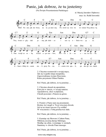 Panie, jak dobrze, że tu jesteśmy (Na Święto Przemienienia Pańskiego) sł. Maciej Jarosław Dąbrowa muz. ks. Rafał Jaworski % β œ Ιœ œΙ œ œ C F Ref. Pa - nie jak do - brze, C7 5 %œ œ œ œ Ι Ι F œ Twą twarz o - glą - dać 9 % C œ ι ι œ œ œ Dm œ 1. Pan wziął ze so - bą % œ œι œι œ œ 13 C F E - liasz z Moj - że - szem G œ ι Em œœ œ Ι œ œ G że tu je- steś - my. Em ι œ œ œ œ Ι ι ι C œ œ œ œ œ ι œι œ œ œ œ Am Dm G Po - zwól na wie - ki Am ι ιœ œ œ Dm wi - dzieć Twą chwa - łę. ι œ œι ˙ G7 C ja - sną jak słoń - ce œ ι œι œ œ œ ι ιœ œ œ œ œ Ja - na ι œ œ œι œ œ ι ι œ œ œ œ œ ι œ œ œι œ œ G C trzech a - po - sto - łów, œ ι E7 ι œ œ œ œ œ G sta - li przy Pa - nu. i sza - ty F Pio - tra i Am o - lśnie - wa - ją C Dm U - cznio - wie spa - li, 2. Chrystus rozmawiał o swojej męce, Jak się wypełni misja mesjańska, Zapowiedziane świata Zbawienie, Które przyniesie Ofiara Pańska. Ref. Panie, jak dobrze, że tu jesteśmy ... 3. Chrystus okazał się apostołom, Kim jest w istocie, w swojej naturze. Apostołowie, choć wylęknieni, Chcieli pozostać z Panem na górze. Ref. Panie, jak dobrze, że tu jesteśmy ... 4. Pomóż o Panie nam się przemienić, Byśmy żyć mogli w Twej wiecznej chwale. Już tu na ziemi zawsze Cię wielbić. W wieczności z Tobą przebywać stale. Ref. Panie, jak dobrze, że tu jesteśmy ... 5. Karmiąc się Słowem i Ciałem Pana, Miłością szczerą darząc bliźniego, Modląc się ufnie, wzrastając w cnotach, Staniemy w chwale Pana naszego. Ref. Panie, jak dobrze, że tu jesteśmy ... www.nuty.religijne.org Am Dm ˙ - ce. G o - raz Ja - ku - ba. G po C dro - gi tru - dach.