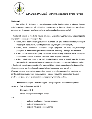 SZKOŁA MARZEŃ - szkoła lepszego bycia i życia Dla kogo? Dla dzieci i młodzieży z niepełnosprawnością intelektualną w stopniu lekkim, umiarkowanym, znacznym lub głębokim, z autyzmem, a także z niepełnosprawnościami sprzężonymi (z wadami słuchu, wzroku, z uszkodzeniami narządu ruchu). - Ponieważ szkoła to nie tylko nauka, ale nade wszystko wychowanie, wspomaganie, wspieranie, nasza placówka jest dla: dzieci, które doświadczyły przykrości, trudności lub lęku podczas edukacji w dużych masowych placówkach, często głośnych, krzykliwych i zatłoczonych, dzieci, które potrzebują skupienia uwagi wyłącznie na nich, indywidualnego podejścia w atmosferze życzliwości, wsparcia, tolerancji i pełnego zrozumienia, dzieci, które dopiero uczą się żyć wśród różnych grup rówieśniczych, zaczynają naukę zasad i norm, działania, radzenia sobie w społeczeństwie, dzieci i młodzieży, uczącej się żyć, działać i radzić sobie w nowej, bardziej dorosłej rzeczywistości, poznawać zasady i normy społeczne, z pomocą wyjątkowej kadry. - Ponieważ zatrudniamy specjalistów wysokiej klasy: oligofrenopedagogów, logopedów, tyflopedagogów, surdopedagogów, psychologa i pedagoga oraz innych .. W naszym gronie przeważają nauczyciele z ogromnym doświadczeniem zawodowym, bardzo dobrze przygotowani merytorycznie i przede wszystkim posiadający to „coś” predyspozycje do pracy z dziećmi niepełnosprawnymi intelektualnie. Oferta edukacyjno - rewalidacyjno - terapeutyczna placówki obejmuje: naukę w: Szkole Podstawowej Nr 2, Gimnazjum Nr 2 Szkole Przysposabiającej do Pracy. oraz: zajęcia korekcyjno – kompensacyjne; zajęcia logopedyczne; zajęcia integracji sensorycznej; zajęcia w sali doświadczania świata; zajęcia rewalidacyjno - wychowawcze; zajęcia wczesnego wspomagania rozwoju dziecka; zajęcia korekty wad postawy; zajęcia dydaktyczno – wyrównawcze; terapia poprzez sztukę i praktyczne zajęcia artystyczne; terapia z wykorzystaniem EEG Biofeedbacka; indywidualne konsultacje z psychologiem; zajęcia wspierające dla uczniów i rodziców. Szczególne potrzeby uczniów oraz ich rodziców doprowadziły do utworzenia Edukacyjnego Centrum Konsultacji służącego szeroko rozumianą, nieodpłatną pomocą ponad 60-osobowej grupy specjalistów i doradców w zakresie pracy z dziećmi i młodzieżą o specjalnych potrzebach edukacyjnych. Aktualnie trwają też przygotowania do uruchomienia w dniu 1 września 2015 r. jednego oddziału przedszkola specjalnego. Ośrodek nie bez powodu usytuowany jest w pięknym zabytkowym pałacu, otoczonym parkiem. Nasze dzieci traktujemy wyjątkowo. Specyficzny klimat i urok pałacowego budynku, w którym mieści się Ośrodek, sprzyja atmosferze bliskości, prywatności, ciepła. W „książęcych warunkach” – małe grupy, klasy 4 - 6 osobowe, zindywidualizowane podejście do każdego ucznia, sale zajęć wyposażone we wszystko, co ma sprzyjać rozwojowi, edukacji i wychowaniu. Wychowaniu, które trwa nie tylko w szkole podczas zajęć edukacyjnych, ale obejmuje także pięciodniowy internat. W pałacowych pokojach nasi uczniowie mogą liczyć na profesjonalną opiekę, rodzinną atmosferę czy bajkę „na dobranoc”. A wszystko to jedynie za minimalną cenę wyżywienia. Baśniowy pałac w parku jest nie tylko dla najmłodszych - kiedy już przejdziemy wspólnie przez naukę w podstawówce i gimnazjum, dalej towarzyszymy naszym dzieciom w nauce życia. Cztery profile kształcenia w szkole przysposabiającej do pracy zapewniają wyposażenie naszej młodzieży w wiedzę, umiejętności i czynności pracy przydatne przez całą resztę życia - pomoc w ogrodzie, kuchni, biurze, dla niektórych - rękodzieło artystyczne. Pierwsze próby dorosłości to praca chronionej oraz na otwartym rynku pracy. w zaprzyjaźnionych zakładach pracy W trudzie wychowania i wprowadzania w dorosłość nasi rodzice nie pozostają sami. Oprócz codziennych kontaktów, konsultacji, rodzice także zasiadają w szkolnych ławkach. Cyklicznie spotykają się w ramach „Szkoły dla rodziców”. Przy kawie i upieczonych przez uczniów ciastkach, poruszają najistotniejsze problemy dotyczące funkcjonowania ich dzieci, wspierają się nawzajem i wymieniają doświadczeniami. Czasami szkolni specjaliści przygotowują tematy „ekstra” z zaproszonymi z zewnątrz gośćmi. Dojazd do szkoły dopasowany jest do aktualnych potrzeb uczniów - do pałacu można dotrzeć nawet z odległych miejscowości, szkolnymi i gminnymi busami, których kursy ustalane są przez szkołę w najbardziej dogodny dla uczniów sposób. O tym, jak działa szkoła, najlepiej opowiedzą rodzice naszych uczniów: - p. Maria: Szkoła w Damnicy jest idealna dla mojego dziecka. Wcześniej syn nie czuł się dobrze wśród tłumu, hałasu. Tutaj znajduje bardzo indywidualne podejście, znajduje akceptację, zrozumienie, wsparcie od pań. A to przecież jest podstawą rozwoju! Dużo się nauczył, a co najważniejsze, przy różnych trudnościach nie zostajemy sami. Zawsze wspiera nas nauczyciel, dyrektor, specjaliści. - Mama Asi: Jeszcze parę lat temu nie wierzyłam, że dostanę wsparcie, pomoc i edukację w jednym miejscu. Nie wierzyłam, że moja córka mogłaby komunikować się z otoczeniem, że będzie zrozumiana poza domem. Dzisiaj, każdy może zobaczyć, że ma uczucia, emocje, że potrafi je okazać. Wszystkiego nauczyła się w Ośrodku. Chętnie mówią także sami uczniowie: - Renata i Natalia: Pewnie, że fajna szkoła. Inaczej nie byłybyśmy tutaj tak długo. Lubimy tu przychodzić, zawsze dużo się dzieje, nauczyciele mają dla nas czas. Jak jest problem, można pogadać, poprosić o pomoc. Nie tylko jak coś się dzieje w szkole, takie życiowe problemy też. - Piotr: Jestem w szkole od dziecka. Teraz już, niestety, ostatni rok. Szkoda, bo nigdzie nie będzie tylu bliskich ludzi, którzy chcą i mogą mi pomóc, kiedy mam kłopot. Dużo n