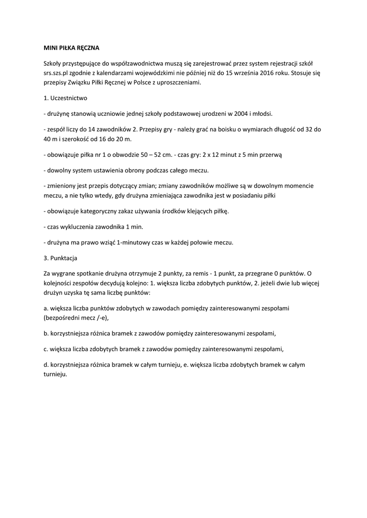 MINI PIŁKA RĘCZNA Szkoły przystępujące do współzawodnictwa muszą się zarejestrować przez system rejestracji szkół srs.szs.pl zgodnie z kalendarzami wojewódzkimi nie później niż do 15 września 2016 roku. Stosuje się przepisy Związku Piłki Ręcznej w Polsce z uproszczeniami. 1. Uczestnictwo - drużynę stanowią uczniowie jednej szkoły podstawowej urodzeni w 2004 i młodsi. - zespół liczy do 14 zawodników 2. Przepisy gry - należy grać na boisku o wymiarach długość od 32 do 40 m i szerokość od 16 do 20 m. - obowiązuje piłka nr 1 o obwodzie 50 – 52 cm. - czas gry: 2 x 12 minut z 5 min przerwą - dowolny system ustawienia obrony podczas całego meczu. - zmieniony jest przepis dotyczący zmian; zmiany zawodników możliwe są w dowolnym momencie meczu, a nie tylko wtedy, gdy drużyna zmieniająca zawodnika jest w posiadaniu piłki - obowiązuje kategoryczny zakaz używania środków klejących piłkę. - czas wykluczenia zawodnika 1 min. - drużyna ma prawo wziąć 1-minutowy czas w każdej połowie meczu. 3. Punktacja Za wygrane spotkanie drużyna otrzymuje 2 punkty, za remis - 1 punkt, za przegrane 0 punktów. O kolejności zespołów decydują kolejno: 1. większa liczba zdobytych punktów, 2. jeżeli dwie lub więcej drużyn uzyska tę sama liczbę punktów: a. większa liczba punktów zdobytych w zawodach pomiędzy zainteresowanymi zespołami (bezpośredni mecz /-e), b. korzystniejsza różnica bramek z zawodów pomiędzy zainteresowanymi zespołami, c. większa liczba zdobytych bramek z zawodów pomiędzy zainteresowanymi zespołami, d. korzystniejsza różnica bramek w całym turnieju, e. większa liczba zdobytych bramek w całym turnieju.