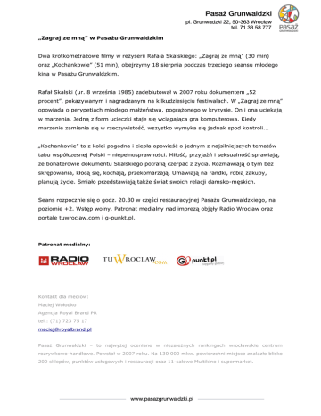 „Zagraj ze mną” w Pasażu Grunwaldzkim Dwa krótkometrażowe filmy w reżyserii Rafała Skalskiego: „Zagraj ze mną” (30 min) oraz „Kochankowie” (51 min), obejrzymy 18 sierpnia podczas trzeciego seansu młodego kina w Pasażu Grunwaldzkim. Rafał Skalski (ur. 8 września 1985) zadebiutował w 2007 roku dokumentem „52 procent”, pokazywanym i nagradzanym na kilkudziesięciu festiwalach. W „Zagraj ze mną” opowiada o perypetiach młodego małżeństwa, pogrążonego w kryzysie. On i ona uciekają w marzenia. Jedną z form ucieczki staje się wciągająca gra komputerowa. Kiedy marzenie zamienia się w rzeczywistość, wszystko wymyka się jednak spod kontroli... „Kochankowie” to z kolei pogodna i ciepła opowieść o jednym z najsilniejszych tematów tabu współczesnej Polski – niepełnosprawności. Miłość, przyjaźń i seksualność sprawiają, że bohaterowie dokumentu Skalskiego potrafią czerpać z życia. Rozmawiają o tym bez skrępowania, kłócą się, kochają, przekomarzają. Umawiają na randki, robią zakupy, planują życie. Śmiało przedstawiają także świat swoich relacji damsko-męskich. Seans rozpocznie się o godz. 20.30 w części restauracyjnej Pasażu Grunwaldzkiego, na poziomie +2. Wstęp wolny. Patronat medialny nad imprezą objęły Radio Wrocław oraz portale tuwroclaw.com i g-punkt.pl. Patronat medialny: Kontakt dla mediów: Maciej Wołodko Agencja Royal Brand PR tel.: (71) 723 75 17 [email protected] Pasaż Grunwaldzki – to najwyżej oceniane w niezależnych rankingach wrocławskie centrum rozrywkowo-handlowe. Powstał w 2007 roku. Na 130 000 mkw. powierzchni miejsce znalazło blisko 200 sklepów, punktów usługowych i restauracji oraz 11-salowe Multikino i supermarket.