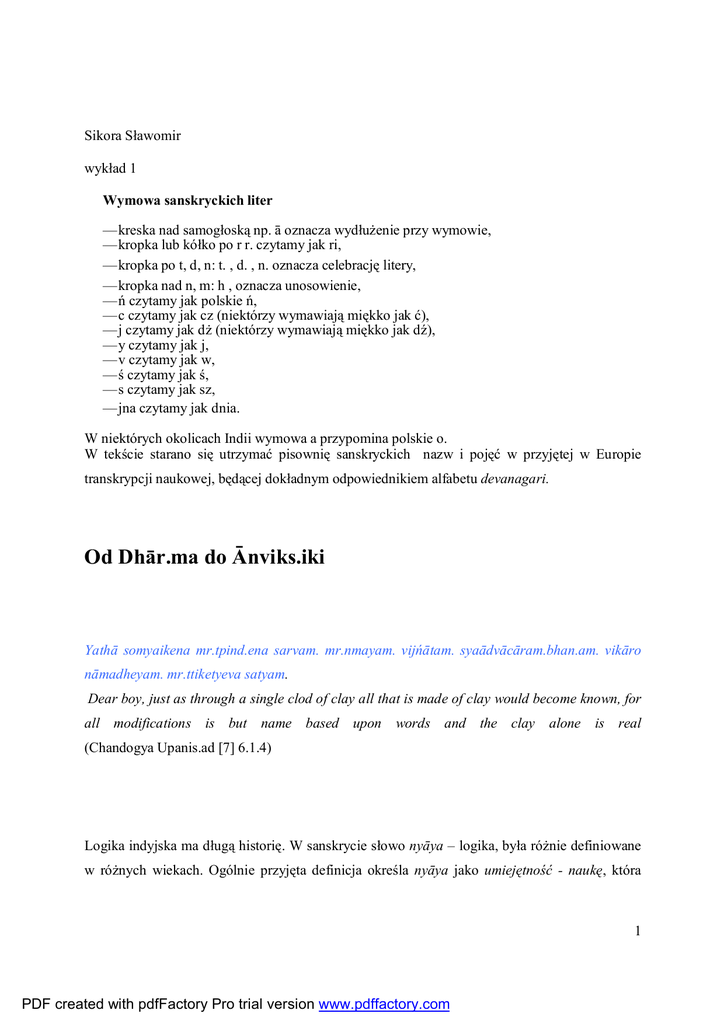 Sikora Sławomir wykład 1 Wymowa sanskryckich liter — kreska nad samogłoską np. ā oznacza wydłużenie przy wymowie, — kropka lub kółko po r r. czytamy jak ri, — kropka po t, d, n: t. , d. , n. oznacza celebrację litery, — kropka nad n, m: h , oznacza unosowienie, — ń czytamy jak polskie ń, — c czytamy jak cz (niektórzy wymawiają miękko jak ć), — j czytamy jak dż (niektórzy wymawiają miękko jak dź), — y czytamy jak j, — v czytamy jak w, — ś czytamy jak ś, — s czytamy jak sz, — jna czytamy jak dnia. W niektórych okolicach Indii wymowa a przypomina polskie o. W tekście starano się utrzymać pisownię sanskryckich nazw i pojęć w przyjętej w Europie transkrypcji naukowej, będącej dokładnym odpowiednikiem alfabetu devanagari. Od Dhār.ma do Ānviks.iki Yathā somyaikena mr.tpind.ena sarvam. mr.nmayam. vijńātam. syaādvācāram.bhan.am. vikāro nāmadheyam. mr.ttiketyeva satyam. Dear boy, just as through a single clod of clay all that is made of clay would become known, for all modifications is but name based upon words and the clay alone is real (Chandogya Upanis.ad [7] 6.1.4) Logika indyjska ma długą historię. W sanskrycie słowo nyāya – logika, była różnie definiowane w różnych wiekach. Ogólnie przyjęta definicja określa nyāya jako umiejętność - naukę, która 1 PDF created with pdfFactory Pro trial version www.pdffactory.com pozwala nam uznawać pewną wiedzę za ważną. Odnosi się do wiedzy nabytej na drodze poznania zmysłowego, jak również do pięciu figur inferencyjnych, porównywanych często z sylogizmami Arystotelesa. W opracowaniu ujmiemy logikę indyjską (w drugiej części również logikę chińską) dialektycznie; jako dwa wzajemnie warunkujące się i odniesione do siebie elementy: percepcję i inferencję. Zauważmy i podkreślmy w tym miejscu, że logika zachodnia, odmiennie do jej orientalnej siostry, w swoim ewolucyjnym rozwoju od Arystotelesa poprzez Stoików, Fregego, Godla, Tarskiego i wielu innych, całkowicie wyłącza element percepcji ze swoich rozważań. Systematyka historiograficzna dzieli logikę indyjską na trzy okresy rozwoju: 1. Starożytna logika indyjska (650 p.n.e – 100 n.e) 2. Średniowieczna logika indyjska (100 n.e. – 1000 n.e.) 3. Nowożytna logika indyjska (1000 n.e – 1920 n.e.) Dalszy podział może przebiegać następująco: Ad . 1. Starożytna logika indyjska 1.1 Wczesny okres starożytnej logiki indyjskiej Filozofia i logika Ānviks.iki . Najstarsza hinduska sztuka debatowania. Twórcą szkoły był mistrz Medhātihi Gautama 1.2 Środkowy okres logiki hinduskiej System logiki Nyāya – Śāstra mistrza Nārada. 1.3 Późny okres starożytnej logiki indyjskiej Nyāya- Śũtra mistrza Aks.apāda. Pierwsze systematyczne dzieło poświęcone nauce poprawnych rozumowań. . Ad.2. Średniowieczne szkoły logiki indyjskiej prāman.aśāstra 2.1 System logiki Jaina 2.2 Wczesna logika buddyjska Ārya Nāgārjuna 2.3 Prāman.a – samuccaya mistrza Dignaga, ojca średniowiecznej logiki buddyjskiej 2.4 Nyāya – bandu logika buddyjska mnichów Śilabhadra i Dharmakīrti 2 PDF created with pdfFactory Pro trial version www.pdffactory.com Ad.3 Nowożytna logika indyjska 3.1 Neo – brāhman.ic 3.2 Nyāya i Vaiśes.ika 3.3 Tattva – cintāman system logiczny mistrza Gangeśa Dzieło mistrza Gangeśa określane jest też jako Późna Nyāya, Nyāya Praveśa. O szerokiej popularność tematyki nyāya - logiki w kręgu kultury hinduskiej świadczy ogromne liczba komentarzy napisanych w polemice, czy też rozwinięciu do głównych dzieł. Na przykład do tekstu Nyāya - Śũtra autorstwa Gautama Aks.apāda powstały tak znakomite i autonomiczne komentarze jak: Nyāya – bhs.ya mistrza Vātsyāyana. Nyāya -vārtika mistrza Uddyotakara. Nyāya - vārtika - tātprarya-tīka Miśra Vācaspati. Naiyāyikas --tak nazywa się bardziej lub mniej znaczący komentatorów biegłych w nyāya. Przed logiką R.gveda ( ok 4000 lat p.n.e) — tłumaczenie Monier Williams.) In the beginning Then there What then In the Was was in there there Only the Nought else than Where was It day, Existent It One there then? was gulf night, Before? Universe? contained? of nor nor breathed was above. it profound death nor aught, teeming what the nor atmosphere this neither neither nought nor all of enveloped was neither sky enshrouded was Then was neither receptacle it Then there light, calmly, water? immortality, nor darkness, self contained. nought else above, beyond. was It found above? or Who knows? Who can declare? How and from what has sprung this Universe? The Who, gods themselves then, can are subsequent penetrate the to its secret development. of its Y;y;;y rise? 3 PDF created with pdfFactory Pro trial version www.pdffactory.com Whether Only twas That in framed the or highest not, heaven made sits, or the not made; omniscient lord, Assuredly knows all or haply knows He not. R.gveda X Mandal 129 W jednym z najwcześniejszych tekstów literatury starożytnych Indii (przed 500 p.n.e.) Brāhmanas, utrzymuje się, że Dhār.ma jest wieczna (sānatana). Słowo dhār.ma zostało przetłumaczone na język angielski jako religion. Tłumaczenie to nie do końca oddaje sens tego słowa w sanskrycie . Dhār.ma wywodzi się od czasownika dhr. - poparcie albo chwytać. W kontekście filozoficznym dhār.ma oznacza najczęściej sposób życia (sposób życia w grupie, w społeczności etnicznej). W Hinduizmie, dhār.ma jest doktryną odnoszącą się do moralnych praw i obowiązków każdej osoby. Takie zbiory praw i obowiązków mogą mieć swoją konotację religijną sankcjonowaną aktami wiary, ale również mogą też oznaczać normę społeczną, nakaz, właściwe zachowanie, obyczaj, albo po prostu coś, co Grecy nazywali cnotą. Uświęcone prawo społeczne jest kodyfikacją dhār.ma, a sam Hinduizm kulturowy nazywany jest często Dhār.ma Sānatana [ wieczna dhār.ma]. W zależności od interpretacji słow