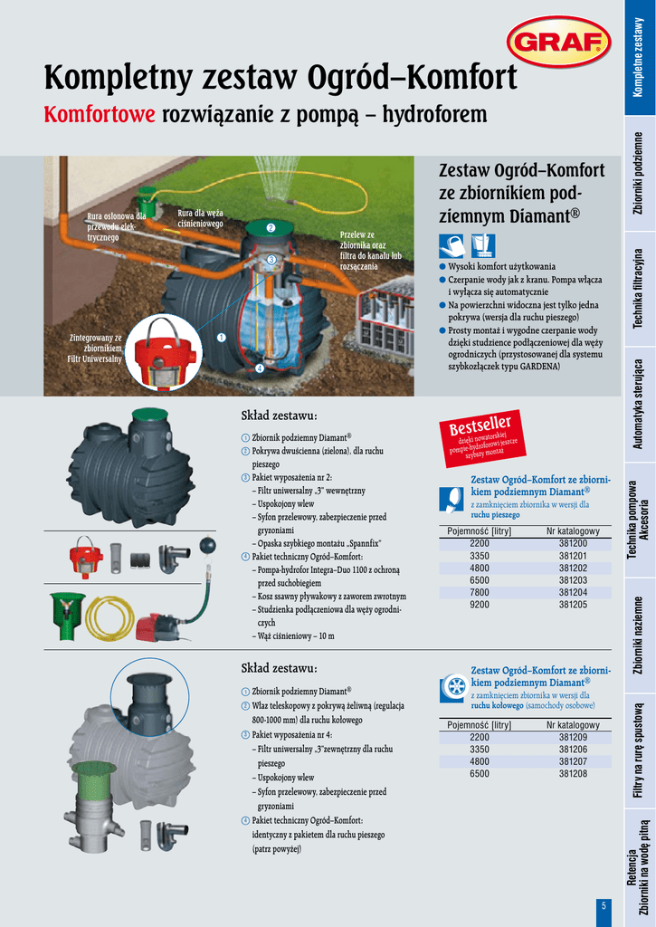 Kompletne zestawy Kompletny zestaw Ogród–Komfort Czerpanie wody jak z kranu. Pompa włącza 1 4 Skład zestawu: 2 3 4 Zbiornik podziemny Diamant® Pokrywa dwuścienna (zielona), dla ruchu pieszego Pakiet wyposażenia nr 2: – Filtr uniwersalny „3” wewnętrzny – Uspokojony wlew – Syfon przelewowy, zabezpieczenie przed gryzoniami – Opaska szybkiego montażu „Spannfix” Pakiet techniczny Ogród–Komfort: – Pompa-hydrofor Integra–Duo 1100 z ochroną przed suchobiegiem – Kosz ssawny pływakowy z zaworem zwrotnym – Studzienka podłączeniowa dla węży ogrodniczych – Wąż ciśnieniowy – 10 m Skład zestawu: 2 3 4 Zbiornik podziemny Diamant® Właz teleskopowy z pokrywą żeliwną (regulacja 800-1000 mm) dla ruchu kołowego Pakiet wyposażenia nr 4: – Filtr uniwersalny „3”zewnętrzny dla ruchu pieszego – Uspokojony wlew – Syfon przelewowy, zabezpieczenie przed gryzoniami Pakiet techniczny Ogród–Komfort: identyczny z pakietem dla ruchu pieszego (patrz powyżej) er Beięskitnosweatorllskiej cze dz jesz droforowi pompie-hy szy montaż yb sz Zestaw Ogród–Komfort ze zbiornikiem podziemnym Diamant® z zamknięciem zbiornika w wersji dla ruchu pieszego Pojemność [litry] 2200 3350 4800 6500 7800 9200 Nr katalogowy 381200 381201 381202 381203 381204 381205 Zestaw Ogród–Komfort ze zbiornikiem podziemnym Diamant® z zamknięciem zbiornika w wersji dla ruchu kołowego (samochody osobowe) Pojemność [litry] 2200 3350 4800 6500 Filtry na rurę spustową Zintegrowany ze zbiornikiem Filtr Uniwersalny i wyłącza się automatycznie Na powierzchni widoczna jest tylko jedna pokrywa (wersja dla ruchu pieszego) Prosty montaż i wygodne czerpanie wody dzięki studzience podłączeniowej dla węży ogrodniczych (przystosowanej dla systemu szybkozłączek typu GARDENA) Technika filtracyjna Wysoki komfort użytkowania Automatyka sterująca 3 Przelew ze zbiornika oraz filtra do kanału lub rozsączania Technika pompowa Akcesoria 2 Zbiorniki naziemne Rura dla węża ciśnieniowego Nr katalogowy 381209 381206 381207 381208 Retencja Zbiorniki na wodę pitną Rura osłonowa dla przewodu elektrycznego Zestaw Ogród–Komfort ze zbiornikiem podziemnym Diamant® Zbiorniki podziemne Komfortowe rozwiązanie z pompą – hydroforem