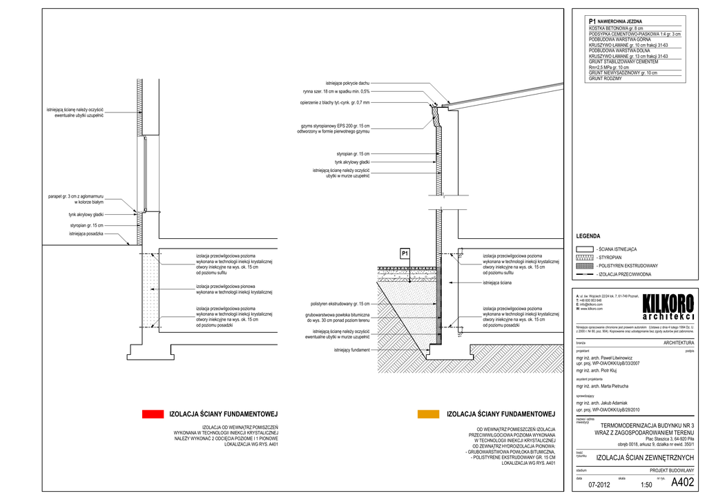 P1 NAWIERCHNIA JEZDNA KOSTKA BETONOWA gr. 8 cm PODSYPKA CEMENTOWO-PIASKOWA 1:4 gr. 3 cm PODBUDOWA WARSTWA GÓRNA KRUSZYWO ŁAMANE gr. 10 cm frakcji 31-63 PODBUDOWA WARSTWA DOLNA KRUSZYWO ŁAMANE gr. 13 cm frakcji 31-63 GRUNT STABILIZOWANY CEMENTEM Rm=2,5 MPa gr. 10 cm GRUNT NIEWYSADZINOWY gr. 10 cm GRUNT RODZIMY istniejące pokrycie dachu rynna szer. 18 cm w spadku min. 0,5% opierzenie z blachy tyt.-cynk. gr. 0,7 mm istniejącą ścianę należy oczyścić ewentualne ubytki uzupełnić gzyms styropianowy EPS 200 gr. 15 cm odtworzony w formie pierwotnego gzymsu styropian gr. 15 cm tynk akrylowy gładki istniejącą ścianę należy oczyścić ubytki w murze uzupełnić parapet gr. 3 cm z aglomarmuru w kolorze białym tynk akrylowy gładki styropian gr. 15 cm istniejąca posadzka LEGENDA - ŚCIANA ISTNIEJĄCA 15 P1 izolacja przeciwilgociowa pozioma wykonana w technologii iniekcji krystalicznej otwory iniekcyjne na wys. ok. 15 cm od poziomu sufitu - STYROPIAN - POLISTYREN EKSTRUDOWANY - IZOLACJA PRZECIWWODNA istniejąca ściana izolacja przeciwilgociowa pionowa wykonana w technologii iniekcji krystalicznej polistyren ekstrudowany gr. 15 cm izolacja przeciwilgociowa pozioma wykonana w technologii iniekcji krystalicznej otwory iniekcyjne na wys. ok. 15 cm od poziomu posadzki grubowarstwowa powłoka bitumiczna do wys. 30 cm ponad poziom terenu istniejącą ścianę należy oczyścić ewentualne ubytki w murze uzupełnić A: ul. św. Wojciech 22/24 lok. 7, 61-749 Poznań, T: +48 600 953 648 E: [email protected] W: www.kilkoro.com Niniejsze opracowanie chronione jest prawem autorskim (Ustawa z dnia 4 lutego 1994 Dz. U. z 2000 r. Nr 80, poz. 904). Kopiowanie oraz udostępnianie bez zgody autorów jest zabronione. 15 izolacja przeciwilgociowa pozioma wykonana w technologii iniekcji krystalicznej otwory iniekcyjne na wys. ok. 15 cm od poziomu posadzki izolacja przeciwilgociowa pozioma wykonana w technologii iniekcji krystalicznej otwory iniekcyjne na wys. ok. 15 cm od poziomu sufitu ARCHITEKTURA branża istniejący fundament projektant podpis mgr inż. arch. Paweł Litwinowicz upr. proj. WP-OIA/OKK/UpB/33/2007 mgr inż. arch. Piotr Kluj asystent projektanta mgr inż. arch. Marta Pietrucha sprawdzający IZOLACJA ŚCIANY FUNDAMENTOWEJ IZOLACJA ŚCIANY FUNDAMENTOWEJ IZOLACJA OD WEWNĄTRZ POMISZCZEŃ WYKONANA W TECHNOLOGII INIEKCJI KRYSTALICZNEJ NALEŻY WYKONAĆ 2 ODCIĘCIA POZIOME I 1 PIONOWE LOKALIZACJA WG RYS. A401 OD WEWNĄTRZ POMIESZCZEŃ IZOLACJA PRZECIWWILGOCIOWA POZIOMA WYKONANA W TECHNOLOGII INIEKCJI KRYSTALICZNEJ OD ZEWNĄTRZ HYDROIZOLACJA PIONOWA: - GRUBOWARSTWOWA POWŁOKA BITUMICZNA, - POLISTYRENE EKSTRUDOWANY GR. 15 CM LOKALIZACJA WG RYS. A401 mgr inż. arch. Jakub Adamiak upr. proj. WP-OIA/OKK/UpB/28/2010 nazwa i adres inwestycji TERMOMODERNIZACJA BUDYNKU NR 3 WRAZ Z ZAGOSPODAROWANIEM TERENU Plac Staszica 3, 64-920 Piła obręb 0018, arkusz 9, działka nr ewid. 350/1 treść rysunku IZOLACJA ŚCIAN ZEWNĘTRZNYCH PROJEKT BUDOWLANY stadium data skala 07-2012 nr rys. 1:50 A402