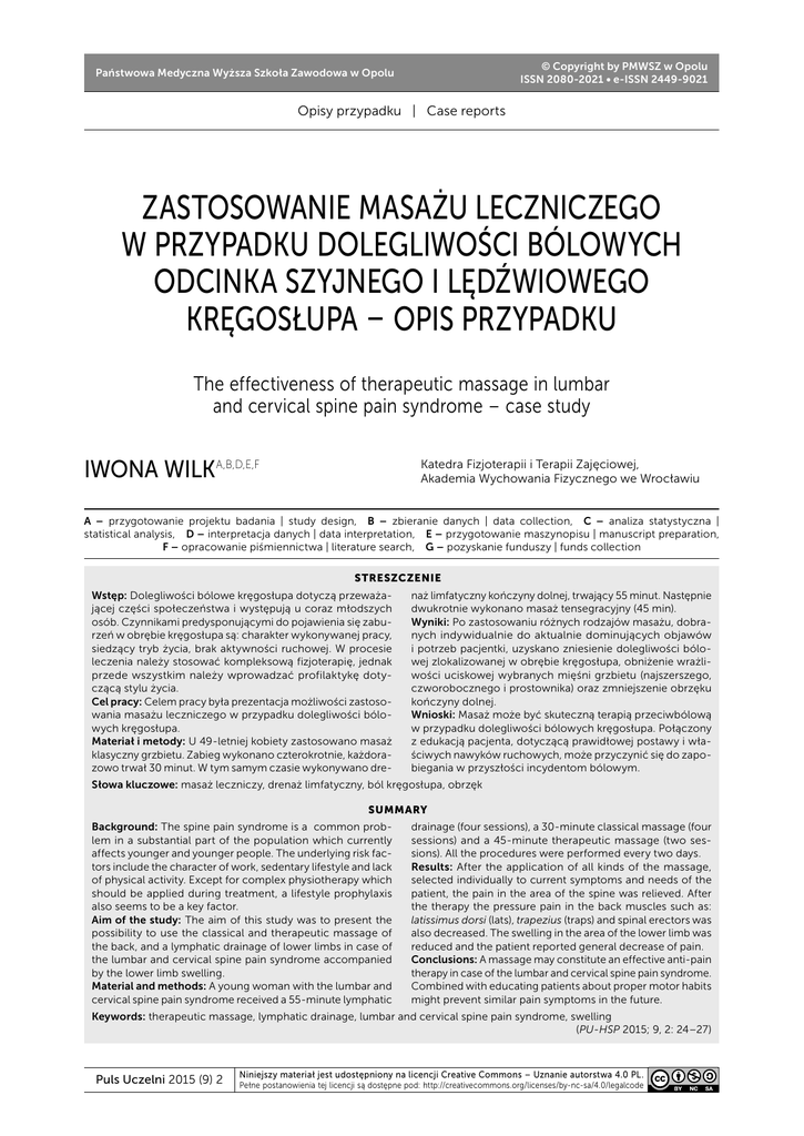 © Copyright by PMWSZ w Opolu ISSN 2080-2021 • e-ISSN 2449-9021 Państwowa Medyczna Wyższa Szkoła Zawodowa w Opolu Opisy przypadku | Case reports ZASTOSOWANIE MASAŻU LECZNICZEGO W PRZYPADKU DOLEGLIWOŚCI BÓLOWYCH ODCINKA SZYJNEGO I LĘDŹWIOWEGO KRĘGOSŁUPA – OPIS PRZYPADKU The effectiveness of therapeutic massage in lumbar and cervical spine pain syndrome – case study Iwona WilkA,B,D,E,F Katedra Fizjoterapii i Terapii Zajęciowej, Akademia Wychowania Fizycznego we Wrocławiu A – przygotowanie projektu badania | study design, B – zbieranie danych | data collection, C – analiza statystyczna | statistical analysis, D – interpretacja danych | data interpretation, E – przygotowanie maszynopisu | manuscript preparation, F – opracowanie piśmiennictwa | literature search, G – pozyskanie funduszy | funds collection STRESZCZENIE Wstęp: Dolegliwości bólowe kręgosłupa dotyczą przeważającej części społeczeństwa i występują u coraz młodszych osób. Czynnikami predysponującymi do pojawienia się zaburzeń w obrębie kręgosłupa są: charakter wykonywanej pracy, siedzący tryb życia, brak aktywności ruchowej. W procesie leczenia należy stosować kompleksową fizjoterapię, jednak przede wszystkim należy wprowadzać profilaktykę dotyczącą stylu życia. Cel pracy: Celem pracy była prezentacja możliwości zastosowania masażu leczniczego w przypadku dolegliwości bólowych kręgosłupa. Materiał i metody: U 49-letniej kobiety zastosowano masaż klasyczny grzbietu. Zabieg wykonano czterokrotnie, każdorazowo trwał 30 minut. W tym samym czasie wykonywano dre- naż limfatyczny kończyny dolnej, trwający 55 minut. Następnie dwukrotnie wykonano masaż tensegracyjny (45 min). Wyniki: Po zastosowaniu różnych rodzajów masażu, dobranych indywidualnie do aktualnie dominujących objawów i potrzeb pacjentki, uzyskano zniesienie dolegliwości bólowej zlokalizowanej w obrębie kręgosłupa, obniżenie wrażliwości uciskowej wybranych mięśni grzbietu (najszerszego, czworobocznego i prostownika) oraz zmniejszenie obrzęku kończyny dolnej. Wnioski: Masaż może być skuteczną terapią przeciwbólową w przypadku dolegliwości bólowych kręgosłupa. Połączony z edukacją pacjenta, dotyczącą prawidłowej postawy i właściwych nawyków ruchowych, może przyczynić się do zapobiegania w przyszłości incydentom bólowym. Słowa kluczowe: masaż leczniczy, drenaż limfatyczny, ból kręgosłupa, obrzęk SUMMARY Background: The spine pain syndrome is a common problem in a substantial part of the population which currently affects younger and younger people. The underlying risk factors include the character of work, sedentary lifestyle and lack of physical activity. Except for complex physiotherapy which should be applied during treatment, a lifestyle prophylaxis also seems to be a key factor. Aim of the study: The aim of this study was to present the possibility to use the classical and therapeutic massage of the back, and a lymphatic drainage of lower limbs in case of the lumbar and cervical spine pain syndrome accompanied by the lower limb swelling. Material and methods: A young woman with the lumbar and cervical spine pain syndrome received a 55-minute lymphatic drainage (four sessions), a 30-minute classical massage (four sessions) and a 45-minute therapeutic massage (two sessions). All the procedures were performed every two days. Results: After the application of all kinds of the massage, selected individually to current symptoms and needs of the patient, the pain in the area of the spine was relieved. After the therapy the pressure pain in the back muscles such as: latissimus dorsi (lats), trapezius (traps) and spinal erectors was also decreased. The swelling in the area of the lower limb was reduced and the patient reported general decrease of pain. Conclusions: A massage may constitute an effective anti-pain therapy in case of the lumbar and cervical spine pain syndrome. Combined with educating patients about proper motor habits might prevent similar pain symptoms in the future. Keywords: therapeutic massage, lymphatic drainage, lumbar and cervical spine pain syndrome, swelling (PU-HSP 2015; 9, 2: 24–27) Puls Uczelni 2015 (9) 2 Niniejszy materiał jest udostępniony na licencji Creative Commons – Uznanie autorstwa 4.0 PL. Pełne postanowienia tej licencji są dostępne pod: http://creativecommons.org/licenses/by-nc-sa/4.0/legalcode Iwona Wilk Zastosowanie masażu leczniczego w przypadku dolegliwości bólowych odcinka szyjnego i lędźwiowego kręgosłupa Wstęp Dolegliwości bólowe kręgosłupa stały się epidemią naszych czasów. Według różnych źródeł występują u 50–90% osób dorosłych w różnym okresie życia, prowadząc do ograniczenia sprawności fizycznej, częstych zwolnień chorobowych, hospitalizacji, trwałej niezdolności do pracy lub zmiany zawodu oraz zachowań depresyjnych [1,2]. W ostatnim czasie obserwuje się występowanie dolegliwości bólowych w obrębie kręgosłupa u coraz młodszych osób. Jedną z głównych przyczyn jest siedzący tryb życia, brak aktywności ruchowej, nieprawidłowe odżywianie. Coraz częściej u młodych ludzi ze względu na stopień zaawansowania występujących zmian stosuje się rehabilitację zamiast profilaktyki. W terapii zespołów bólowych kręgosłupa obok zabiegów fizykalnych i kinezyterapii wielokrotnie wykazywano przeciwbólowe działanie masażu klasycznego i leczniczego [1,3,4]. Masaż powoduje normalizację napięcia spoczynkowego mięśni i zwiększenie ruchomości stawów [2,3,5,6]. Poprawia ukrwienie opracowywanych struktur, usprawniając tym samym procesy regeneracyjne tkanek. Wpływa na receptory czucia powierzchownego i głębokiego zlokalizowane w skórze oraz w mięśniach szkieletowych, co powoduje pobudzenie kory mózgowej, wzmożoną impulsację i dzięki temu normalizację funkcji narządów wykonawczych. Istotnym aspektem zabiegów masażu jest jego poz