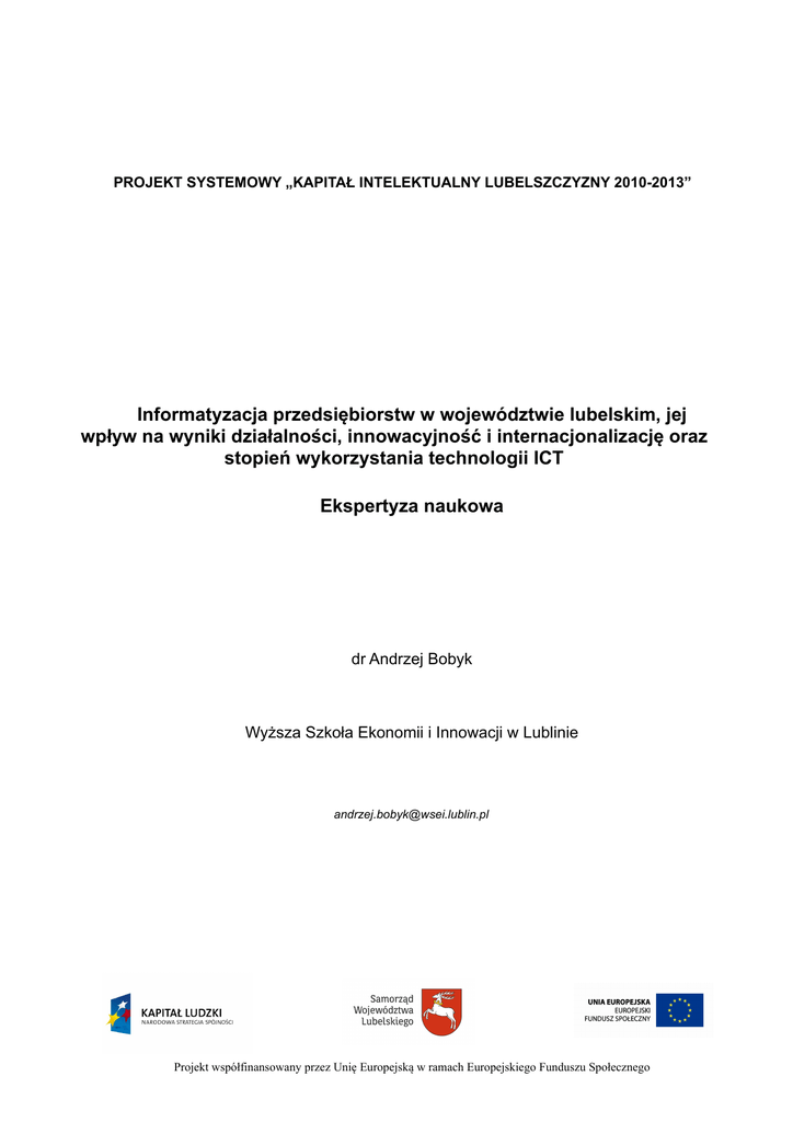 PROJEKT SYSTEMOWY „KAPITAŁ INTELEKTUALNY LUBELSZCZYZNY 2010-2013” Informatyzacja przedsiębiorstw w województwie lubelskim, jej wpływ na wyniki działalności, innowacyjność i internacjonalizację oraz stopień wykorzystania technologii ICT Ekspertyza naukowa dr Andrzej Bobyk Wyższa Szkoła Ekonomii i Innowacji w Lublinie [email protected] Projekt współfinansowany przez Unię Europejską w ramach Europejskiego Funduszu Społecznego Ekspertyza naukowa Strona 2 z 40 Informatyzacja przedsiębiorstw w województwie lubelskim, jej wpływ na wyniki działalności, innowacyjność i internacjonalizację oraz stopień wykorzystania technologii ICT Spis treści Spis treści................................................................................................................................................ 2 1.Opis problemu naukowego................................................................................................................. 3 2.Zastosowane narzędzia badawcze....................................................................................................... 3 3.Przebieg wykonania badania naukowego............................................................................................ 4 4.Rekomendowane rozwiązania........................................................................................................... 33 4.Wnioski.............................................................................................................................................. 36 Bibliografia........................................................................................................................................... 39 Projekt współfinansowany przez Unię Europejską w ramach Europejskiego Funduszu Społecznego Ekspertyza naukowa Strona 3 z 40 Informatyzacja przedsiębiorstw w województwie lubelskim, jej wpływ na wyniki działalności, innowacyjność i internacjonalizację oraz stopień wykorzystania technologii ICT 1. Opis problemu naukowego Przedmiotem niniejszej ekspertyzy naukowej jest ocena poziomu, jak również wpływu informatyzacji na wyniki działalności, innowacyjność i internacjonalizację oraz stopień wykorzystania technologii informacyjno-komunikacyjnych (ang. Information and Communication Technologies – ICT) w przedsiębiorstwach województwa lubelskiego. Zakres ekspertyzy obejmuje krótki opis badania naukowego, przedstawienie przebiegu jego wykonania i szczegółowy opis zastosowania wyników badania naukowego wraz z wnioskami. Ekspertyza została wykonana na zlecenie Województwa Lubelskiego w ramach umowy o dzieło, zawartej z Wykonawcą w dniu 9 października 2012 r., jako jeden z elementów projektu badawczego „Kapitał Intelektualny Lubelszczyzny 2010-2013”, realizowanego w ramach Priorytetu VIII Regionalne kadry gospodarki, Działanie 8.2 Transfer wiedzy, Poddziałanie 8.2.2 Regionalne Strategie Innowacji Programu Kapitał Ludzki na lata 2007-2013. Badaniu naukowemu poddany został obszar działalności przedsiębiorców województwa lubelskiego, związany z ich innowacyjnością, internacjonalizacją oraz wykorzystaniem nowoczesnych technologii informacyjno-komunikacyjnych, z położeniem nacisku na analizę wpływu na te zjawiska procesu informatyzacji, jaki ma miejsce na Lubelszczyźnie zgodnie z założeniami programu wojewódzkiego „Rozwój społeczeństwa informacyjnego dla Województwa Lubelskiego”1, m.in. w związku z wdrażaniem projektu „Sieć Szerokopasmowa Polski Wschodniej (SSPW)” w ramach Programu Operacyjnego „Rozwój Polski Wschodniej"2. 2. Zastosowane narzędzia badawcze Badanie przeprowadzono metodą desk research, analizując zarówno dokumenty źródłowe (analizy statystyczne i raporty), jak i materiały wtórne, dotyczące merytorycznego zakresu problematyki innowacyjności przedsiębiorstw, ze szczególnym uwzględnieniem sfery ICT. Przedstawiono dane statystyczne z lat 2006–2010 dotyczące wykorzystania ICT w przedsiębiorstwach dla województwa lubelskiego na tle analogicznych danych dla innych województw i Polski jako całości oraz podjęto próbę skorelowania tych danych z wybranymi wskaźnikami informatyzacji. Podstawą opracowania były dane statystyczne z roku 2012 zebrane przez Główny Urząd Statystyczny w drodze ankiet, skierowanych do reprezentatywnej grupy 650 przedsiębiorców z obszaru województwa lubelskiego. Scharakteryzowano również tendencje zachodzące w Europie, Polsce i na Lubelszczyźnie w dziedzinie informatyzacji i rozwoju technologii informacyjno-komunikacyjnych oraz sposobu ich wykorzystania w przedsiębiorstwach w kontekście ich innowacyjności i internacjonalizacji. 1 Program wojewódzki „Rozwój społeczeństwa informacyjnego dla województwa lubelskiego” , Urząd Marszałkowski Województwa Lubelskiego, http://www.lubelskie.pl/img/userfiles/files/teksty/SpoleInformacyjne.doc (dostęp: 6.12.2011). 2 Gruszecki P.: Lubelskie – Sieć Szerokopasmowa Polski Wschodniej, http://lubelskie.pl/index.php?pid=1550 (dostęp: 6.12.2011). Projekt współfinansowany przez Unię Europejską w ramach Europejskiego Funduszu Społecznego Ekspertyza naukowa Strona 4 z 40 Informatyzacja przedsiębiorstw w województwie lubelskim, jej wpływ na wyniki działalności, innowacyjność i internacjonalizację oraz stopień wykorzystania technologii ICT 3. Przebieg wykonania badania naukowego Nowoczesna firma, chcąc sprostać wymaganiom współczesnego rynku, nie dość, że skazana jest na ciągłe doskonalenie, to musi charakteryzować się także dynamizmem innowacyjnym. Proces ten polega na systematycznym poszukiwaniu doskonalszych i oszczędniejszych rozwiązań w zakresie technologii, organizacji wytwarzania, konstrukcji nowych wyrobów i stosowania nowych form ich sprzedaży, włączeniu wszystkich grup pracowników i rozbudzeniu skłonności do innowacji3. Technologie informacji i komunikacji, w tym Internet stwarzają nowe możliwości komunikac