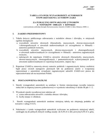 „OAV – OD” (2008.04.) TABELA STAWEK WYNAGRODZEŃ AUTORSKICH STOWARZYSZENIA AUTORÓW ZAiKS ZA PUBLICZNE ODTWARZANIE UTWORÓW Z NOŚNIKÓW OBRAZU I DŹWIĘKU (zatwierdzona uchwałą Zarządu Stowarzyszenia Autorów ZAiKS w dniu 26marca 2008 r.) I. ZAKRES PRZEDMIOTOWY 1. Tabela dotyczy publicznego odtwarzania z nośników obrazu i dźwięku, w miejscach ogólnie dostępnych: a. wszystkich utworów słownych (literackich), muzycznych, słowno-muzycznych i choreograficznych w utworach audiowizualnych (w szczególności w filmach) autorstwa polskich twórców, b. wszystkich utworów muzycznych, słowno-muzycznych i choreograficznych w utworach audiowizualnych (w szczególności w filmach) - autorstwa zagranicznych twórców, c. naleŜących do repertuaru ZAiKS-u utworów słownych (literackich), muzycznych, słowno-muzycznych, choreograficznych i pantomimicznych wykorzystanych poza utworami audiowizualnymi (w rejestracji koncertów, imprez itp.) 2. Repertuar ZAiKS-u stanowią utwory autorów polskich i zagranicznych, którzy osobiście bądź przez swoich następców prawnych lub na podstawie umów o wzajemnej reprezentacji z autorskimi związkami zagranicznymi udzielili ZAiKS-owi prawa do reprezentowania ich na terytorium Polski. II. POSTANOWIENIA OGÓLNE 1. Stawki wynagrodzeń autorskich są ustalane w formie miesięcznego ryczałtu (umowa stała) lub za imprezę (umowa jednorazowa) w wysokości określonej w dziale III pkt 1 i 2. 2. Wysokość stawki ryczałtowej jest zaleŜna od: a. czasu odtwarzania utworów z nośnika obrazu i dźwięku, b. liczby miejsc w obiekcie. 3. Stawki wynagrodzeń autorskich ustalone niniejszą tabelą nie obejmują podatku od towarów i usług (VAT). 4. NaleŜności z tytułu wynagrodzeń autorskich wyliczone na podstawie niniejszej tabeli, zaokrągla się do pełnych złotych według zasady: do 0,50 zł w dół, powyŜej 0,50 zł w górę. 1 „OAV – OD” (2008.04.) III. STAWKI 1. Umowa stała liczba miejsc do 15 godz. w miesiącu kaŜda następna. godz. 20 40,00 zł 2,70 zł 30 60,00 zł 4,00 zł 40 80,00 zł 5,35 zł 50 100,00 zł 6,70 zł kaŜde następne 5 miejsc 10,00 zł 0,67 zł liczba miejsc do 2 godzin kaŜda następna godz. 20 14,00 zł 2,70 zł 30 16,00 zł 4,00 zł 40 18,00 zł 5,35 zł 50 20,00 zł 6,70 zł kaŜde następne 5 miejsc 2,00 zł 0,67 zł 2. Umowa jednorazowa IV. PODWYśSZENIE STAWKI PodwyŜszenie stawki do 50 % stawki podstawowej stosuje się dla obiektów połoŜonych w miejscowościach atrakcyjnych turystycznie w okresie sezonu. V. UPUSTY 1. Upusty stosuje się wyłącznie na podstawie pisemnego wniosku podmiotu publicznie odtwarzającego utwory w następującej wysokości: a. dla kontrahentów, którzy wystąpili do Stowarzyszenia Autorów ZAiKS z wnioskiem o zawarcie stałej umowy, przed rozpoczęciem publicznego odtwarzania utworów, bez uprzedniego podjęcia działań przez Stowarzyszenie – upust: do 10% na okres 1 roku, b. dla kontrahentów, którzy zawarli stałą umowę i wpłacili wynagrodzenia autorskie z góry (bez moŜliwości zwrotu w przypadku wcześniejszego zakończenia publicznego odtwarzania utworów) – upusty: - do 15% - przy jednorazowej wpłacie za kwartał, - do 20% - przy jednorazowej wpłacie za pół roku, - do 25% - przy jednorazowej wpłacie za rok. 2 „OAV – OD” (2008.04.) 2. Łączna kwota upustów nie moŜe przekroczyć 30% naleŜnych wynagrodzeń autorskich. VI. POSTANOWIENIA KOŃCOWE 1. Stawki wynagrodzeń podlegać będą zmianie (waloryzacji) w okresach rocznych na dzień 1 kwietnia, począwszy od dnia 1 kwietnia 2009 roku, z uwzględnieniem średniorocznego wskaźnika cen towarów i usług konsumpcyjnych w poprzednim roku, ogłaszanego przez Prezesa GUS. Waloryzacja na dany rok będzie dokonywana, o ile od ostatniego ustalenia wysokości stawki ceny towarów i usług konsumpcyjnych wzrosną nie mniej, niŜ 1 %. Waloryzacja stawki dokonywana będzie równieŜ w przypadku, gdy w kaŜdym z kolejnych trzech lat wskaźnik, o którym mowa powyŜej będzie niŜszy, niŜ 1%, zaś suma wskaźników za cały okres trzyletni przekroczy 2,5%. 2. Tabela wchodzi w Ŝycie z dniem 1 kwietnia 2008 r. 3
