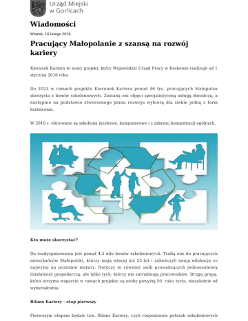 Wiadomości Wtorek, 16 lutego 2016 Pracujący Małopolanie z szansą na rozwój kariery Kierunek Kariera to nowy projekt, który Wojewódzki Urząd Pracy w Krakowie realizuje od 1 stycznia 2016 roku. Do 2023 w ramach projektu Kierunek Kariera ponad 46 tys. pracujących Małopolan skorzysta z bonów szkoleniowych. Zostaną oni objęci specjalistyczną usługą doradczą, a następnie na podstawie stworzonego planu rozwoju wybiorą dla siebie jedną z form kształcenia. W 2016 r. oferowane są szkolenia językowe, komputerowe i z zakresu kompetencji ogólnych. Kto może skorzystać? Do rozdysponowania jest ponad 4,5 mln bonów szkoleniowych. Trafią one do pracujących mieszkańców Małopolski, którzy mają więcej niż 25 lat i zakończyli swoją edukację co najwyżej na poziomie matury. Dotyczy to również osób prowadzących jednoosobową działalność gospodarczą, ale tylko tych, którzy nie zatrudniają pracowników. Drugą grupą, która otrzyma wsparcie w ramach projektu są osoby powyżej 50. roku życia, niezależnie od wykształcenia. Bilans Kariery - etap pierwszy Pierwszym etapem będzie tzw. Bilans Kariery, czyli rozpoznanie potrzeb szkoleniowych klientów i wsparcie ich w podjęciu decyzji o dalszej drodze zawodowej. W trakcie Bilansu uczestnicy odkryją i uporządkują wraz z doradcą zawodowym, wszystko to, co wiedzą i umieją. Będą mogli lepiej określić swoje możliwości, to co chcą robić w przyszłości, jak się kształcić czy jakie szkolenie wybrać. Uczestnicy dowiedzą się, co stanowi ich przewagę na rynku pracy. W efekcie poznają swoje możliwości, potencjał i skompletują portfolio, a doradca pomoże im stworzyć indywidualny plan rozwoju edukacyjno-zawodowego. Bilans jest pierwszym krokiem do otrzymania bonów szkoleniowych. Bony szkoleniowe - etap drugi W drugiej połowie roku zostanie uruchomiony system bonów szkoleniowych, dzięki któremu uczestnicy na bazie stworzonego z doradcą planu rozwoju wybiorą dla siebie jedną z form kształcenia: szkolenie czy np. przystąpienie do egzaminu z języka obcego. W 2016 roku w ofercie znajdą się szkolenia językowe, komputerowe i z zakresu kompetencji ogólnych. Uczestnicy otrzymają bony szkoleniowe po podpisaniu odpowiedniej umowy i wpłacie max. 14% wartości tych bonów. Oferty kształcenia będą dostępne w bazie tworzonej w ramach projektu. Baza ta będzie obejmowała usługi jedynie tych instytucji szkoleniowych, które spełnią wymogi jakościowe. Czym są bony? Bony szkoleniowe to prosty, szybki, nastawiony na jakość i dający swobodę wyboru sposób na rozwinięcie swoich kompetencji lub podniesienie kwalifikacji. System podmiotowego finansowania kształcenia (przez bony szkoleniowe) daje możliwość skorzystania z funduszy unijnych bez zbędnych formalności. Uczestnik szkolenia nie musi przechodzić skomplikowanych procedur naboru. Ma możliwość wyboru szkolenia dostosowanego do swoich potrzeb, a płatności w formie bonów ułatwiają rozliczenie. Gdzie zgłosić się na Bilans Kariery? Wojewódzki Urząd Pracy w Krakowie (plac Na Stawach 1, 30-107 Kraków, tel. (12) 42 27 110, e-mail: [email protected]) zaprasza zainteresowane osoby, spełniające wymogi dotyczące zatrudnienia, wieku i wykształcenia do udziału w Bilansie Kariery i szkoleniach finansowanych przy pomocy bonów. Na Bilans Kariery należy zgłosić się z wypełnionym formularzem zgłoszeniowym. Szczegółowe informacje znajdują się na stronie www.pociagdokariery.pl Usługę Bilansu Kariery oferują: Centrum Informacji i Planowania Kariery Zawodowej w Krakowie e-mail: [email protected] tel.: (12) 424 07 38 Centrum Informacji i Planowania Kariery Zawodowej w Nowym Sączu e-mail: [email protected] tel.: (18) 442 94 90 Centrum Informacji i Planowania Kariery Zawodowej w Tarnowie e-mail: [email protected] tel.: (14) 626 99 40 Źródło: www.fundusze.malopolska.pl, www.pociagdokariery.pl