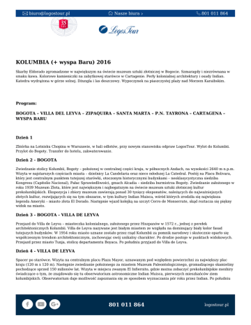 [email protected] Nasze biura 801 011 864 KOLUMBIA (+ wyspa Baru) 2016 Skarby Eldorado zgromadzone w największym na świecie muzeum sztuki złotniczej w Bogocie. Szmaragdy i niezrównana w smaku kawa. Kolorowe kamieniczki na zabytkowej starówce w Cartagenie. Perły kolonialnej architektury i osady Indian. Katedra wydrążona w górze solnej. Dżungla i las deszczowy. Wypoczynek na piaszczystej plaży nad Morzem Karaibskim. Program: BOGOTA – VILLA DEL LEYVA – ZIPAQUIRA – SANTA MARTA – P.N. TAYRONA – CARTAGENA – WYSPA BARU Dzień 1 Zbiórka na Lotnisku Chopina w Warszawie, w hali odlotów, przy nowym stanowisku odpraw LogosTour. Wylot do Kolumbii. Przylot do Bogoty. Transfer do hotelu, zakwaterowanie. Dzień 2 - BOGOTA Zwiedzanie stolicy Kolumbii, Bogoty – położonej w centralnej części kraju, w północnych Andach, na wysokości 2640 m n.p.m. Wizyta w najstarszych częściach miasta – dzielnicy La Candelaria oraz nieco młodszej La Catedral. Postój na Placu Bolivara, który jest centralnym punktem tutejszej starówki, otoczonym historycznymi budynkami – neoklasycystyczna siedziba Kongresu (Capitolio Nacional), Pałac Sprawiedliwości, gmach Alcadia – siedziba burmistrza Bogoty. Zwiedzanie założonego w roku 1939 Muzeum Złota, które jest największym i najbogatszym na świecie muzeum sztuki złotniczej kultur prekolumbijskich. Ekspozycja i zbiory muzeum zawierają ponad 30 tysięcy eksponatów, należących do najważniejszych złotych kultur, rozwijających się na tym obszarze, w tym kultury Indian Muisca, wśród których zrodziła się największa legenda Ameryki – miasto złota El Dorado. Następnie wjazd kolejką na szczyt Cerro de Monserrate, skąd roztacza się piękny widok na miasto. Dzień 3 - BOGOTA - VILLA DE LEYVA Przejazd do Villa de Leyva – miasteczka kolonialnego, założonego przez Hiszpanów w 1572 r., jednej z perełek architektonicznych Kolumbii. Villa de Leyva nazywane jest białym miastem ze względu na dominujący biały kolor fasad tutejszych budynków. W 1954 roku miasto uznane zostało przez rząd Kolumbii za pomnik narodowy i skutecznie oparło się współczesnym trendom architektonicznym, zachowując swój unikalny charakter. Po drodze postoje w punktach widokowych. Przejazd przez miasto Tunja, stolicę departamentu Boyaca. Po południu przyjazd do Villa de Leyva. Dzień 4 - VILLA DE LEYVA Spacer po starówce. Wizyta na centralnym placu Plaza Mayor, uznawanym pod względem powierzchni za największy plac kraju (120 m x 120 m). Następnie zwiedzanie położonego za miastem Muzeum Paleontologicznego, gromadzącego skamieliny pochodzące sprzed 150 milionów lat. Wizyta w miejscu zwanym El Infiernito, gdzie można zobaczyć prekolumbijskie menhiry świadczące o tym, że znajdowało się tu obserwatorium astronomiczne Indian Muisca, pierwszych mieszkańców ziem kolumbijskich. Obserwatorium daje możliwość zapoznania się ze sposobem wyznaczania pór roku przez Indian. Po południu 801 011 864 logostour.pl [email protected] Nasze biura 801 011 864 okazja do odwiedzenia okolicznych sklepów oferujących wyroby tkackie i inne przykłady lokalnego rękodzieła. Dzień 5 - RAQUIRA - CHIQUINQUIRA - ZIPAQUIRA Wycieczka do Zipaquirá, miejscowości słynącej z bogatych pokładów soli eksploatowanych już w czasach prekolumbijskich przez Indian Muisca. Po drodze postoje w wioskach Raquira i Chiquinquirá, dające możliwość spotkania z lokalnym folklorem. Po przyjeździe do Zipaquira zwiedzanie lokalnej osobliwości o światowej sławie – katedry wydrążonej w górze solnej. Katedra może pomieści 8500 osób. Przejazd do Bogoty. Dzień 6 - SANTA MARTA - P.N. TAYRONA Przelot samolotem z Bogoty do Santa Marta – najstarszego miasta Kolumbii, położonego na wybrzeżu Morza Karaibskiego. Przejazd do Parku Narodowego Tayrona, ciągnącego się wzdłuż wybrzeża porośniętego dżunglą. Park jest ogromnie interesujący ze względu na swoją różnorodność. Znajduje się tu nie tylko piękna plaża i bogata rafa koralowa, ale i las deszczowy. W przeszłości teren parku zamieszkiwany był przez Indian Tayrona. Dzień 7 - SANTA MARTA - CARTAGENA Przejazd drogą wzdłuż wybrzeża. Postój w Barranquilla – czwartym co do wielkości mieście Kolumbii, położonym przy ujściu rzeki Magdalena do Morza Karaibskiego. Przyjazd na nocleg do najbardziej fascynującego i najpiękniejszego miasta Kolumbii, perły architektury kolonialnej – Cartageny. Jest ono położone malowniczo na wybrzeżu Morza Karaibskiego. Zostało założone w 1533 roku i jako jedno z pierwszych miast Kolumbii ogłosiło niepodległość 11 listopada 1811 roku. Cartagena od lat przyciąga turystów z całego świata niepowtarzalnym urokiem architektury i karaibską atmosferą. Dzień 8 - CARTAGENA Zwiedzanie Cartageny. Zabytkowy zespół Cartageny obejmuje stare miasto otoczone murami, twierdzę oraz port. Główna atrakcja miasta to zabytkowa część położona w obrębie murów obronnych. Spacer nastrojowymi uliczkami i zaułkami starego miasta o unikalnej, kolonialnej zabudowie, wśród kamieniczek z pięknie ukwieconymi balkonami. Małe werandy, okna z wnękami przydają miastu niepowtarzalnego uroku. Wizyta na Placu Bolivara. Zwiedzanie XVII-wiecznej fortecy Castillo de San Felipe de Barajas. Wjazd na najwyższe wzgórze w Cartagenie, gdzie znajduje się Convento de la Popa i skąd roztacza się niezapomniany widok na miasto. Chwila czasu wolnego na zakupy w sklepikach z rękodziełem artystycznym oraz piękną biżuterią (słynne kolumbijskie szmaragdy). Dzień 9 - WYSPA BARU Transfer na wyspę Baru, położoną u wybrzeży Morza Karaibskiego, w niewielkiej odległości od Cartageny (ok. 1,5 godz.). Baru oferuje ciepłe i krystalicznie czyste wody, białe, szerokie, piaszczyste plaże, owoce morza. Dzień 10 - WYSPA BARU Wypoczynek na plażach Baru. Plażowanie, kąpiele, możliwość uprawiania sportów wodnych – snorkeling, nurkowanie. Dzień 11 - WY