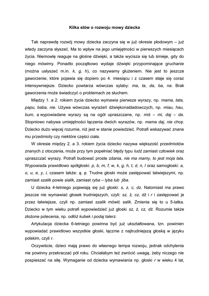 Kilka słów o rozwoju mowy dziecka Tak naprawdę rozwój mowy dziecka zaczyna się w już okresie płodowym – już wtedy zaczyna słyszeć. Ma to wpływ na jego umiejętności w pierwszych miesiącach życia. Niemowlę reaguje na głośne dźwięki, a także wycisza się lub śmieje, gdy do niego mówimy. Ponadto początkowo wydaje dźwięki przypominające gruchanie (można usłyszeć m.in. k, g, h), co nazywamy głużeniem. Nie jest to jeszcze gaworzenie, które pojawia się dopiero po 4. miesiącu i z czasem staje się coraz intensywniejsze. Dziecko powtarza wówczas sylaby: ma, ta, da, ba, na. Brak gaworzenia może świadczyć o problemach ze słuchem. Między 1. a 2. rokiem życia dziecko wymawia pierwsze wyrazy, np. mama, tata, papu, baba, nie. Używa wówczas wyrażeń dźwiękonaśladowczych, np. miau, hau, bum, a wypowiadane wyrazy są na ogół upraszczane, np. miś – mi, daj – da. Stopniowo nabywa umiejętności łączenia dwóch wyrazów, np. mama daj, nie chcę. Dziecko dużo więcej rozumie, niż jest w stanie powiedzieć. Potrafi wskazywać znane mu przedmioty czy niektóre części ciała. W okresie między 2. a 3. rokiem życia dziecko nazywa większość przedmiotów znanych z otoczenia, może przy tym popełniać błędy typu ludź zamiast człowiek oraz upraszczać wyrazy. Potrafi budować proste zdania, nie ma mamy, to jest moja lala. Wypowiada prawidłowo spółgłoski: p, b, m, f, w, k, g, h, t, d, n, l oraz samogłoski: a, o, u, e, y, i, czasem także: ą, ę. Trudne głoski może zastępować łatwiejszymi, np. zamiast szalik powie sialik, zamiast ryba – lyba lub jiba. U dziecka 4-letniego pojawiają się już głoski: s, z, c, dz. Natomiast ma prawo jeszcze nie wymawiać głosek trudniejszych, czyli: sz, ż, cz, dż i r i zastępować je przez łatwiejsze, czyli np. zamiast szalik mówić salik. Zmienia się to u 5-latka. Dziecko w tym wieku potrafi wypowiedzieć już głoski sz, ż, cz, dż. Rozumie także złożone polecenia, np. odłóż kubek i podaj talerz. Artykulacja dziecka 6-letniego powinna być już ukształtowana, tzn. powinien wypowiadać prawidłowo wszystkie głoski, łącznie z najtrudniejszą głoską w języku polskim, czyli r. Oczywiście, dzieci mają prawo do własnego tempa rozwoju, jednak odchylenia nie powinny przekraczać pół roku. Chciałabym też zwrócić uwagę, żeby niczego nie pospieszać na siłę. Wymaganie od dziecka wymawiania np. głoski r w wieku 4 lat, kiedy jego aparat artykulacyjny nie jest na to przygotowany może doprowadzić do wady wymowy. Mgr Agnieszka Nowak-Jania, logopeda Opracowano na podstawie: dr Iwona Michalak-Widera, mgr Katarzyna Węgierska „Kamienie milowe w rozwoju mowy dziecka od 0 do 6 roku życia”.
