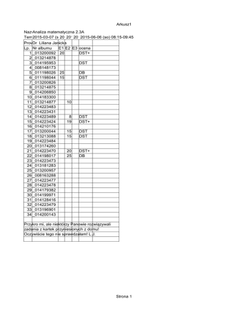 Arkusz1 Nazwa Analiza kursumatematyczna 2.3A Termin 2015-03-07 (so) 2015-05-09 08:15-09:45 2015-05-16 2015-05-30 2015-06-06 (so)(so) 08:15-09:45 (so) 08:15-09:45 (so) 08:15-09:45 08:15-09:45 Prowadzケcy Dr Liliana Janicka Lp. Nr albumu E1 E2 E3 1 _013200092 20 2 _013214878 3 _014195953 4 _008148173 5 _011198026 25 6 _011198044 15 7 _013200826 8 _013214875 9 _014206850 10 _014183300 11 _013214877 10 12 _014223483 13 _014223431 14 _014223489 8 15 _014223424 19 16 _014210176 17 _013200044 15 18 _013213088 15 19 _014223484 20 _013174260 21 _014223470 20 22 _014198017 25 23 _014223473 24 _013181283 25 _013200957 26 _008163288 27 _014223477 28 _014223478 29 _014179382 30 _014199971 31 _014128416 32 _014223479 33 _013196901 34 _014200143 ocena DST+ DST DB DST DST DST+ DST DST DST+ DB Przykro mi, ale niektórzy Panowie rozwiązywali zadania z kartek przyniesionych z domu! Oczywiście tego nie sprawdzałam! L.J. Strona 1