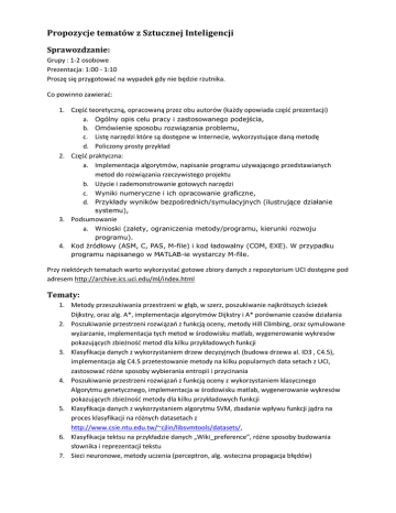 Propozycje tematów z Sztucznej Inteligencji Sprawozdzanie: Grupy : 1-2 osobowe Prezentacja: 1:00 - 1:10 Proszę się przygotować na wypadek gdy nie będzie rzutnika. Co powinno zawierać: 1. Część teoretyczną, opracowaną przez obu autorów (każdy opowiada część prezentacji) a. Ogólny opis celu pracy i zastosowanego podejścia, b. Omówienie sposobu rozwiązania problemu, c. Listę narzędzi które są dostępne w Internecie, wykorzystujące daną metodę d. Policzony prosty przykład 2. Część praktyczna: a. Implementacja algorytmów, napisanie programu używającego przedstawianych metod do rozwiązania rzeczywistego projektu b. Użycie i zademonstrowanie gotowych narzędzi c. Wyniki numeryczne i ich opracowanie graficzne, d. Przykłady wyników bezpośrednich/symulacyjnych (ilustrujące działanie systemu), 3. Podsumowanie a. Wnioski (zalety, ograniczenia metody/programu, kierunki rozwoju programu). 4. Kod źródłowy (ASM, C, PAS, M-file) i kod ładowalny (COM, EXE). W przypadku programu napisanego w MATLAB-ie wystarczy M-file. Przy niektórych tematach warto wykorzystać gotowe zbiory danych z repozytorium UCI dostępne pod adresem http://archive.ics.uci.edu/ml/index.html Tematy: 1. Metody przeszukiwania przestrzeni w głąb, w szerz, poszukiwanie najkrótszych ścieżek Dijkstry, oraz alg. A*, implementacja algorytmów Dijkstry i A* porównanie czasów działania 2. Poszukiwanie przestrzeni rozwiązań z funkcją oceny, metody Hill Climbing, oraz symulowane wyżarzanie, implementacja tych metod w środowisku matlab, wygenerowanie wykresów pokazujących zbieżność metod dla kilku przykładowych funkcji 3. Klasyfikacja danych z wykorzystaniem drzew decyzyjnych (budowa drzewa al. ID3 , C4.5), implementacja alg C4.5 przetestowanie metody na kilku popularnych data setach z UCI, zastosować różne sposoby wybierania entropii i przycinania 4. Poszukiwanie przestrzeni rozwiązań z funkcją oceny z wykorzystaniem klasycznego Algorytmu genetycznego, implementacja w środowisku matlab, wygenerowanie wykresów pokazujących zbieżność metody dla kilku przykładowych funkcji 5. Klasyfikacja danych z wykorzystaniem algorytmu SVM, zbadanie wpływu funkcji jądra na proces klasyfikacji na różnych datasetach z http://www.csie.ntu.edu.tw/~cjlin/libsvmtools/datasets/, 6. Klasyfikacja tektsu na przykładzie danych „Wiki_preference”, różne sposoby budowania słownika i reprezentacji tekstu 7. Sieci neuronowe, metody uczenia (perceptron, alg. wsteczna propagacja błędów) 8. 9. 10. 11. 12. 13. 14. Sieci probabilistyczne (wnioskowanie bayesowskie) Zbiory rozmyte i logika rozmyta, sterownik rozmyty Zbiory przybliżone i generowanie reguł Klasyfikacja obrazów (wybraną metodą), reprezentacje obrazu, wybór cech Klasyfikacja tekstów (wybraną metodą), reprezentacje tekstu, wybór cech Regresja, metody uczenia się z danych Algortym SVM (suport vector machines)