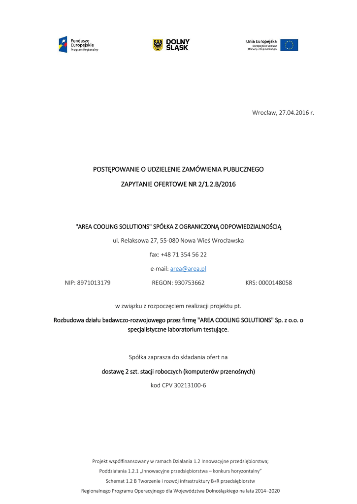 Wrocław, 27.04.2016 r. POSTĘPOWANIE O UDZIELENIE ZAMÓWIENIA PUBLICZNEGO ZAPYTANIE OFERTOWE NR 2/1.2.B/2016 "AREA COOLING SOLUTIONS" SPÓŁKA Z OGRANICZONĄ ODPOWIEDZIALNOŚCIĄ ul. Relaksowa 27, 55-080 Nowa Wieś Wrocławska fax: +48 71 354 56 22 e-mail: [email protected] NIP: 8971013179 REGON: 930753662 KRS: 0000148058 w związku z rozpoczęciem realizacji projektu pt. Rozbudowa działu badawczo-rozwojowego przez firmę "AREA COOLING SOLUTIONS" Sp. z o.o. o specjalistyczne laboratorium testujące. Spółka zaprasza do składania ofert na dostawę 2 szt. stacji roboczych (komputerów przenośnych) kod CPV 30213100-6 Projekt współfinansowany w ramach Działania 1.2 Innowacyjne przedsiębiorstwa; Poddziałania 1.2.1 „Innowacyjne przedsiębiorstwa – konkurs horyzontalny” Schemat 1.2 B Tworzenie i rozwój infrastruktury B+R przedsiębiorstw Regionalnego Programu Operacyjnego dla Województwa Dolnośląskiego na lata 2014–2020 I. Zamawiający: "AREA COOLING SOLUTIONS" Sp. z o.o. ul. Relaksowa 27 55-080 Nowa Wieś Wrocławska II. Tryb udzielenia zamówienia Zgodnie z zasadą konkurencyjności opisaną w punktach 6.5.1 oraz 6.5.3 Wytycznych w zakresie kwalifikowalności wydatków w ramach Europejskiego Funduszu Rozwoju Regionalnego, Europejskiego Funduszu Społecznego oraz Funduszu Spójności na lata 20142020. III. Opis przedmiotu zamówienia Przedmiotem zamówienia jest dostawa 2 szt. mobilnych stacji roboczych (komputerów przenośnych) o parametrach technicznych nie niższych/nie gorszych niż: Procesor: Liczba rdzeni - 4; Taktowanie - 2,8 GHz, Wydajność osiągający minimum 8000 punktów w testach: http://www.cpubenchmark.net Ekran: matowy Przekątna ekranu: min. 17,3" Rozdzielczość: Full HD [1920 x 1080] Pamięć RAM: 32 GB w technologii DDR3 Dysk twardy: min. SSD 250 GB (minimum 88.000 IOPS) + HDD 1 TB Karta graficzna: Typ karty: dedykowana Liczba rdzeni: minimum 640 Pamięć: GDDR5 Wielkość pamięci: minimum 2GB Przepustowość: minimum 80GB/s Interfejs pamięci: minimum 128bit Obsługiwane standardy: OpenGL 4.5, Shader model 5.0, DirectX 12 Przyłącza: Display port 1.2 Interfejs: PCI-E generacja 3 Bateria: Typ baterii: Li-Ion Czas pracy na baterii [min]: minimum 720 Liczba komór baterii: 8 Gwarancja: minimum 3 lata Projekt współfinansowany w ramach Działania 1.2 Innowacyjne przedsiębiorstwa; Poddziałania 1.2.1 „Innowacyjne przedsiębiorstwa – konkurs horyzontalny” Schemat 1.2 B Tworzenie i rozwój infrastruktury B+R przedsiębiorstw Regionalnego Programu Operacyjnego dla Województwa Dolnośląskiego na lata 2014–2020 IV. Termin i miejsce realizacji zamówienia Termin dostawy: najpóźniej do 11.05.2016 r. Miejsce: ul. Relaksowa 27, 55-080 Nowa Wieś Wrocławska V. Warunki udziału w postępowaniu oraz opis sposobu dokonywania oceny spełniania tych warunków O udzielenie zamówienia mogą ubiegać się Wykonawcy, którzy: 1. posiadają uprawnienia do wykonywania określonej działalności lub czynności, jeżeli ustawy nakładają obowiązek posiadania takich uprawnień, 2. posiadają odpowiednią wiedzę i doświadczenie do realizacji zamówienia, 3. dysponują odpowiednim potencjałem technicznym oraz osobami zdolnymi do wykonania zamówienia; 4. nie są powiązani osobowo i kapitałowo z zamawiającym. Przez powiązania kapitałowe lub osobowe rozumie się wzajemne powiązania między zamawiającym lub osobami upoważnionymi do zaciągania zobowiązań w mieniu zamawiającego lub osobami wykonującymi w imieniu zamawiającego czynności związane z przygotowaniem i przeprowadzaniem procedury wyboru wykonawcy, a wykonawcą, polegające w szczególności na: a) uczestniczeniu w spółce, jako wspólnik spółki cywilnej lub spółki osobowej, b) posiadaniu co najmniej 10 % udziałów lub akcji, c) pełnieniu funkcji członka organu nadzorczego lub zarządzającego, prokurenta, pełnomocnika, d) pozostawaniu w związku małżeńskim, w stosunku pokrewieństwa lub powinowactwa w linii prostej, pokrewieństwa drugiego stopnia lub powinowactwa drugiego stopnia w linii bocznej lub w stosunku przysposobienia, opieki lub kurateli. Zamawiający nie stawia szczególnych wymagań w zakresie spełniania powyższych warunków. Wykonawca potwierdzi spełnianie ww. warunków poprzez złożenie oświadczenia stanowiącego Załącznik nr 2. VI. Sposób obliczania ceny oferty Wszystkie kwoty należy podać w PLN oraz zaokrąglać do 2 miejsc po przecinku. Stawki podatku VAT należy obliczyć zgodnie z obowiązującymi przepisami. Wykonawca powinien sporządzić ofertę podając cenę netto, należny podatek VAT i cenę brutto. VII. Kryteria oceny i wyboru ofert 100% - cena Sposób wyliczania punktów: C = (Cmin/Cof) x 100 gdzie: Cmin - najniższa cena wśród składanych ofert Projekt współfinansowany w ramach Działania 1.2 Innowacyjne przedsiębiorstwa; Poddziałania 1.2.1 „Innowacyjne przedsiębiorstwa – konkurs horyzontalny” Schemat 1.2 B Tworzenie i rozwój infrastruktury B+R przedsiębiorstw Regionalnego Programu Operacyjnego dla Województwa Dolnośląskiego na lata 2014–2020 Cof - cena danej oferty C – ilość przyznanych punktów za kryterium cena danej oferty Zamawiający wybierze najkorzystniejszą ofertę, która uzyska najwyższą ilość punktów, w oparciu o ustalone wyżej kryteria i podpisze umowę z wybranym wykonawcą. VIII. Miejsce, termin i sposób składania ofert Oferty wypełnione na formularzu ofertowym stanowiącym Załącznik nr 1 należy składać w terminie do 5 maja 2016 r. do godz. 12.00 (liczy się data wpływu): osobiście: ul. Relaksowa 27, 55-080 Nowa Wieś Wrocławska pocztą: ul. Relaksowa 27, 55-080 Nowa Wieś Wrocławska e-mailem na adres: [email protected] faxem: +48 71 354 56 22 Brane będą pod uwagę jedynie oferty wypełnione na formularzu oferty stanowiącym Załącznik nr 1 do niniejszego zapytania. IX. Warunki zmiany umowy Zamawiający określa następujące okoliczności, które mogą powodować koniecznoś