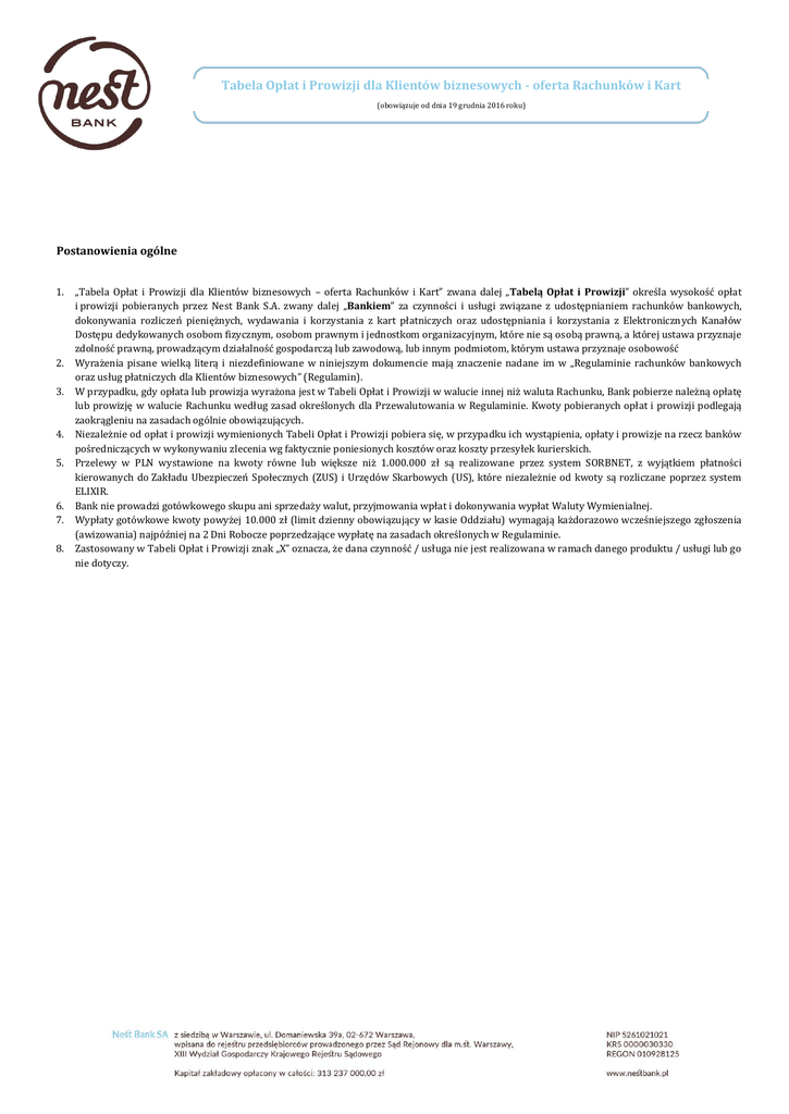 Tabela Opłat i Prowizji dla Klientów biznesowych - oferta Rachunków i Kart (obowiązuje od dnia 19 grudnia 2016 roku) Postanowienia ogólne 1. 2. 3. 4. 5. 6. 7. 8. „Tabela Opłat i Prowizji dla Klientów biznesowych – oferta Rachunków i Kart” zwana dalej „Tabelą Opłat i Prowizji” określa wysokość opłat i prowizji pobieranych przez Nest Bank S.A. zwany dalej „Bankiem” za czynności i usługi związane z udostępnianiem rachunków bankowych, dokonywania rozliczeń pieniężnych, wydawania i korzystania z kart płatniczych oraz udostępniania i korzystania z Elektronicznych Kanałów Dostępu dedykowanych osobom fizycznym, osobom prawnym i jednostkom organizacyjnym, które nie są osobą prawną, a której ustawa przyznaje zdolność prawną, prowadzącym działalność gospodarczą lub zawodową, lub innym podmiotom, którym ustawa przyznaje osobowość Wyrażenia pisane wielką literą i niezdefiniowane w niniejszym dokumencie mają znaczenie nadane im w „Regulaminie rachunków bankowych oraz usług płatniczych dla Klientów biznesowych” (Regulamin). W przypadku, gdy opłata lub prowizja wyrażona jest w Tabeli Opłat i Prowizji w walucie innej niż waluta Rachunku, Bank pobierze należną opłatę lub prowizję w walucie Rachunku według zasad określonych dla Przewalutowania w Regulaminie. Kwoty pobieranych opłat i prowizji podlegają zaokrągleniu na zasadach ogólnie obowiązujących. Niezależnie od opłat i prowizji wymienionych Tabeli Opłat i Prowizji pobiera się, w przypadku ich wystąpienia, opłaty i prowizje na rzecz banków pośredniczących w wykonywaniu zlecenia wg faktycznie poniesionych kosztów oraz koszty przesyłek kurierskich. Przelewy w PLN wystawione na kwoty równe lub większe niż 1.000.000 zł są realizowane przez system SORBNET, z wyjątkiem płatności kierowanych do Zakładu Ubezpieczeń Społecznych (ZUS) i Urzędów Skarbowych (US), które niezależnie od kwoty są rozliczane poprzez system ELIXIR. Bank nie prowadzi gotówkowego skupu ani sprzedaży walut, przyjmowania wpłat i dokonywania wypłat Waluty Wymienialnej. Wypłaty gotówkowe kwoty powyżej 10.000 zł (limit dzienny obowiązujący w kasie Oddziału) wymagają każdorazowo wcześniejszego zgłoszenia (awizowania) najpóźniej na 2 Dni Robocze poprzedzające wypłatę na zasadach określonych w Regulaminie. Zastosowany w Tabeli Opłat i Prowizji znak „X” oznacza, że dana czynność / usługa nie jest realizowana w ramach danego produktu / usługi lub go nie dotyczy. Rozdział 1 Rachunki rozliczeniowe 1.1 Rachunki rozliczeniowe w złotych polskich Lp. 1. 2. 3. Rodzaj czynności / usługi Otwarcie rachunku Prowadzenie rachunku 1) prowadzenie pierwszego rachunku 2) prowadzenie każdego kolejnego rachunku Elektroniczne Kanały Dostępu 1) abonament za użytkowanie 2) wygenerowanie Kodu SMS Tryb pobierania BIZnest Konto jednorazowo bez opłat miesięcznie miesięcznie bez opłat bez opłat miesięcznie każdorazowo bez opłat bez opłat 1.2 Rachunki rozliczeniowe w Walutach Wymienialnych BIZnest Konto Waluta Lp. 1. 2. 3. 4. Rodzaj czynności / usługi Otwarcie rachunku Prowadzenie rachunku Elektroniczne Kanały Dostępu 1) abonament za użytkowanie 2) wysyłka Kodu SMS Usługa korzystnych przewalutowań 1) aktywacja usługi1 2) opłata za korzystanie z usługi1 3) odwołanie usługi Tryb pobierania jednorazowo miesięcznie bez opłat bez opłat bez opłat bez opłat bez opłat bez opłat pozostałe Waluty Wymienialne bez opłat bez opłat miesięcznie każdorazowo bez opłat bez opłat bez opłat bez opłat bez opłat bez opłat bez opłat bez opłat jednorazowo miesięcznie jednorazowo 1 EUR 1 EUR bez opłat 1,3 USD 1,3 USD bez opłat 0,8 GBP 0,8 GBP bez opłat 5 zł 5 zł bez opłat Tryb pobierania BIZnest Oszczędności jednorazowo miesięcznie bez opłat bez opłat EUR USD GBP 1.3 Rachunki lokacyjne Lp. 1. 2. 3. 4. 5. 6. Rodzaj czynności / usługi Otwarcie rachunku Prowadzenie rachunku Realizacja przelewu na rachunek w Banku: 1) pierwszy przelew w miesiącu kalendarzowym 2) każdy kolejny przelew w miesiącu kalendarzowym Realizacja przelewu na rachunek w innym banku (bez względu na kanał realizacji) Zlecenie stałe 1) Zdefiniowanie / modyfikacja / odwołanie zlecenia 2) Realizacja Wyciągi od każdego przelewu od każdego przelewu od każdego przelewu BIZnet BIZnet Walutowe Walutowe Oszczędności Oszczędności EUR USD bez opłat bez opłat bez opłat bez opłat bez opłat bez opłat 5 zł 1 EUR wg stawek określonych w rozdziale 2 pkt 3.2 za każdą zmianę od każdego zlecenia 5 zł 1 EUR 5 zł 1 EUR wg stawek określonych w rozdziale 2 pkt 6 za każdy wyciąg BIZnet Walutowe Oszczędności GBP bez opłat bez opłat bez opłat 1,3 USD bez opłat 0,8 GBP X X X X X X X X X X Rozdział 2 Zlecenia płatnicze i inne usługi z Rachunków rozliczeniowych Lp. 1. 2. 3. Rodzaj czynności / usługi Wpłaty gotówkowe w złotych polskich 1) na rachunki prowadzone przez Bank a) w Oddziale w banknotach b) w Oddziale w bilonie2 c) we wpłatomacie sieci Euronet3 2) na rachunki prowadzone w innych bankach 3) na rachunek lokaty terminowej Wypłaty gotówkowe w złotych polskich 1) awizowane i niewymagające awizowania 2) nieawizowane (w przypadku możliwości jej wykonania) 4 3) niepodjęcie gotówki w uzgodnionym terminie Realizacja przelewu 1) na rachunek w Banku (bez względu na kanał realizacji) 2) na rachunek w innym banku zleconego w Oddziale lub poprzez Serwis Telefoniczny a) natychmiastowy5 w złotych polskich b) do ZUS i US w złotych polskich c) krajowy (ELIXIR) w złotych polskich d) przelew europejski (SEPA) w EUR e) przelew zagraniczny (SWIFT) w walucie 3) na rachunek w innym banku zleconego przez Bankowość Internetową lub Mobilną a) natychmiastowy5 w złotych polskich b) do ZUS i US w złotych polskich c) przelew e-mail / SMS w złotych polskich Tryb pobierania rachunek w PLN rachunek w EUR rachunek w GBP / USD rachunek w pozostałych Walutach Wymienialn