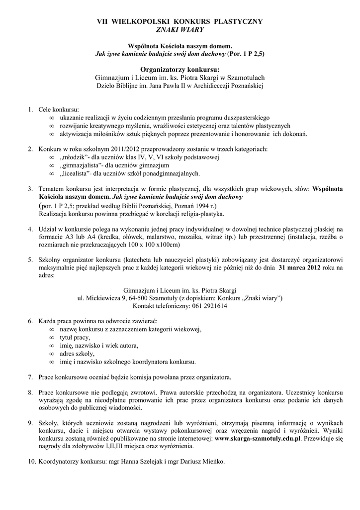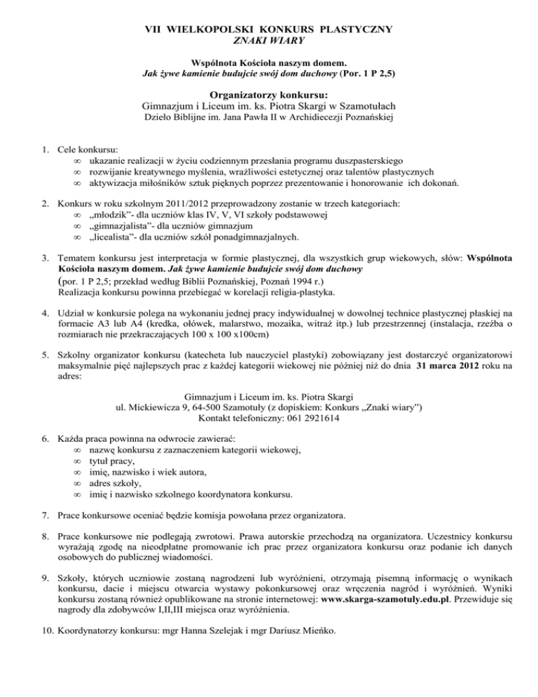 VII WIELKOPOLSKI KONKURS PLASTYCZNY ZNAKI WIARY Wspólnota Kościoła naszym domem. Jak żywe kamienie budujcie swój dom duchowy (Por. 1 P 2,5) Organizatorzy konkursu: Gimnazjum i Liceum im. ks. Piotra Skargi w Szamotułach Dzieło Biblijne im. Jana Pawła II w Archidiecezji Poznańskiej 1. Cele konkursu: • ukazanie realizacji w życiu codziennym przesłania programu duszpasterskiego • rozwijanie kreatywnego myślenia, wrażliwości estetycznej oraz talentów plastycznych • aktywizacja miłośników sztuk pięknych poprzez prezentowanie i honorowanie ich dokonań. 2. Konkurs w roku szkolnym 2011/2012 przeprowadzony zostanie w trzech kategoriach: • „młodzik”- dla uczniów klas IV, V, VI szkoły podstawowej • „gimnazjalista”- dla uczniów gimnazjum • „licealista”- dla uczniów szkół ponadgimnazjalnych. 3. Tematem konkursu jest interpretacja w formie plastycznej, dla wszystkich grup wiekowych, słów: Wspólnota Kościoła naszym domem. Jak żywe kamienie budujcie swój dom duchowy (por. 1 P 2,5; przekład według Biblii Poznańskiej, Poznań 1994 r.) Realizacja konkursu powinna przebiegać w korelacji religia-plastyka. 4. Udział w konkursie polega na wykonaniu jednej pracy indywidualnej w dowolnej technice plastycznej płaskiej na formacie A3 lub A4 (kredka, ołówek, malarstwo, mozaika, witraż itp.) lub przestrzennej (instalacja, rzeźba o rozmiarach nie przekraczających 100 x 100 x100cm) 5. Szkolny organizator konkursu (katecheta lub nauczyciel plastyki) zobowiązany jest dostarczyć organizatorowi maksymalnie pięć najlepszych prac z każdej kategorii wiekowej nie później niż do dnia 31 marca 2012 roku na adres: Gimnazjum i Liceum im. ks. Piotra Skargi ul. Mickiewicza 9, 64-500 Szamotuły (z dopiskiem: Konkurs „Znaki wiary”) Kontakt telefoniczny: 061 2921614 6. Każda praca powinna na odwrocie zawierać: • nazwę konkursu z zaznaczeniem kategorii wiekowej, • tytuł pracy, • imię, nazwisko i wiek autora, • adres szkoły, • imię i nazwisko szkolnego koordynatora konkursu. 7. Prace konkursowe oceniać będzie komisja powołana przez organizatora. 8. Prace konkursowe nie podlegają zwrotowi. Prawa autorskie przechodzą na organizatora. Uczestnicy konkursu wyrażają zgodę na nieodpłatne promowanie ich prac przez organizatora konkursu oraz podanie ich danych osobowych do publicznej wiadomości. 9. Szkoły, których uczniowie zostaną nagrodzeni lub wyróżnieni, otrzymają pisemną informację o wynikach konkursu, dacie i miejscu otwarcia wystawy pokonkursowej oraz wręczenia nagród i wyróżnień. Wyniki konkursu zostaną również opublikowane na stronie internetowej: www.skarga-szamotuly.edu.pl. Przewiduje się nagrody dla zdobywców I,II,III miejsca oraz wyróżnienia. 10. Koordynatorzy konkursu: mgr Hanna Szelejak i mgr Dariusz Mieńko.