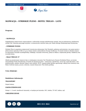 [email protected] Nasze biura 801 011 864 SŁOWACJA - STRBSKIE PLESO - HOTEL TRIGAN - LATO Program: - SŁOWACJA Najpiękniejsze miejscowości wypoczynkowe i uzdrowiska naszego południowego sąsiada, leżą po malowniczej, południowej stronie Tatr. Słowacja przyciąga turystów i wczasowiczów zarówno zimą, jak i latem oferując doskonałą bazę turystyczną. - STRBSKIE PLESO Strbskie Pleso to popularna miejscowość turystyczno-rekreacyjna Tatr Wysokich, położona nad jeziorem o tej samej nazwie i jednocześnie najwyżej (1346 m n.p.m.) leżące miasto uzdrowiskowe Europy Środkowej. W sezonie letnim to idealne miejsce na uprawianie turystyki wysokogórskiej, trekkingu, turystyki rowerowej, jazdę na rolkach, wspinaczkę górską i skałkową oraz na jazdę konną. - Hotel TRIGAN 3* Obiekt po gruntownym remoncie leży w atrakcyjnym otoczeniu Tatr Wysokich przy Nowym Strebskim Plesie, na terenie Tatrzańskiego Parku Narodowego. W hotelu do dyspozycji gości – restauracja, aperitif bar, nocny bar, kącik dla dzieci, sala konferencyjna, salonik, siłownia, bilard, tenis stołowy, Wi-Fi, wypożyczalnia sprzętu sportowego, odkryty kort tenisowy oraz Relax Centrum (sauna, jacuzzi, solarium, masaże klasyczne). Przy hotelu parking. Cena obejmuje: Dodatkowe informacje: TRANSPORT Dojazd własny. ZAKWATEROWANIE Pokoje 1- i 2-osob. (możliwość dostawki), w każdym jest łazienka i WC, telefon, TV SAT, balkon, sejf. UBIEZPIECZENIE 801 011 864 logostour.pl [email protected] Nasze biura 801 011 864 Obowiązkowe Signal Iduna NW (7000 PLN), KL (15 000 EUR); dodatkowo płatne 25 PLN/osoba. EXTRA W CENIE 1 raz w turnusie wstęp do Wellness, dostęp do Wi-Fi, w okresie 27.06-01.09.16 – animacje dla wszystkich, 1 raz w turnusie wieczór muzyczny, tenis stołowy, plac zabaw dla dzieci, WYŻYWIENIE Śniadania i kolacje (bufet). Napoje do kolacji – płatne. TERMINY Turnusy tygodniowe od soboty do soboty w okresie od czerwca do września. CENY W PLN – od osoby w pokoju 2-osob., za turnus tygodniowy. WARUNKI PLATNOŚCI 30% zaliczki przy podpisaniu umowy, dopłata do 100% na 21 dni przed wyjazdem. ZNIŻKI Dziecko do 3 lat (bez świadczeń) - gratis, 1 dziecko do 8 lat (z 2 dorosłymi na dostawce) - gratis, dziecko 3-15 lat (na dostawce) - 50% zniżki ( 1 osoba dorosła + 2 dzieci), dziecko 3-15 lat (na łóżku) - 30% zniżki, dorosły (na dostawce) - 20% zniżki. DOPŁATY Pokój 1-osob. – bez dopłaty, 1 osoba w pokoju 2-osob. – 210 PLN opłata za zwierzęta – 10 EUR/noc płatne na miejscu w hotelu. UWAGA! Taksa klimatyczna płatna na miejscu 1 EUR/osoba/dzień. Terminy: 801 011 864 logostour.pl
