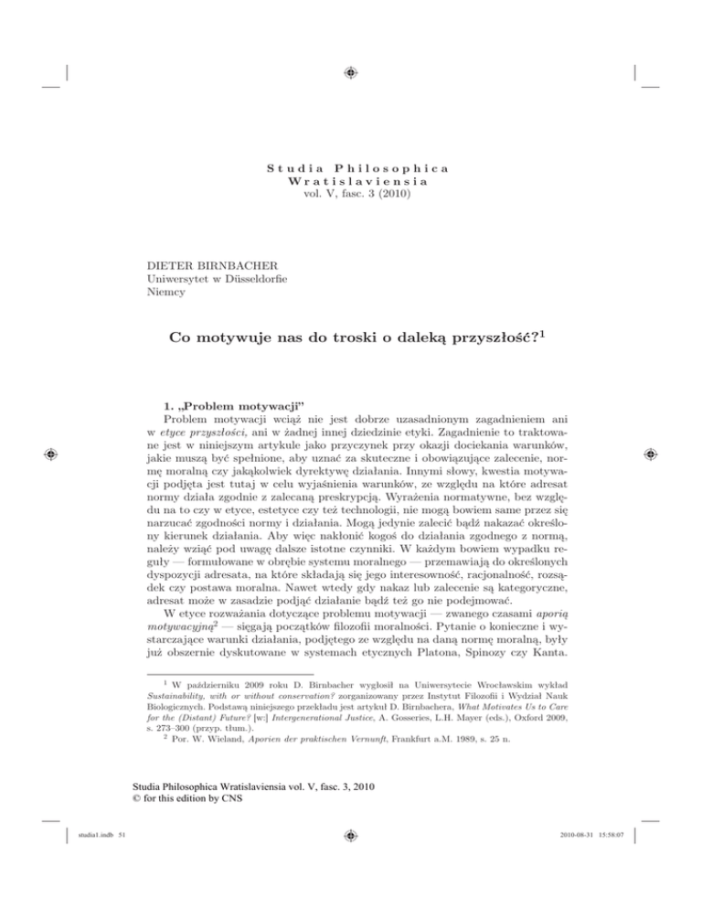 Studia Philosophica Wr a t i s l a v i e n s i a vol. V, fasc. 3 (2010) DIETER BIRNBACHER Uniwersytet w Düsseldorfie Niemcy Co motywuje nas do troski o daleką przyszłość ?1 1. „Problem motywacji” Problem motywacji wciąż nie jest dobrze uzasadnionym zagadnieniem ani w etyce przyszłości, ani w żadnej innej dziedzinie etyki. Zagadnienie to traktowane jest w niniejszym artykule jako przyczynek przy okazji dociekania warunków, jakie muszą być spełnione, aby uznać za skuteczne i obowiązujące zalecenie, normę moralną czy jakąkolwiek dyrektywę działania. Innymi słowy, kwestia motywacji podjęta jest tutaj w celu wyjaśnienia warunków, ze względu na które adresat normy działa zgodnie z zalecaną preskrypcją. Wyrażenia normatywne, bez względu na to czy w etyce, estetyce czy też technologii, nie mogą bowiem same przez się narzucać zgodności normy i działania. Mogą jedynie zalecić bądź nakazać określony kierunek działania. Aby więc nakłonić kogoś do działania zgodnego z normą, należy wziąć pod uwagę dalsze istotne czynniki. W każdym bowiem wypadku reguły — formułowane w obrębie systemu moralnego — przemawiają do określonych dyspozycji adresata, na które składają się jego interesowność, racjonalność, rozsądek czy postawa moralna. Nawet wtedy gdy nakaz lub zalecenie są kategoryczne, adresat może w zasadzie podjąć działanie bądź też go nie podejmować. W etyce rozważania dotyczące problemu motywacji — zwanego czasami aporią motywacyjną2 — sięgają początków filozofii moralności. Pytanie o konieczne i wystarczające warunki działania, podjętego ze względu na daną normę moralną, były już obszernie dyskutowane w systemach etycznych Platona, Spinozy czy Kanta. 1 W październiku 2009 roku D. Birnbacher wygłosił na Uniwersytecie Wrocławskim wykład Sustainability, with or without conservation? zorganizowany przez Instytut Filozofii i Wydział Nauk Biologicznych. Podstawą niniejszego przekładu jest artykuł D. Birnbachera, What Motivates Us to Care for the (Distant) Future? [w:] Intergenerational Justice, A. Gosseries, L.H. Mayer (eds.), Oxford 2009, s. 273–300 (przyp. tłum.). 2 Por. W. Wieland, Aporien der praktischen Vernunft, Frankfurt a.M. 1989, s. 25 n. Studia Philosophica Wratislaviensia vol. V, fasc. 3, 2010 © for this edition by CNS studia1.indb 51 2010-08-31 15:58:07 52 D. Birnbacher, Co motywuje nas do troski o daleką przyszłość? Wnioski tych badań odbijają się dzisiaj szerokim echem w debacie dotyczącej racji moralnej pomiędzy internalistami i eksternalistami. Internaliści, tacy jak na przykład B. Williams3, są zdania, iż posiadanie racji moralnej jest nieodłączne od bycia zmotywowanym do działania z nią zgodnego. Nie oznacza to wszakże, że czyn jest rzeczywiście dokonany. Z kolei eksternalista H.A. Prichard4 twierdzi, że posiadanie racji moralnej do działania i bycie zmotywowanym do podjęcia czynu są oddzielnymi zagadnieniami, w związku z czym przy wyjaśnianiu działania zgodnego z normą moralną, niezależnie od akceptacji tej normy, ważną rolę odgrywać będzie również mechanizm psychologiczny. Chociaż problem motywacji moralnej podejmowany jest najczęściej w związku z próbą wypełniania psychologicznej luki między akceptacją reguły i działaniem według niej, szczegółowe analizy pozwalają rozróżnić dwa kolejne kroki przejścia od akceptacji do działania, a mianowicie: akceptację, przyjęcie, zastosowanie oraz działanie. Wydaje się więc, po pierwsze, iż w moralności warunkiem koniecznym do działania zgodnego z regułą jest zaakceptowanie reguły przez adresata, co oznacza, że uważa ją za słuszną i uzasadnioną. Po drugie, adresat musi ją przyjąć jako zasadę, według której będzie kierować swoim działaniem oraz ją wcielać, tak jakby składała się na jego własną tożsamość. Po trzecie, podmiot musi zastosować ją do sytuacji właściwego rodzaju. Wiąże się to z rozpoznaniem okoliczności, dla których pewna reguła jest odpowiednia i co do których w wypadku reguł konsekwencjonalistycznych można oczekiwać podjęcia znacznych starań. Po czwarte wreszcie, podmiot musi działać tak jak reguła nakazuje lub — gdy reguła wymaga serii czynów — opracować strategię działania dotyczącą zarówno teraźniejszości, jak i przyszłości. Pozostaje jednak kwestią sporną, czy wszystkie cztery wspomniane czynniki motywacyjne są logicznie rozłączne. Nie jest chociażby jasne, czy różnica między akceptacją reguły — w sensie ocenienia jej jako uzasadnionej — a jej przyjęciem może być spójnie utrzymana. Psychologowie moralności nalegają na podkreślanie tej różnicy, ponieważ dane empiryczne wyraźnie sugerują, że zdolność do wydawania sądów moralnych jest w znacznej mierze niezależna od gotowości do działania zgodnie z regułą5. Z kolei na gruncie filozofii internaliści skupieni wokół problemu motywacji nie zgadzają się na dystynkcję akceptowania i przyjmowania reguł moralnych. Utrzymują oni, iż niemożliwe jest jednoczesne rozumowe akceptowanie normy bez włączenia jej — przynajmniej do pewnego stopnia — we własną postawę moralną. W optyce internalistów już samo akceptowanie reguł nie może być pojmowane wyłącznie jako akt poznawczy, ponieważ akceptowanie reguły zawiera w sobie przynajmniej element odniesienia emocjonalnego. Pozostaje jednak nierozstrzygnięte, czy reguła jest rzeczywiście przestrzegana, to znaczy, czy działanie następuje w zgodzie z regułą. Nie3 Por. na przykład B. Williams, Moral Luck. Philosophical Papers 1973–1980, Cambridge 1981, rozdz. 8. 4 Por. C.M. Korsogard, Skepticism about Practical Reason, ,,Journal of Philosophy” 83 (1986), s. 5–25. 5 Por. na przykład L. Montada, Moralische Gefühle [w:] Moral und Person, W. Nunner-Winkler, G. Noam (hrsg.), Frankfurt a.M. 1993, s. 259–277. Studia Philosophica Wratislaviensi